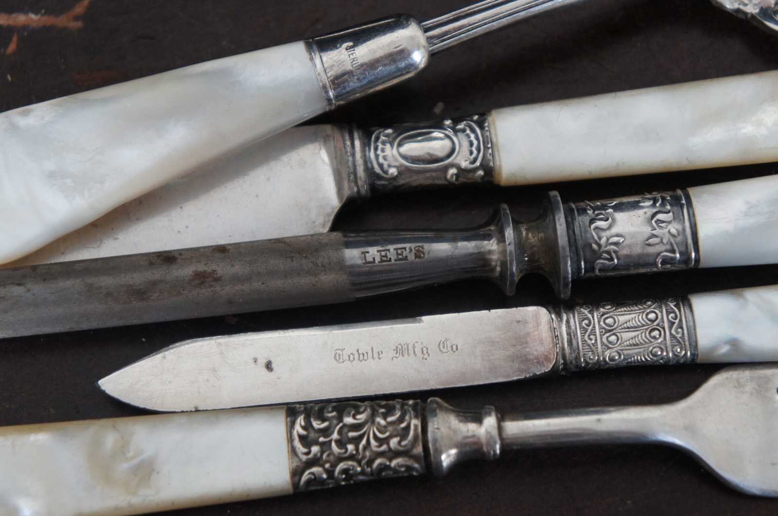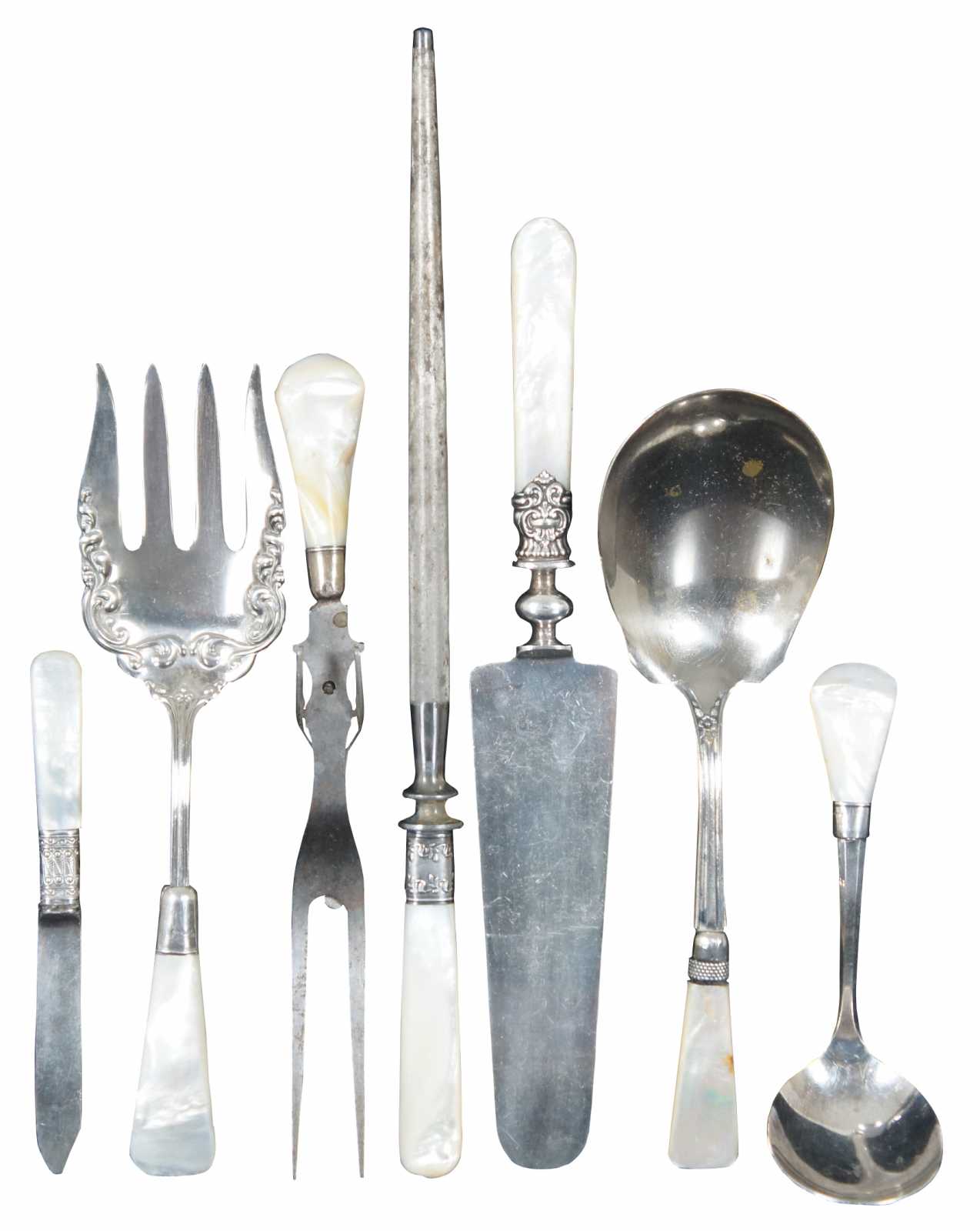Nineteen pieces of assorted Art Nouveau mother of pearl and sterling silver flatware and serving pieces; brands include Lee's, Landers Frary & Clark Etna Works, Meriden Cutlery Co 1855, Duhme & Co Cincinnati, Towle Mfg Co, DG&Co.