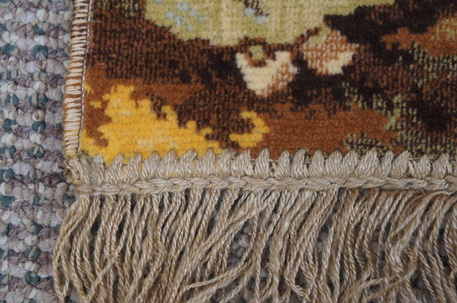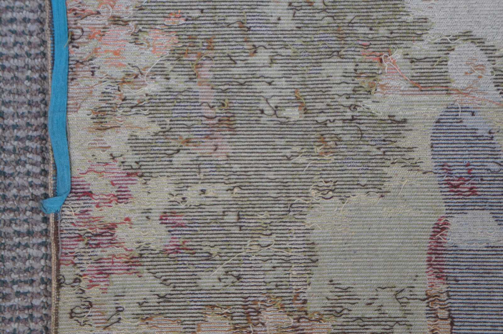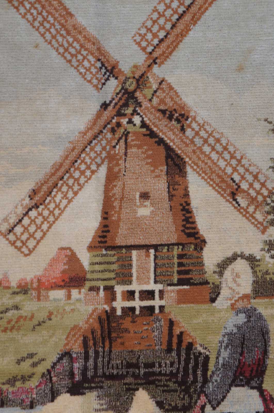 Vintage wall hanging tapestry with fringe showing a Dutch country landscape with milkmaid and other figures at a dock, with boats on a river, a windmill, church and homes scattering the landscape.