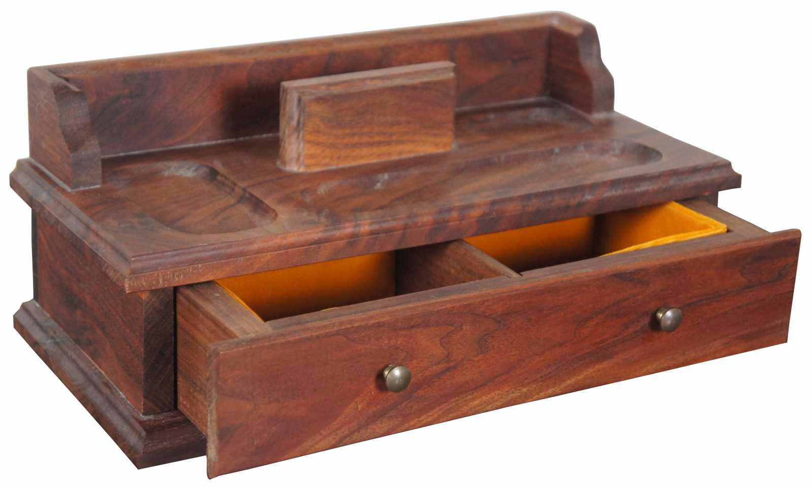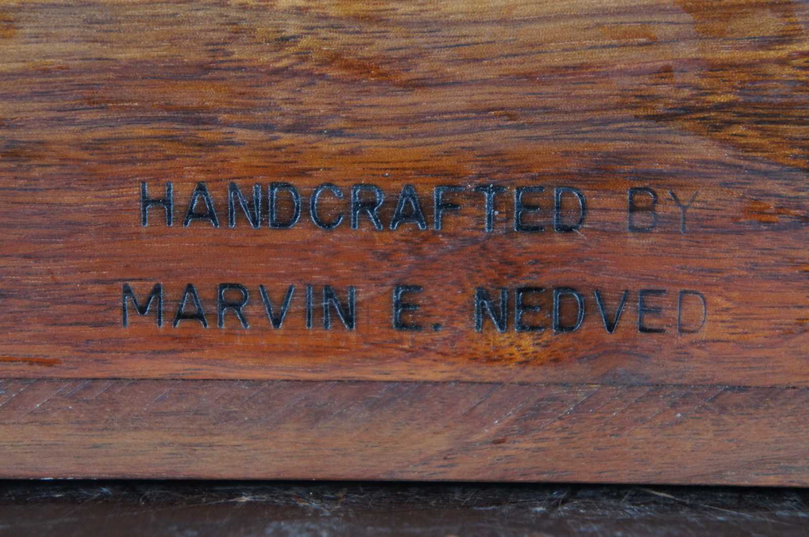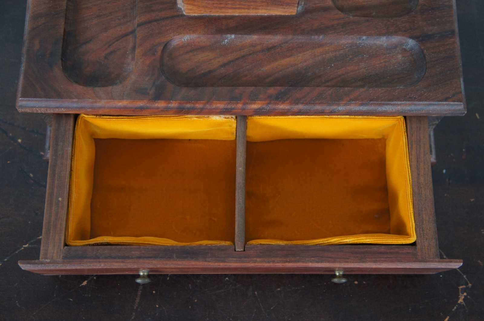 Vintage artisian or craftsman hand made walnut wood dresser top jewelry organizer with two velvet lined drawers, marked by the maker Marvin E. Nedved. Circa 1960s.
