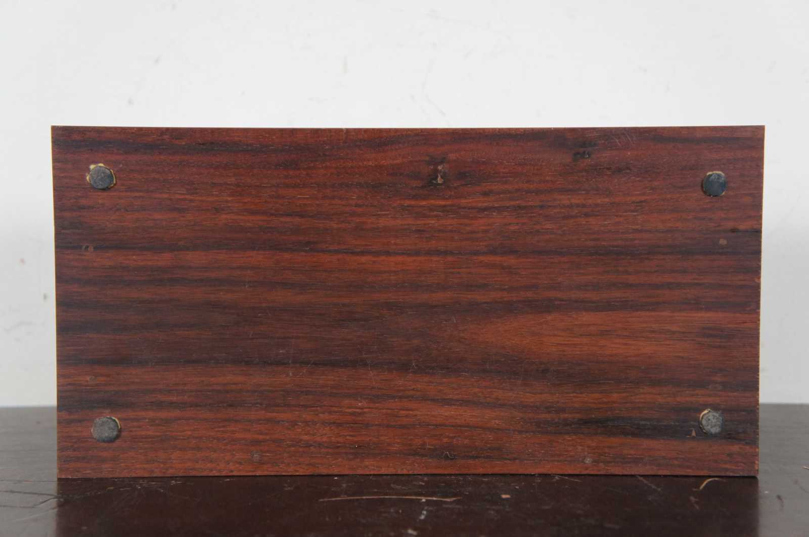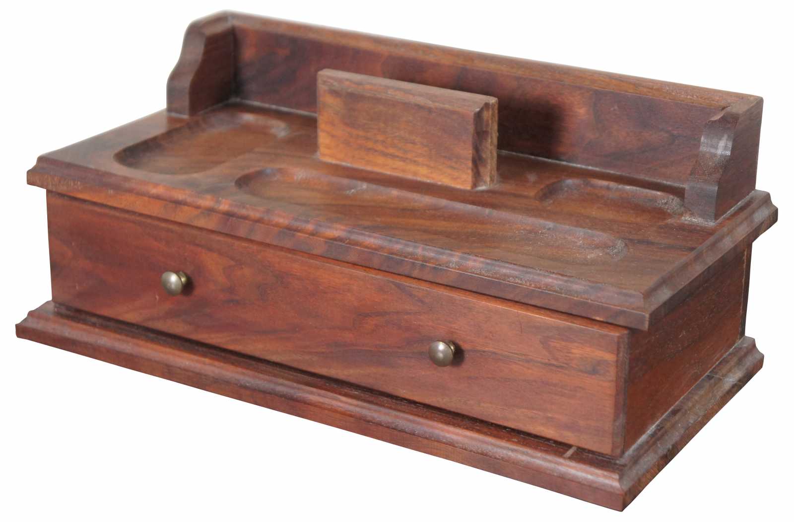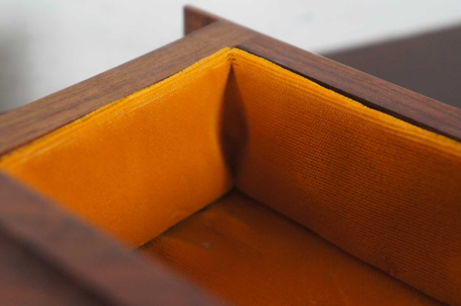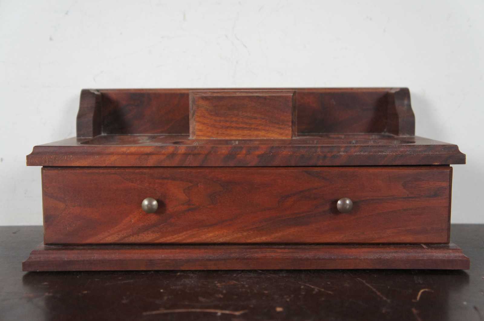 Vintage artisian or craftsman hand made walnut wood dresser top jewelry organizer with two velvet lined drawers, marked by the maker Marvin E. Nedved. Circa 1960s.