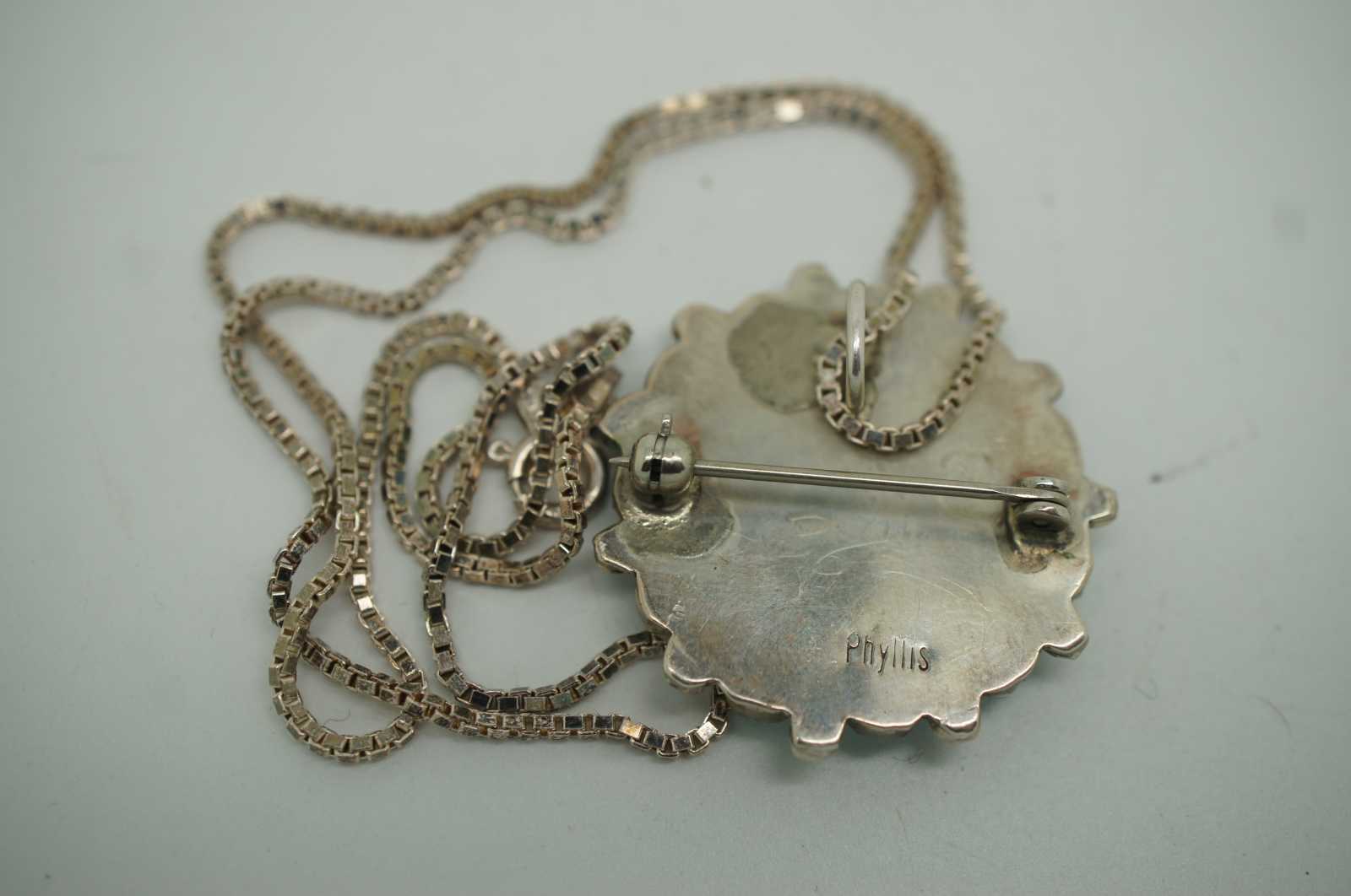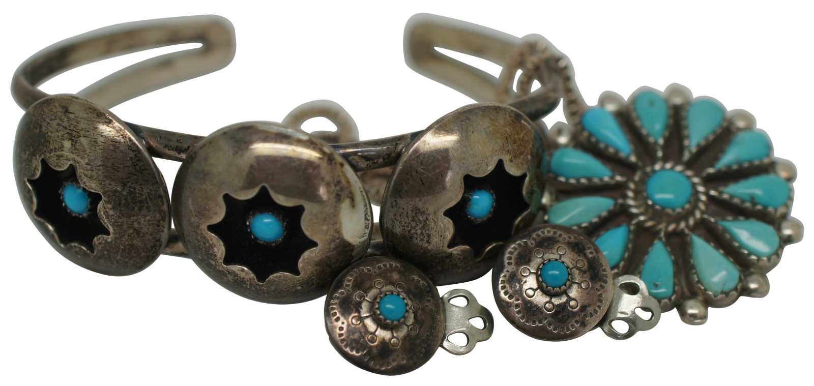 Vintage set of Native American / Navajo Zuni petit point turquoise sterling silver jewelry including a cuff bracelet, clip on earrings and a pendant / pin by artisan Phyllis Gilbert Ortega.