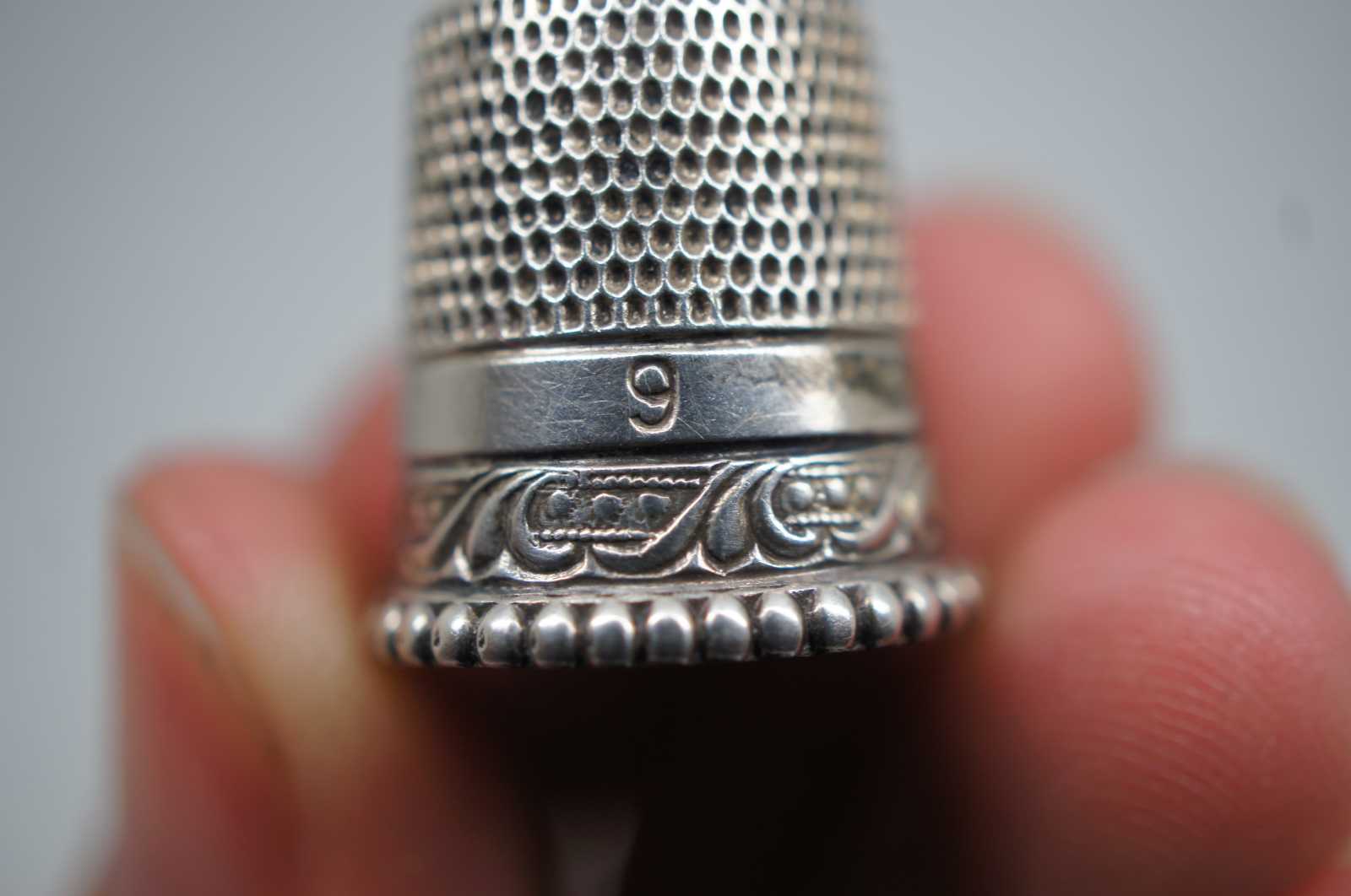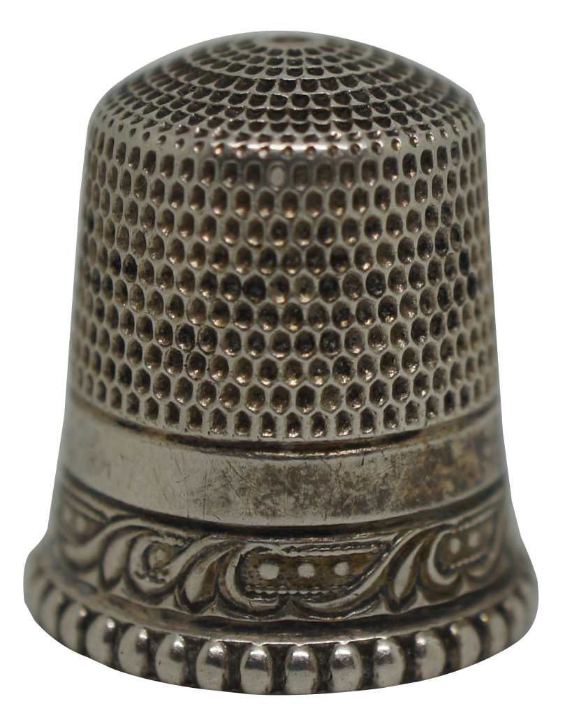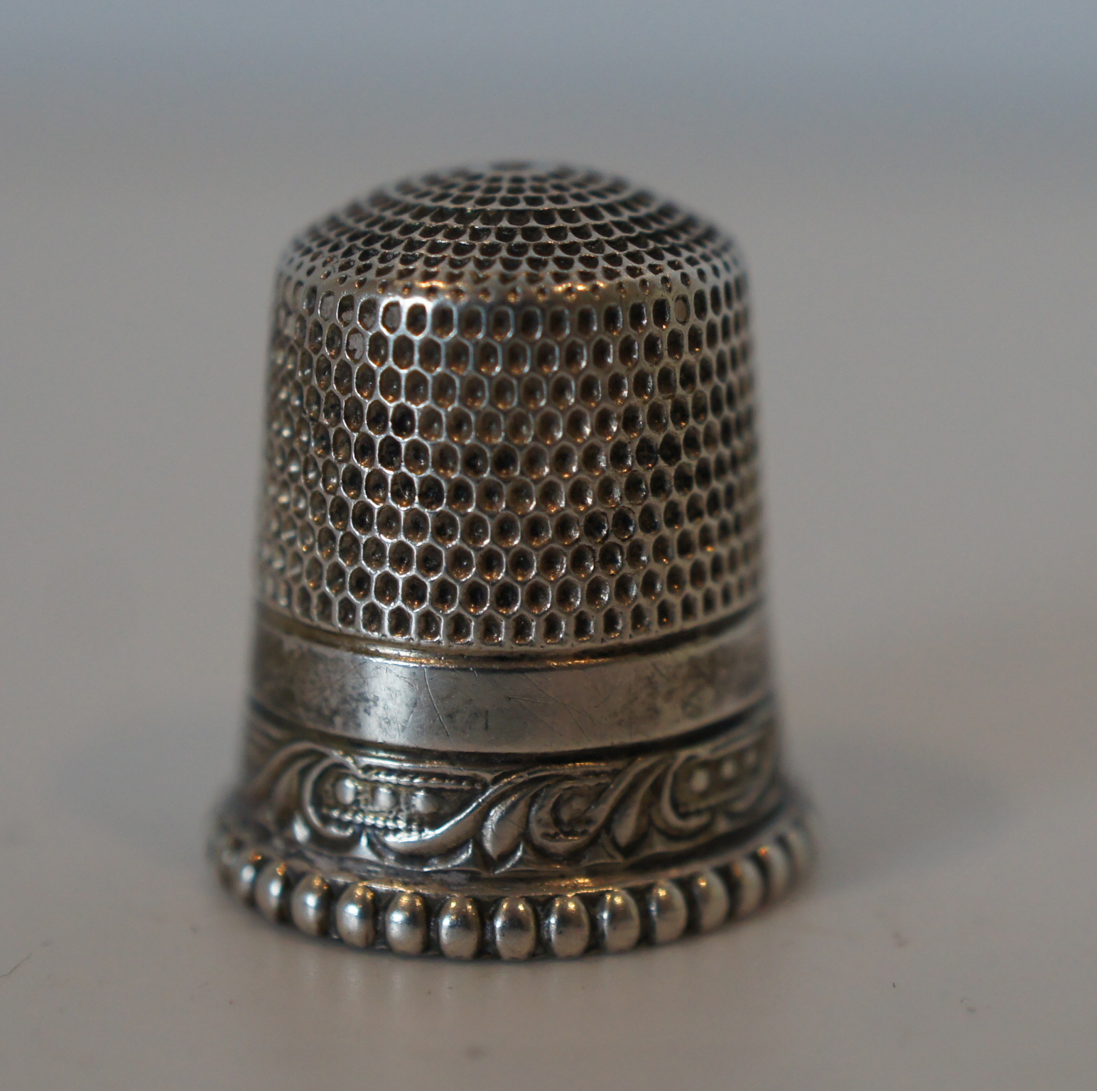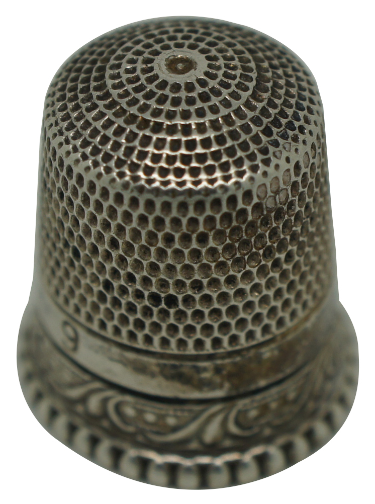 Antique sterling silver .925 thimble, size number 9, with a beaded edge topped with a band of swirling leaves. Marked inside cap with shield and S.