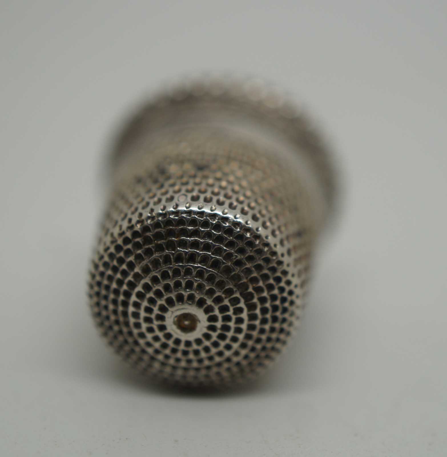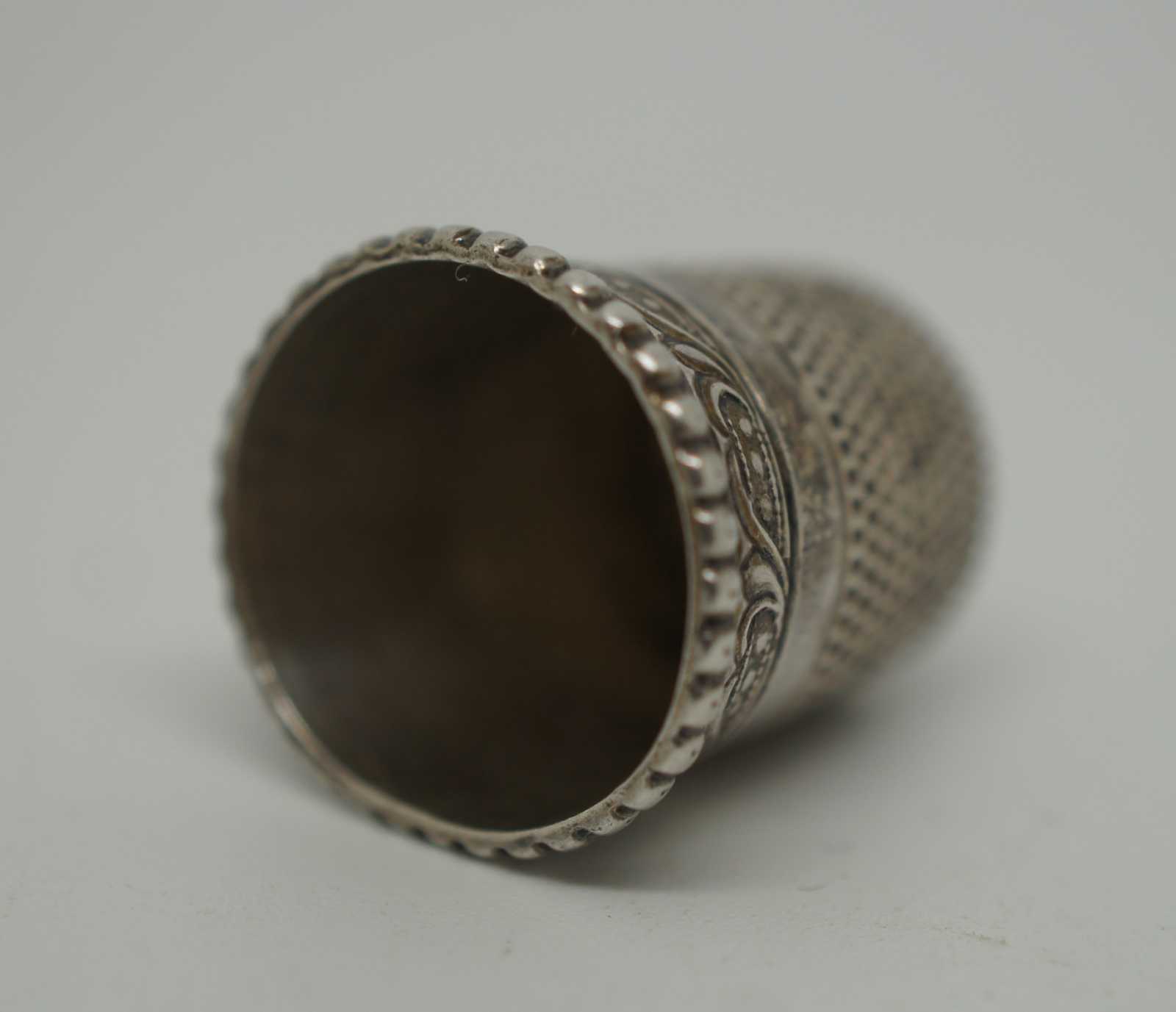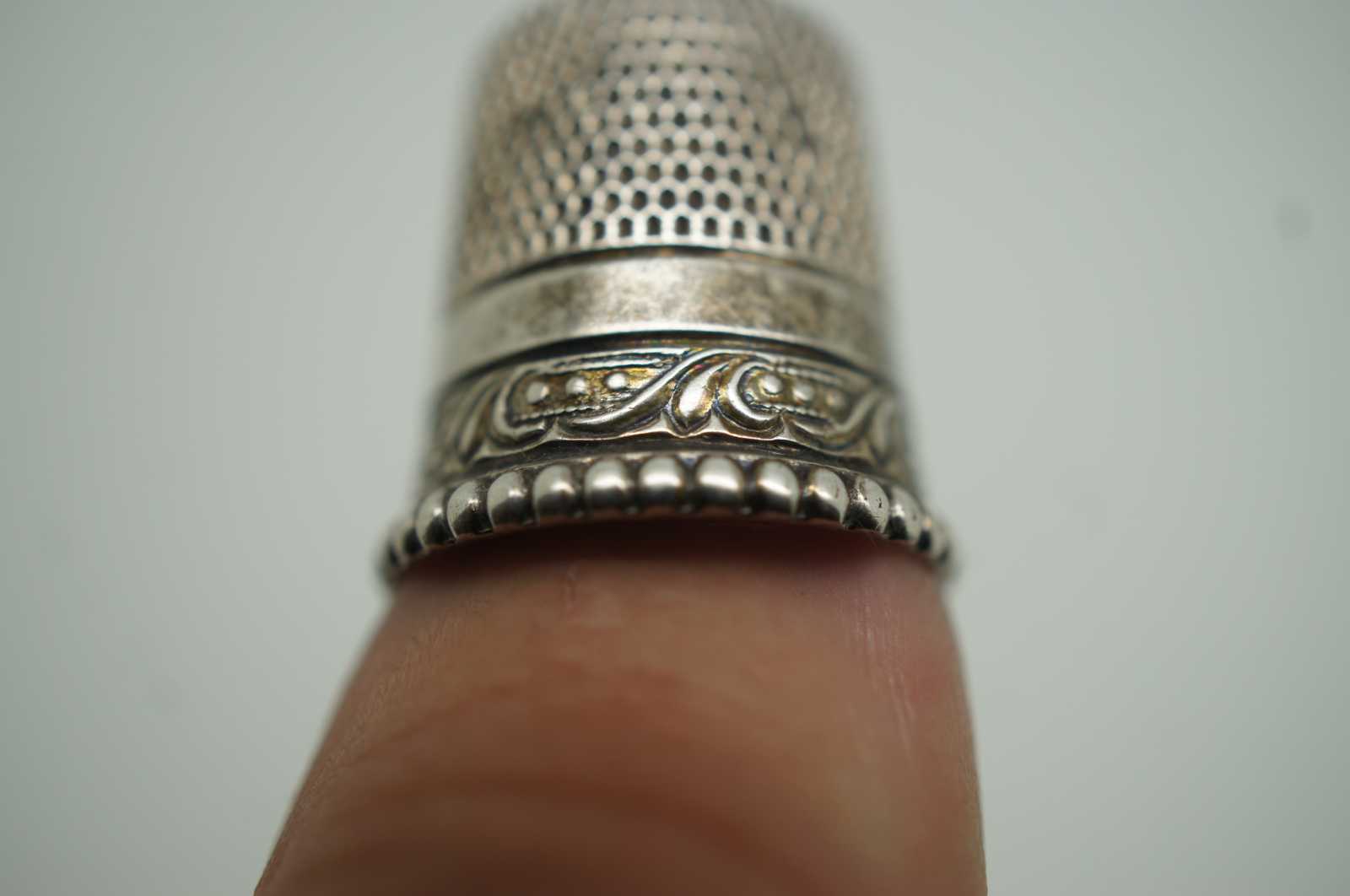 Antique sterling silver .925 thimble, size number 9, with a beaded edge topped with a band of swirling leaves. Marked inside cap with shield and S.
