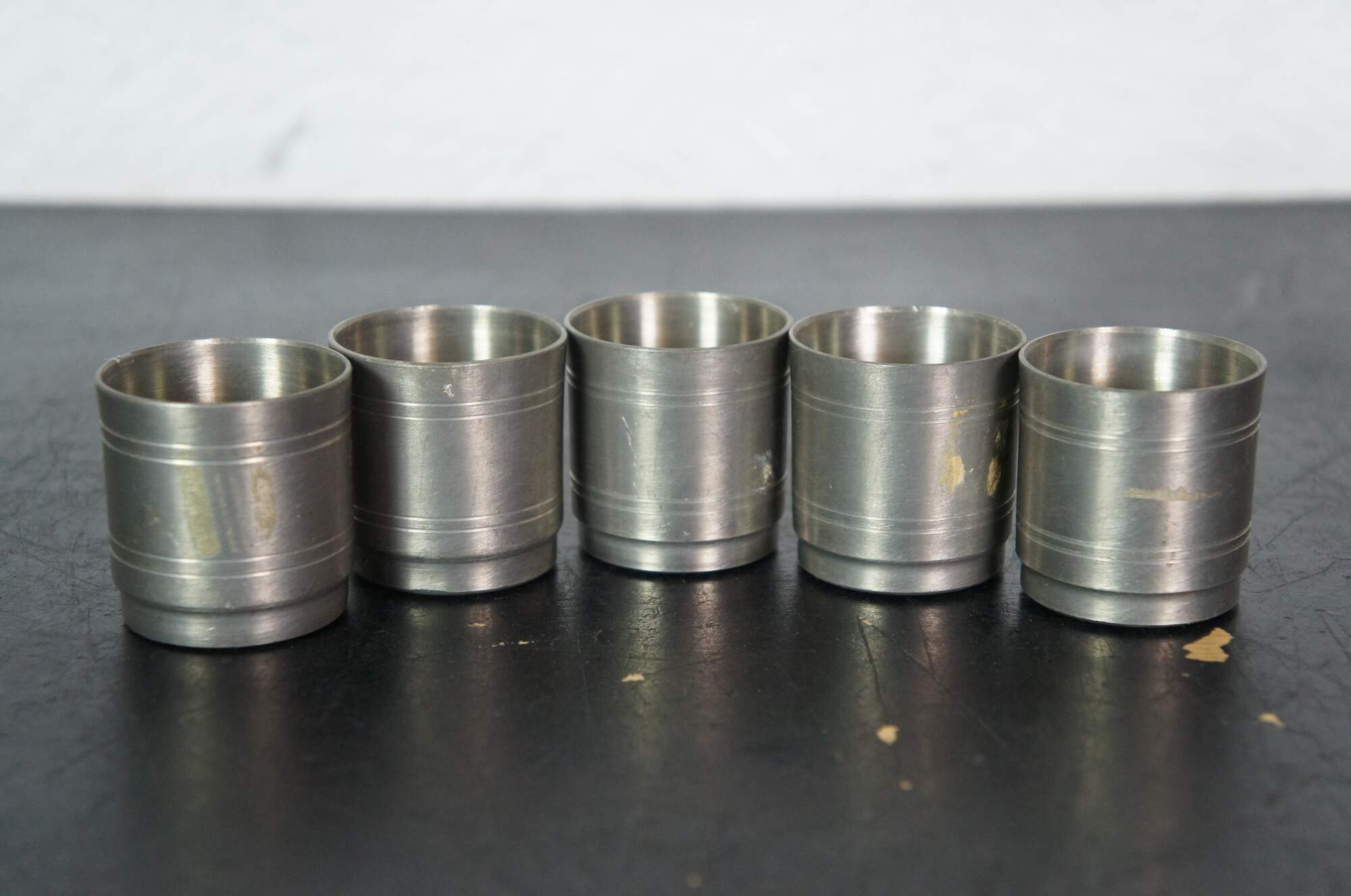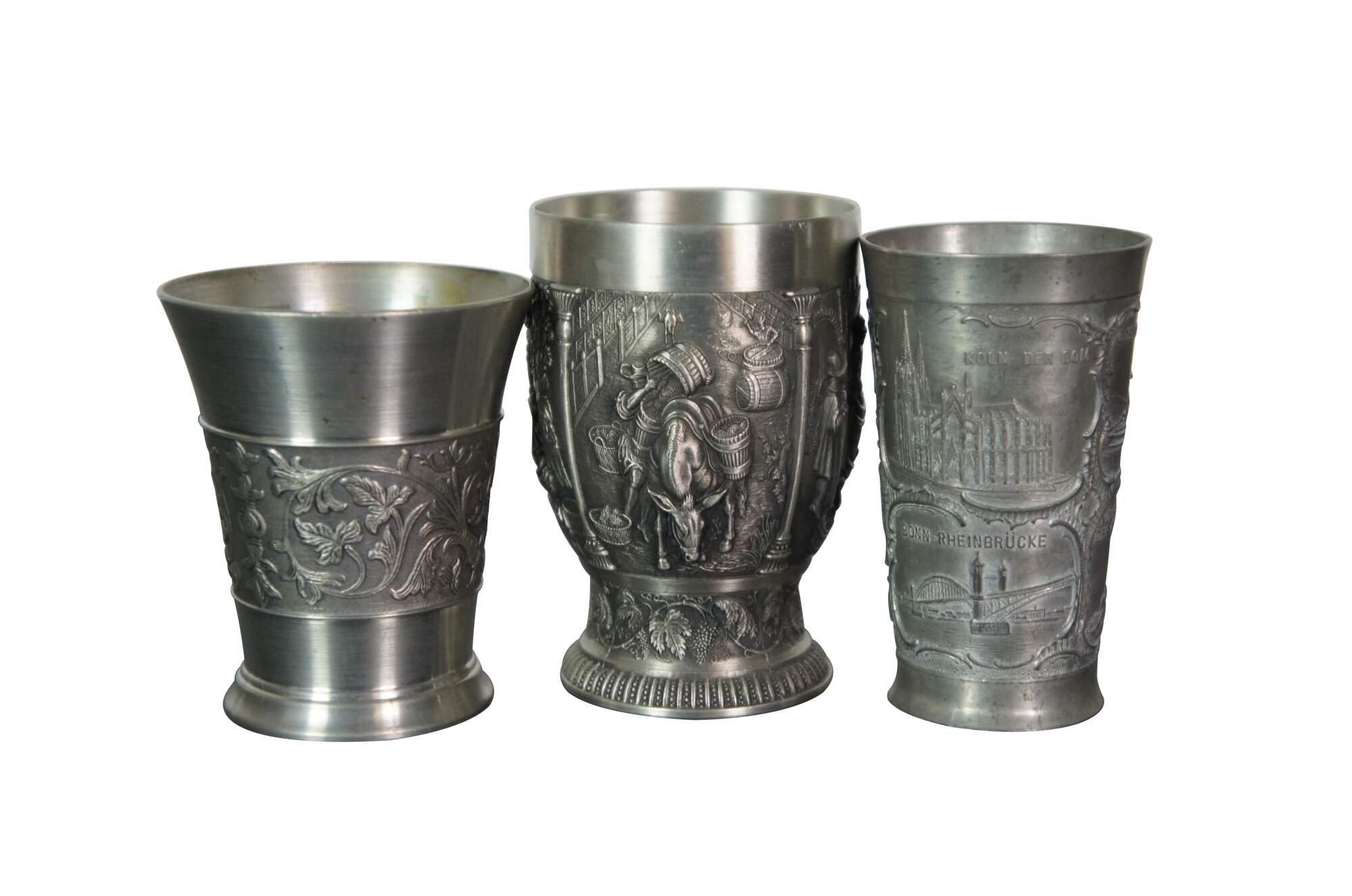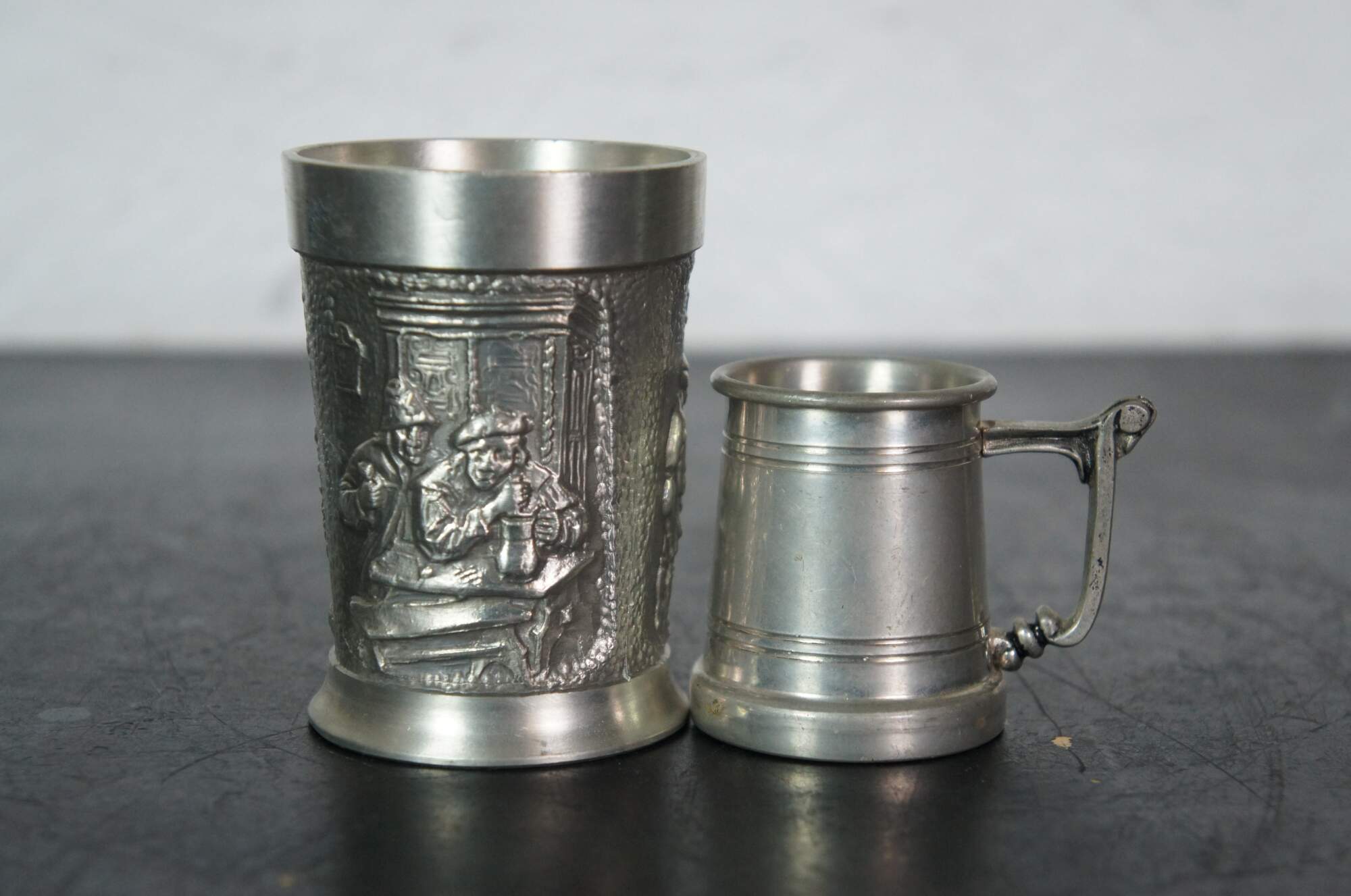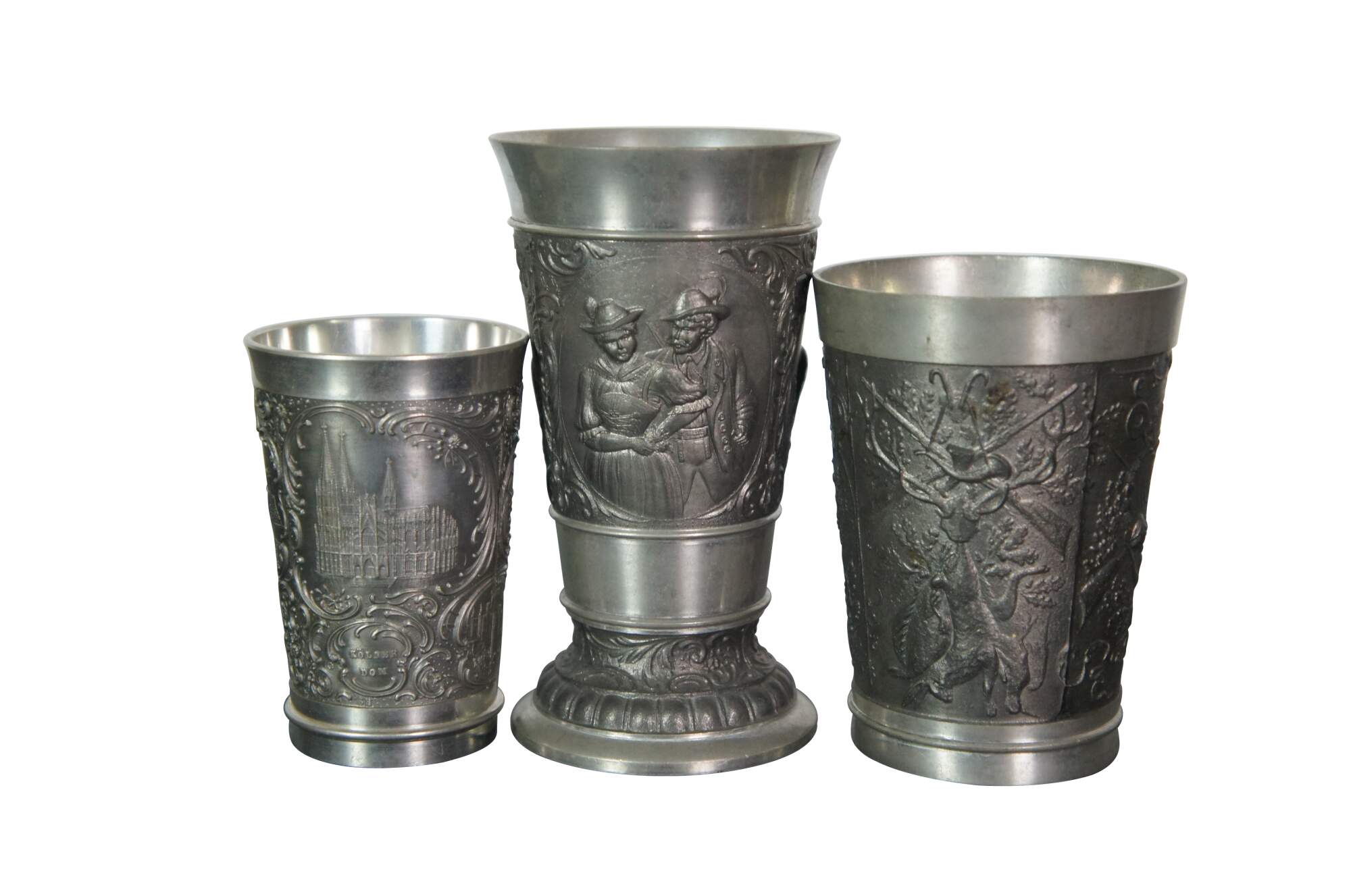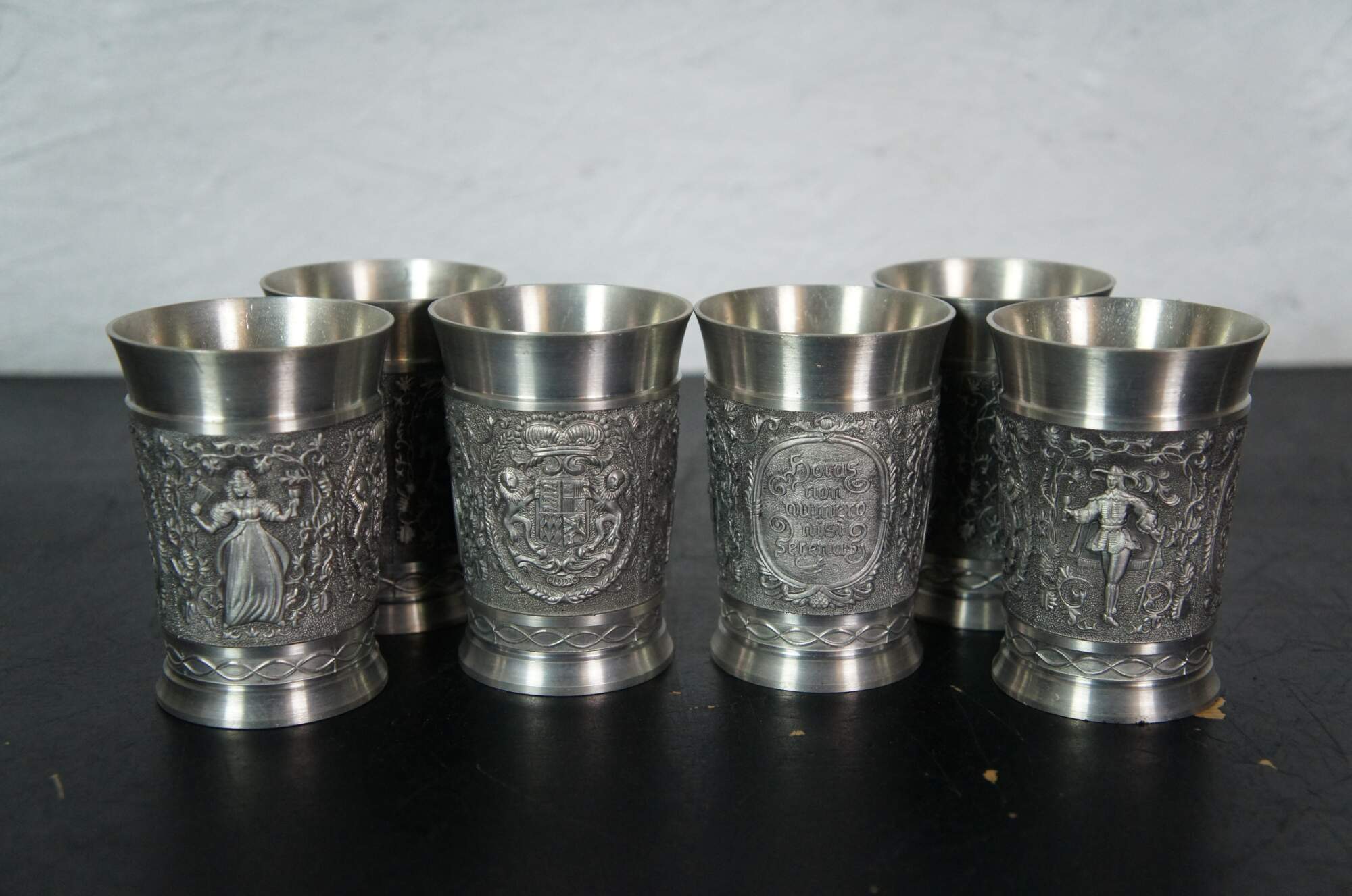 Lot of 29 vintage 20th century German pewter / zinn wine beer cups / shot glasses featuring a variety of sizes, embossed patterns and makers. Designs feature Bavarian / Black Forest tavern designs, heraldic crests, hunt themes, cherubs, olympics, and souvenir cityscapes.