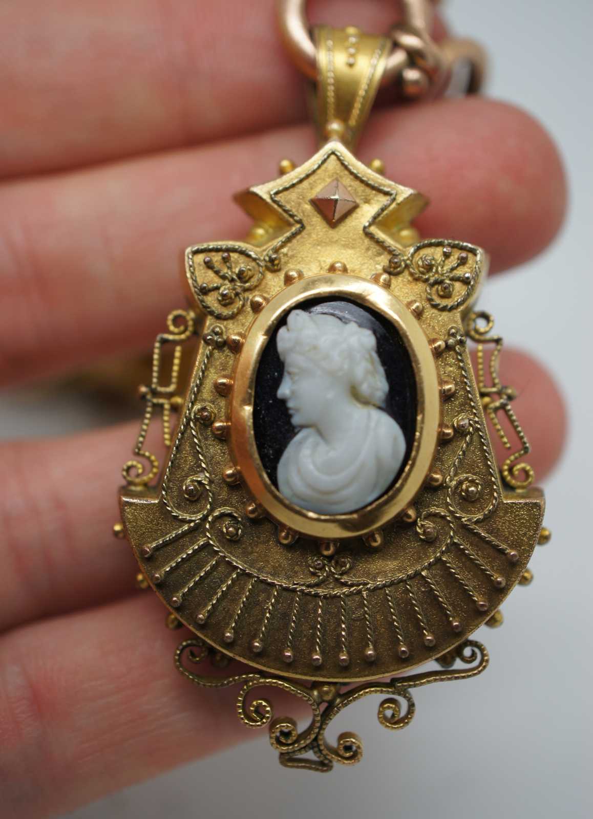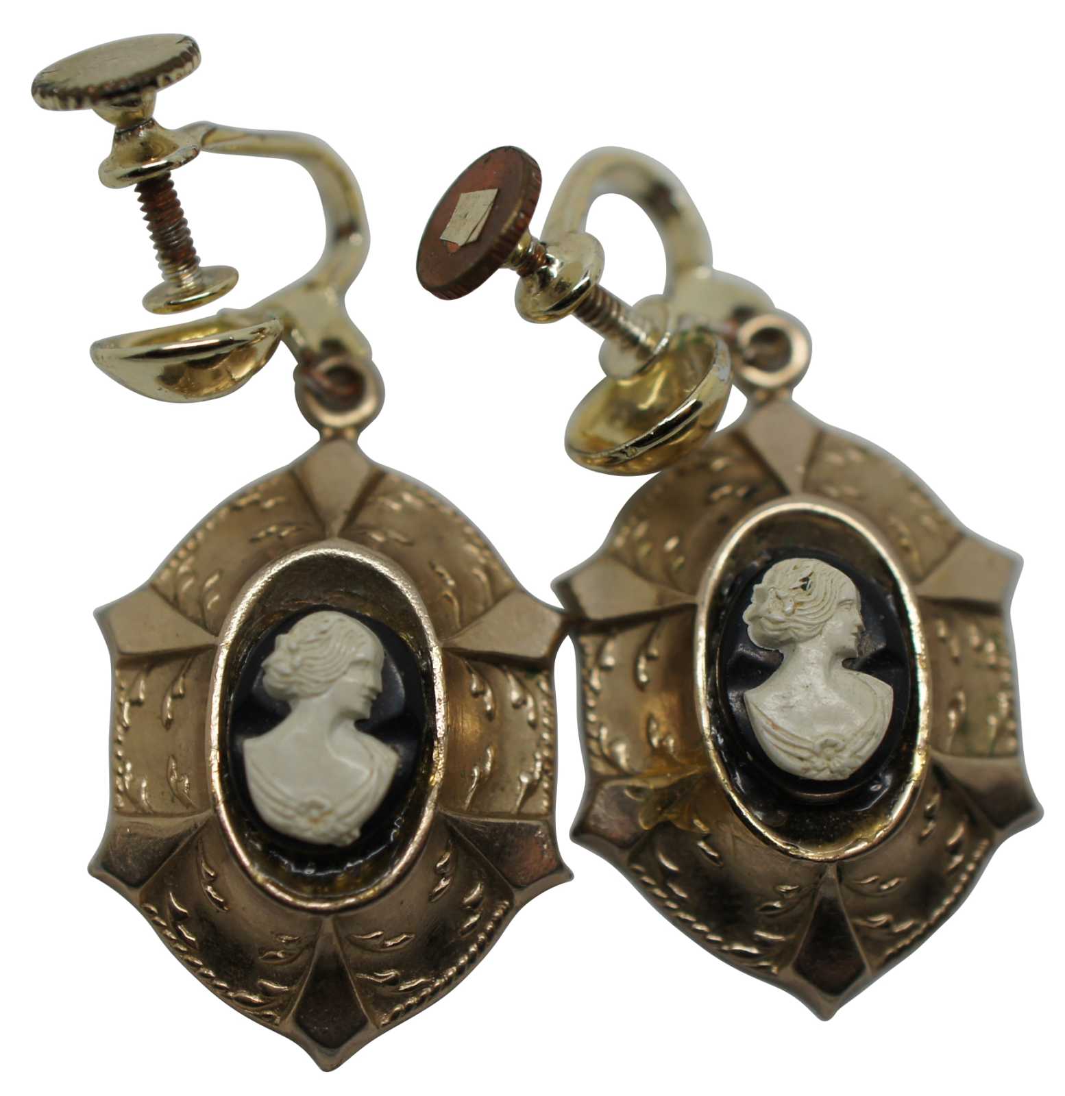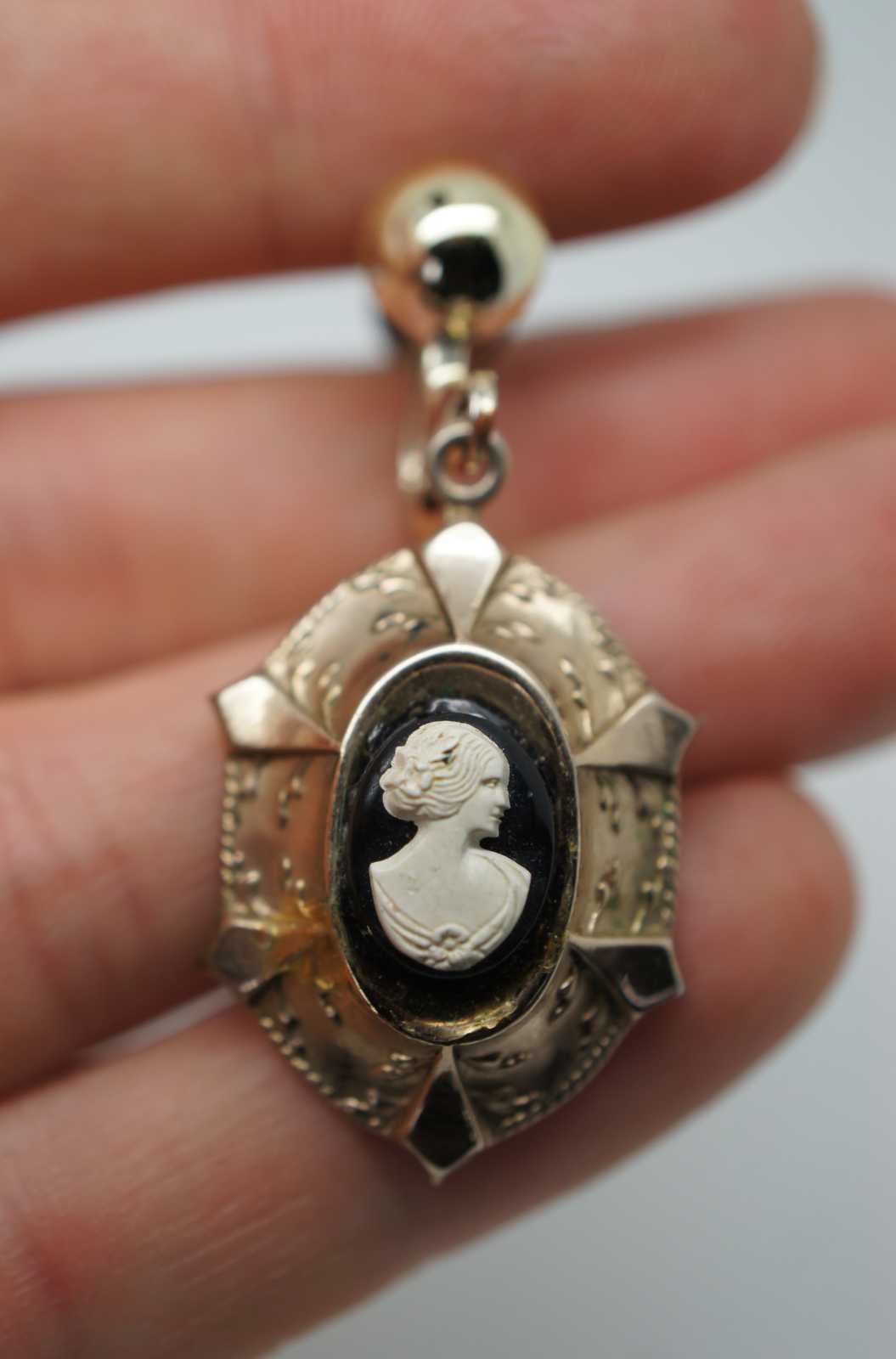 19th century Antique Victorian / Etruscan revival filigree pendant necklace and screw back earrings with inset black and white cameos showing female silhouettes.