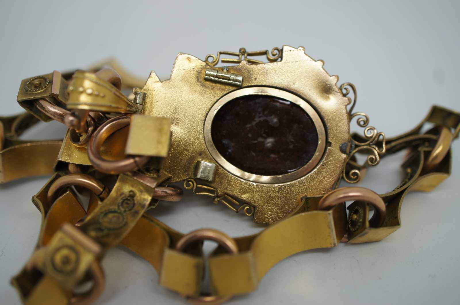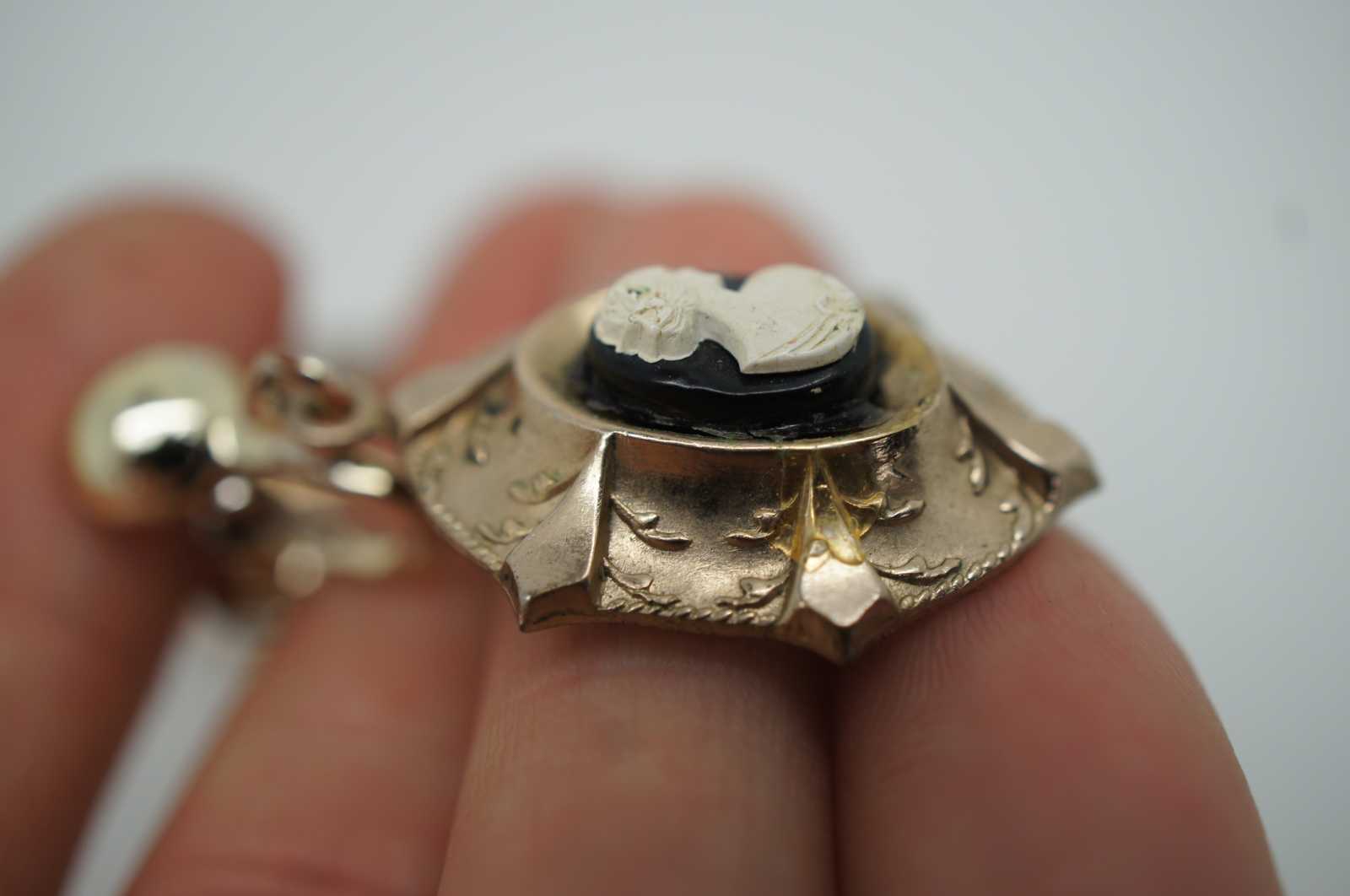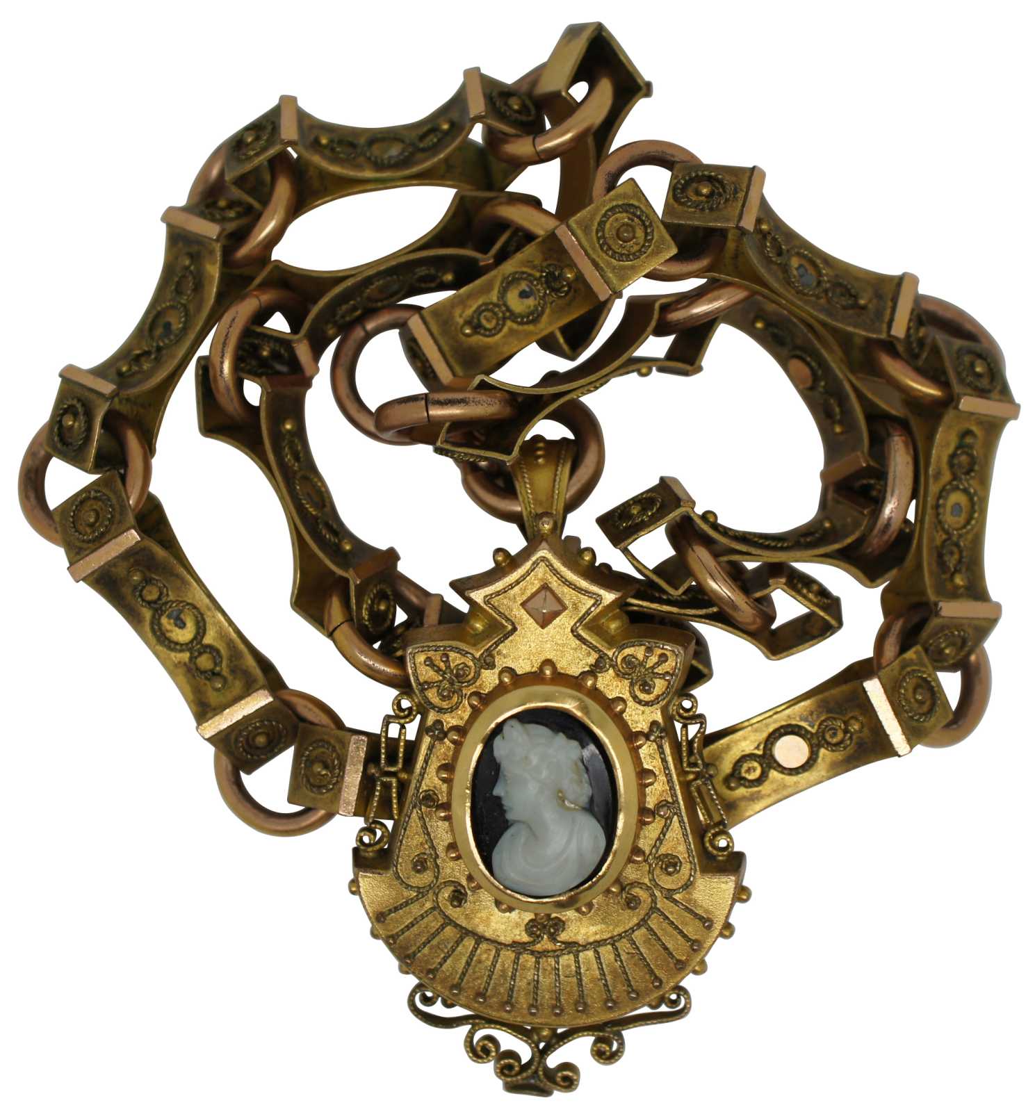 19th century Antique Victorian / Etruscan revival filigree pendant necklace and screw back earrings with inset black and white cameos showing female silhouettes.