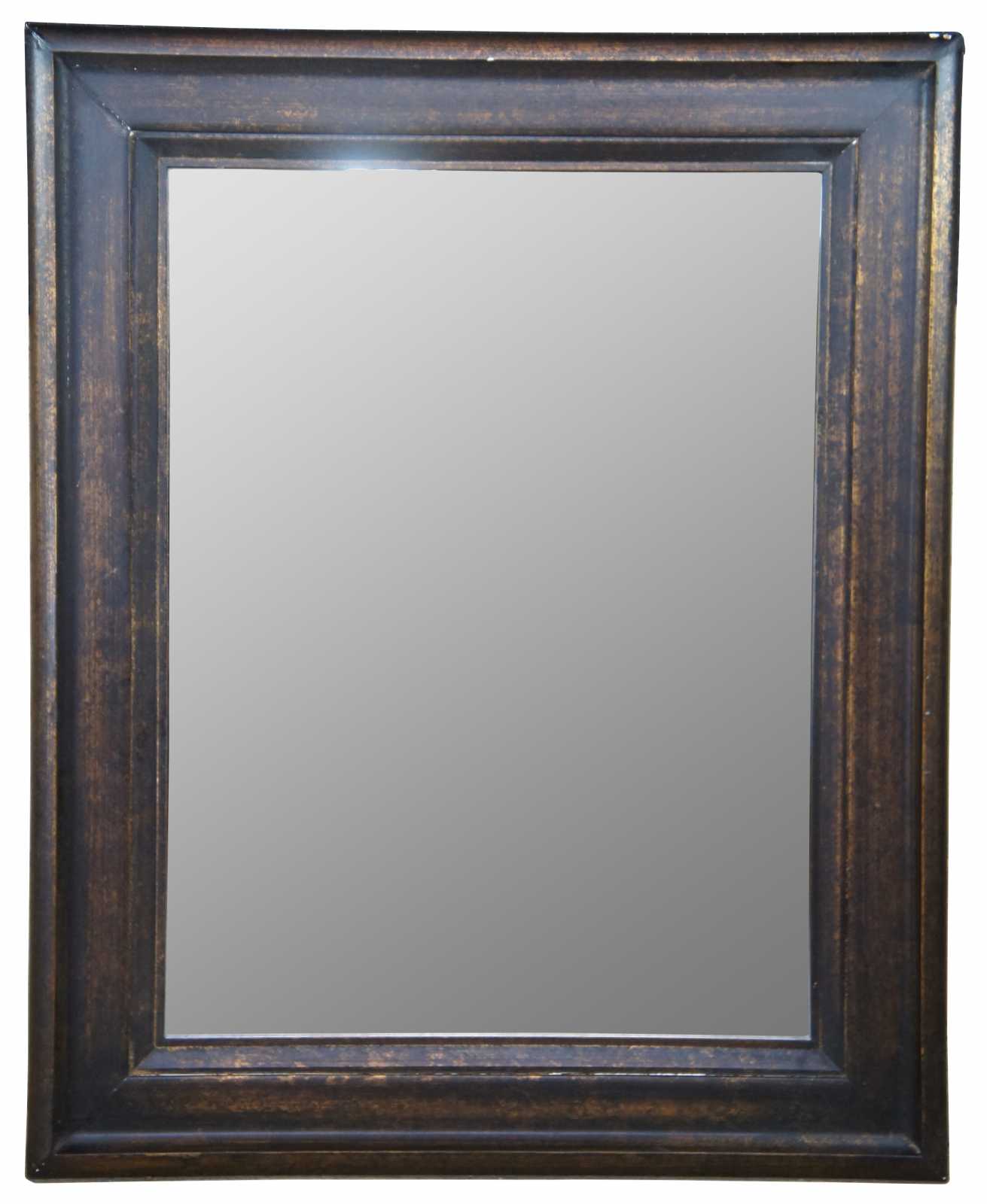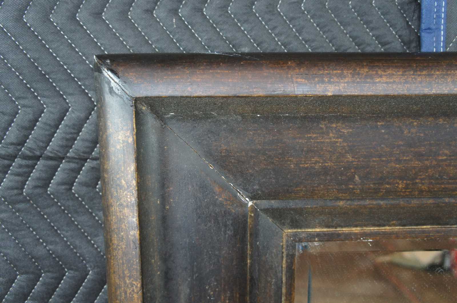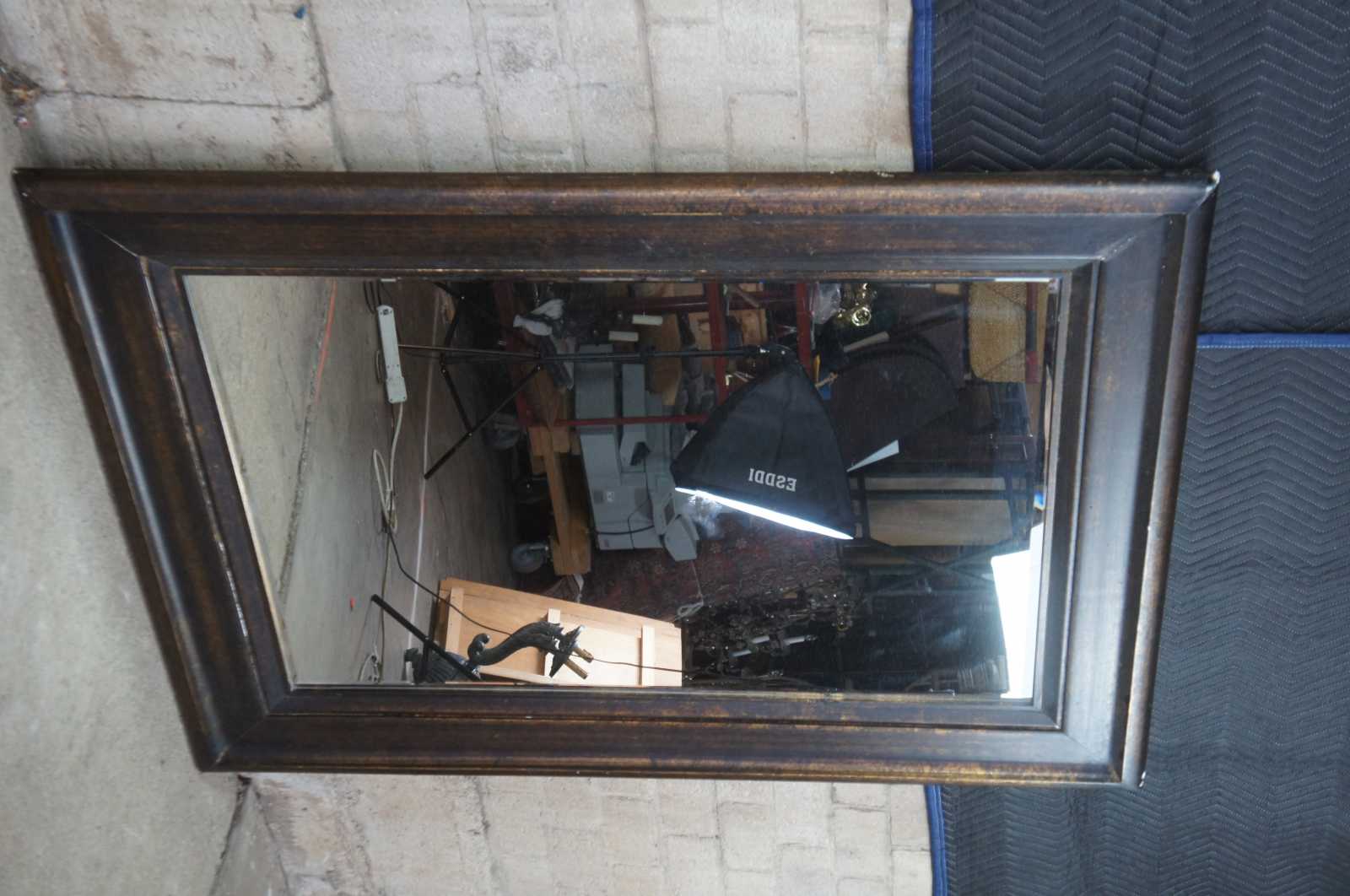 Oversized modern wall mirror. Great for user over a mantel/ along a wall. Black and gold mottled finish with beveled glass.