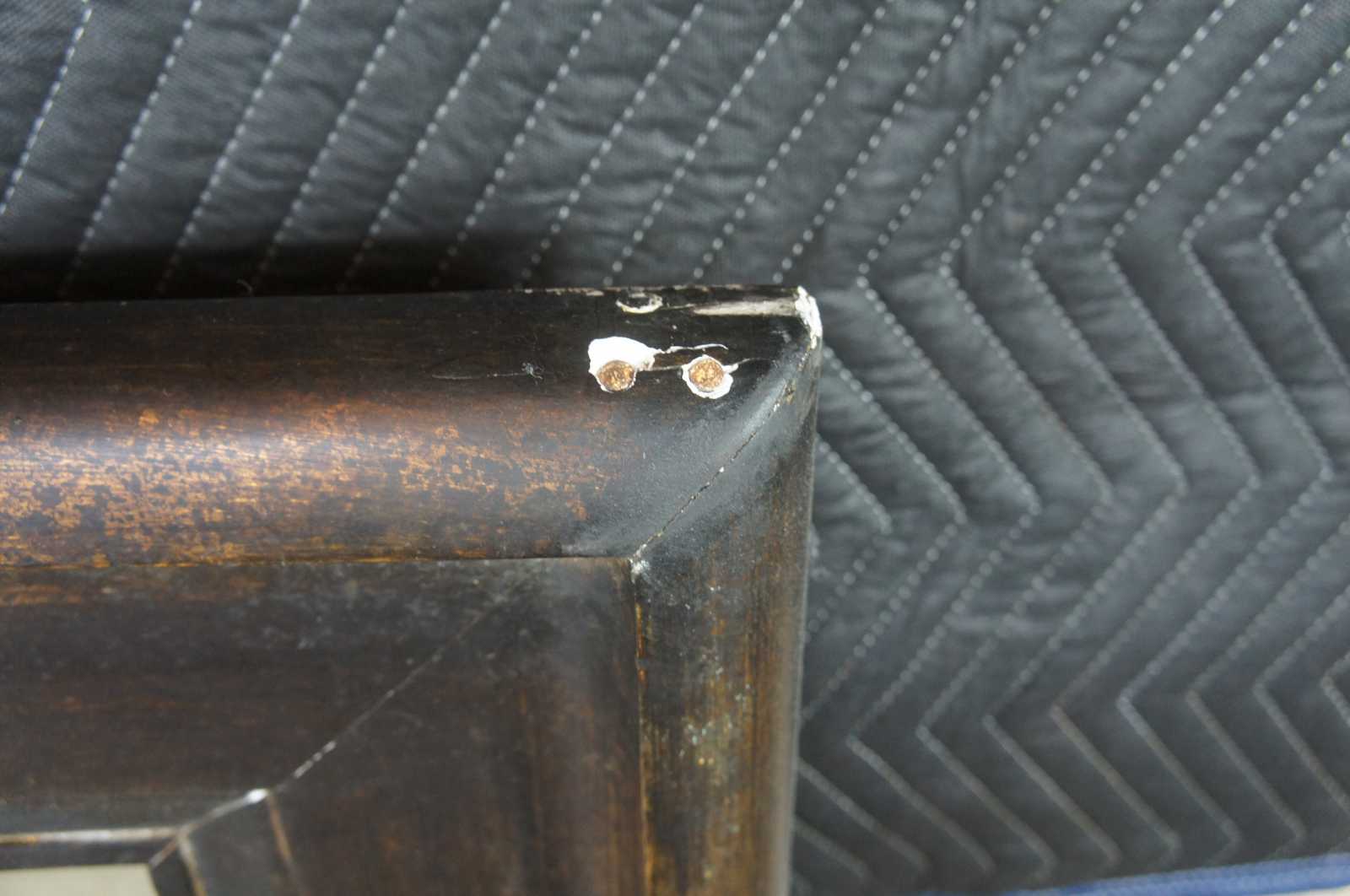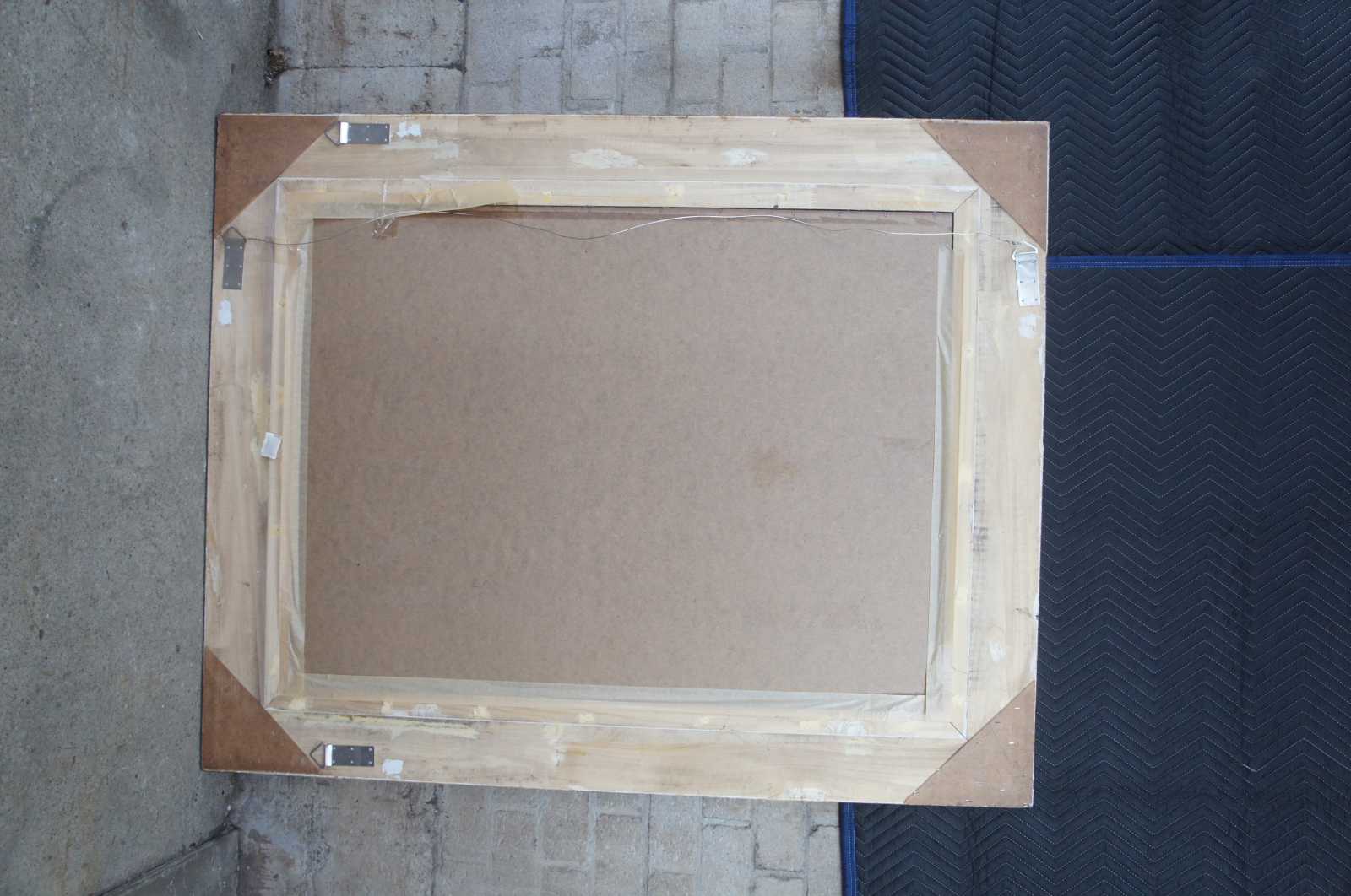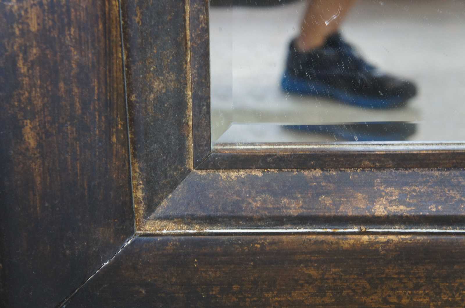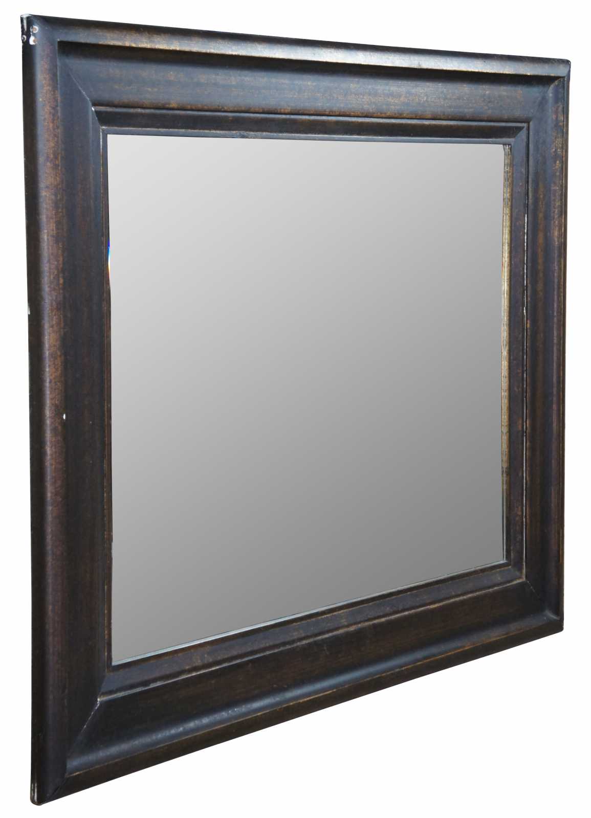 Oversized modern wall mirror. Great for user over a mantel/ along a wall. Black and gold mottled finish with beveled glass.