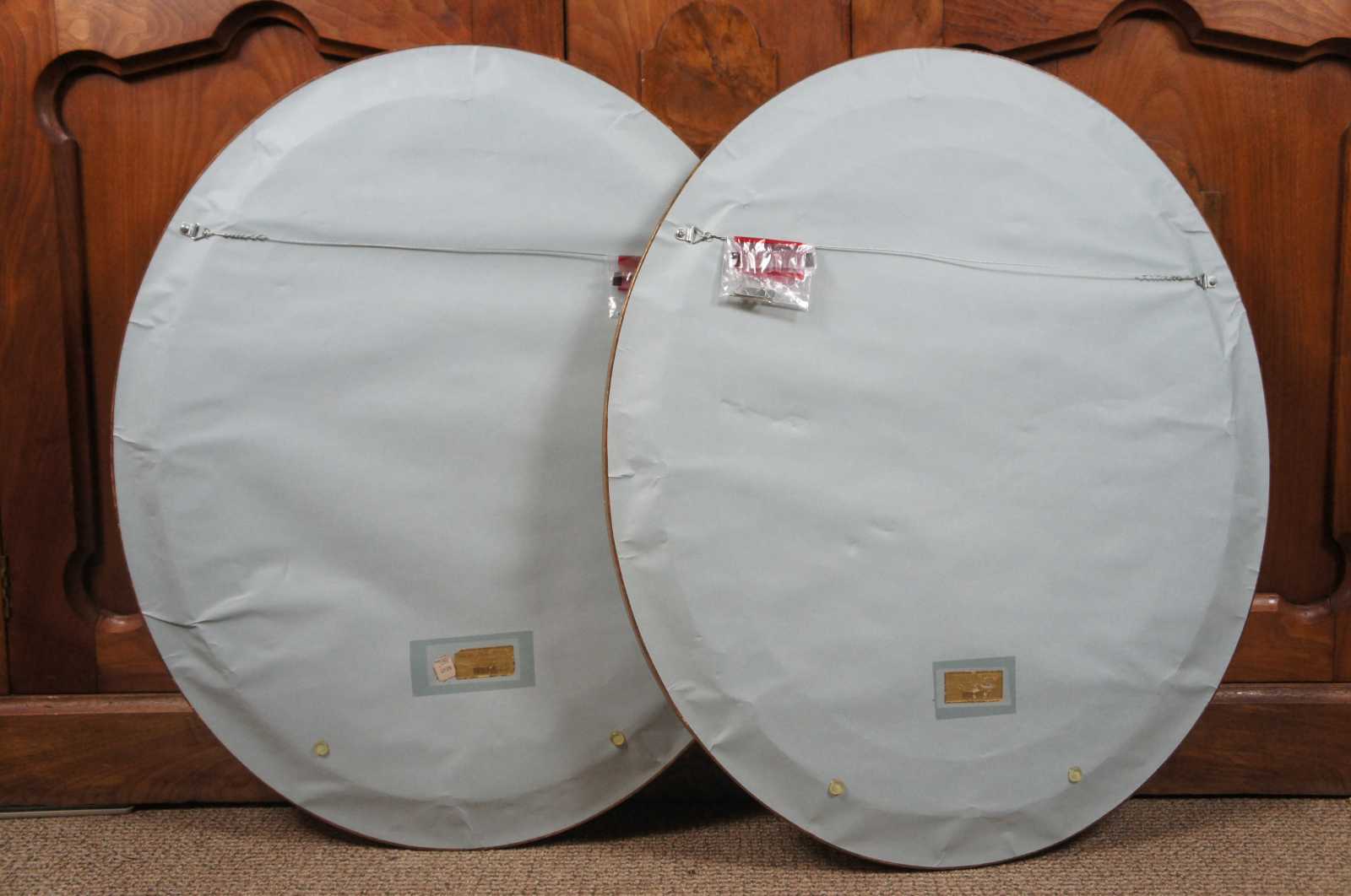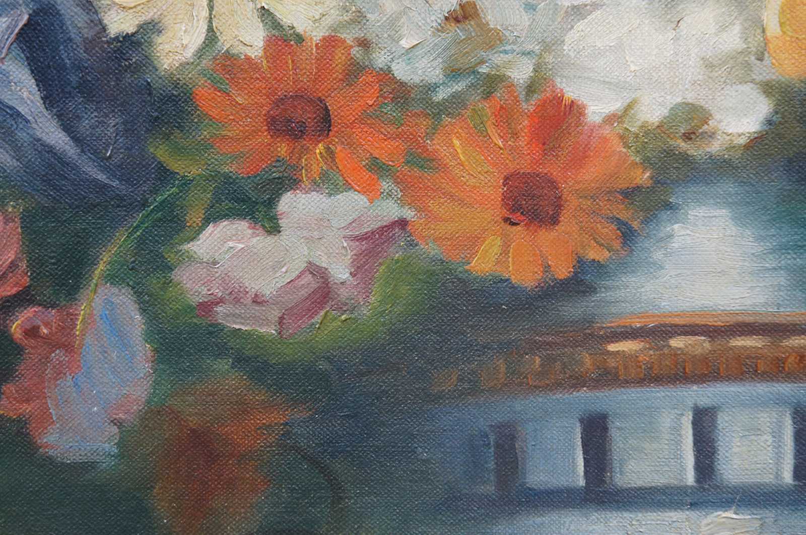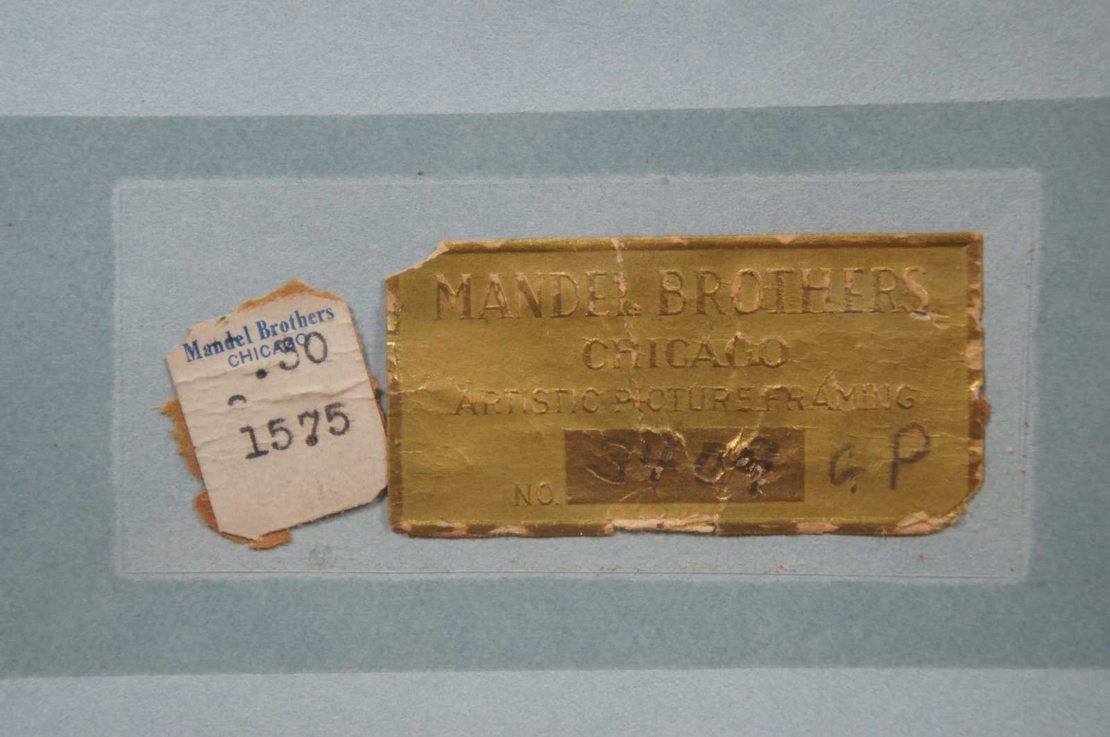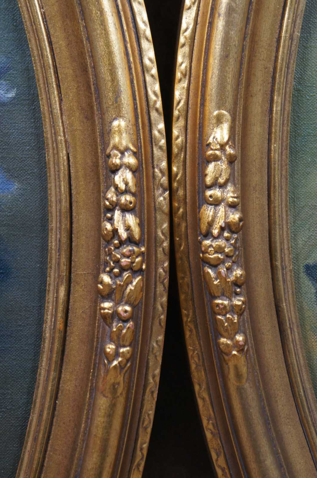 Pair of two antique oil paintings on canvas featuring a still life of bouquets of flowers and fruit in matching vases or urns. Frame from Mandel Brothers department store of Chciago.