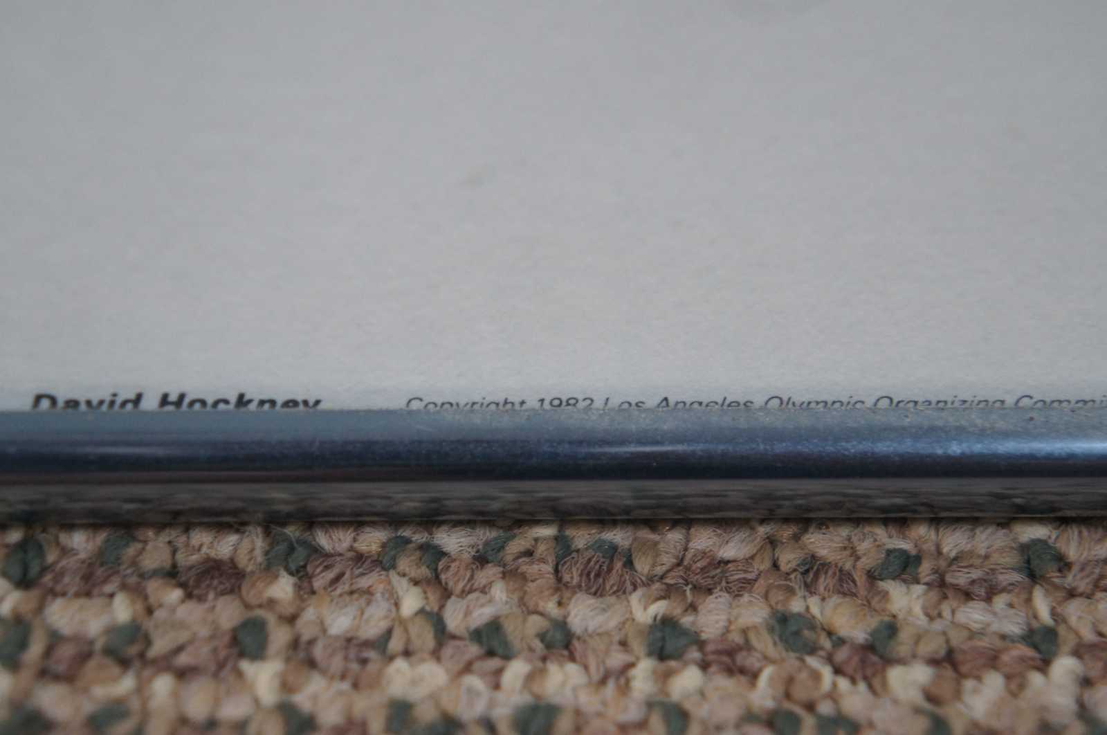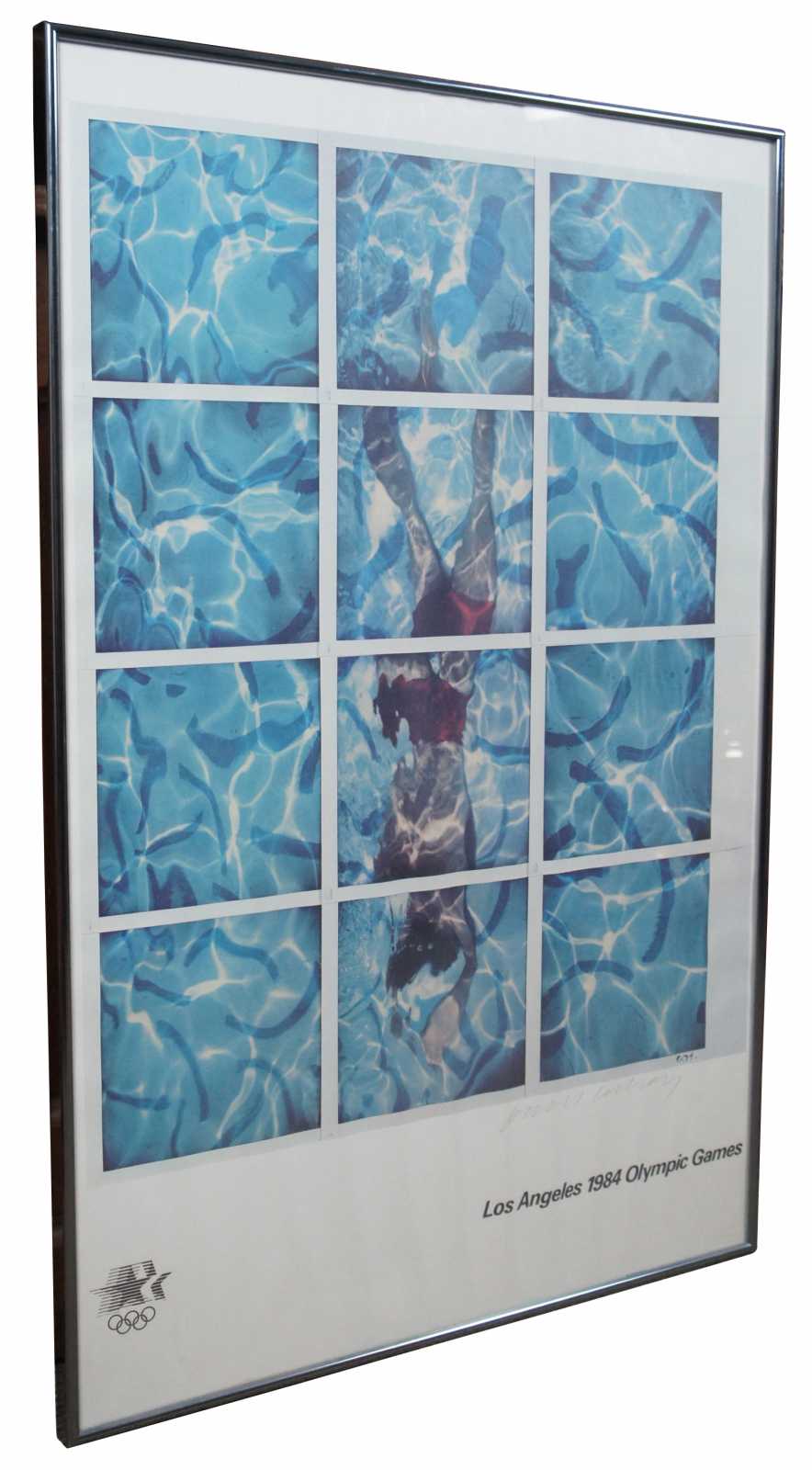 Rare original 1984 Los Angeles Olympic Games poster pencil signed by the artist, David Hockney. The offset lithograph is on Diploma Parchment paper. Published in 1982 for the Los Angeles Olympics 1984. un-numbered from the limited edition of 750, there are said to be less than 200 prints in existence “David Hockney, OM, CH, RA (born 9 July 1937) is an English painter, draftsman, printmaker, stage designer, and photographer. As an important contributor to the pop art movement of the 1960s, he is considered one of the most influential British artists of the 20th century.