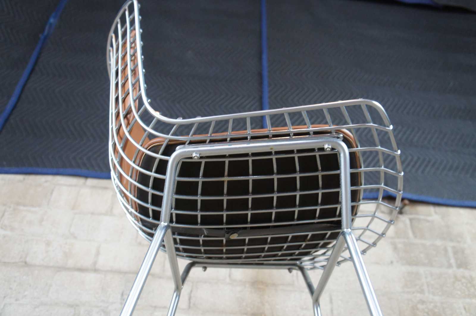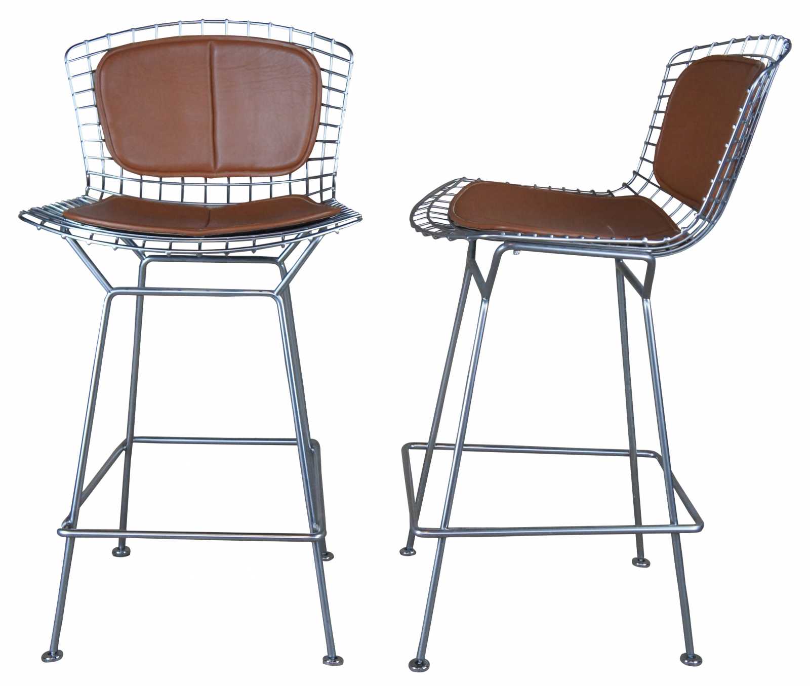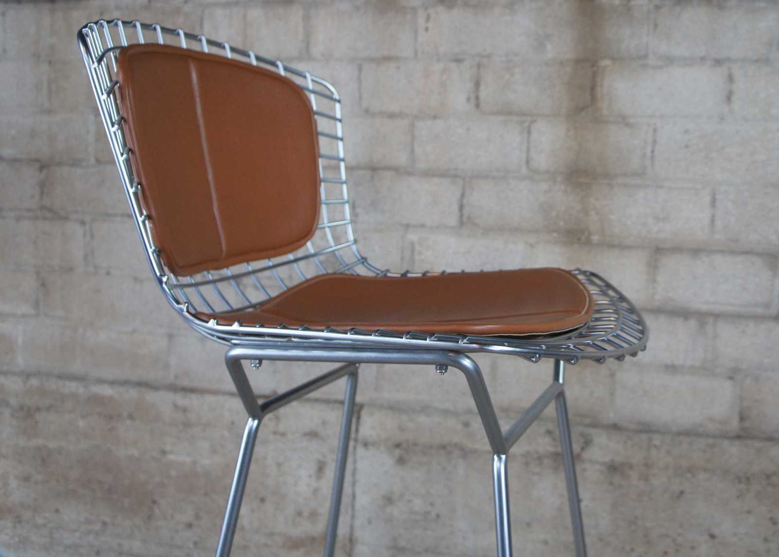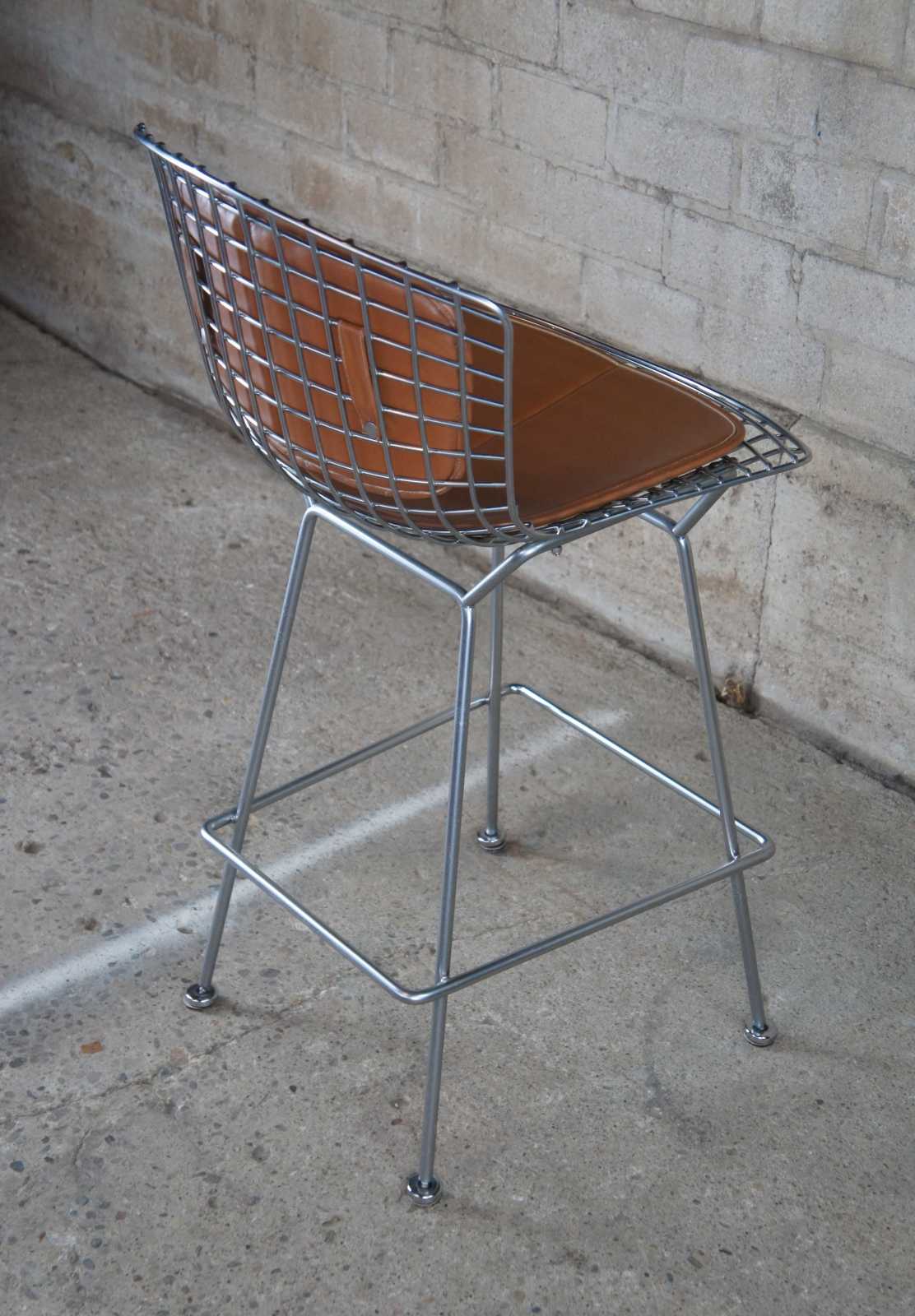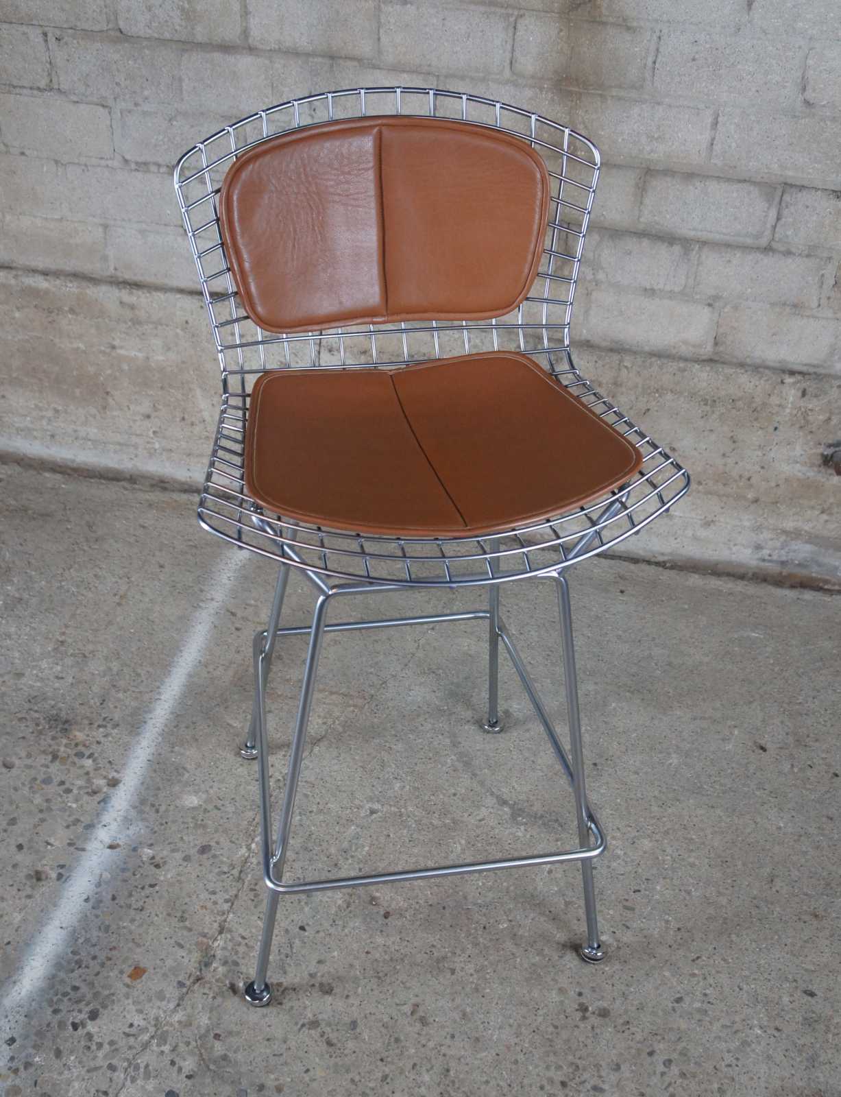 Set of 4 Harry Bertoia for Knoll International wire form counter height bar stools. Features brown leather seat and back.
