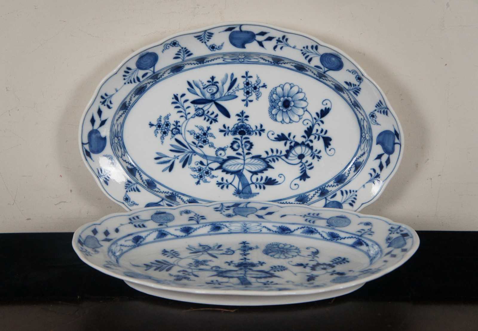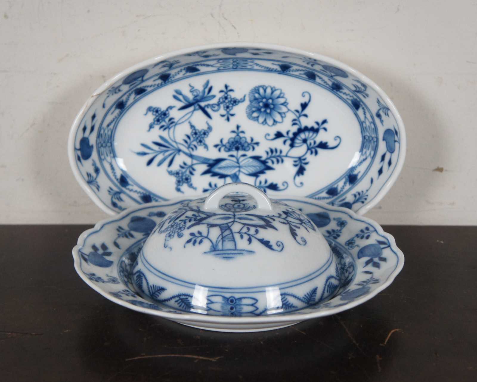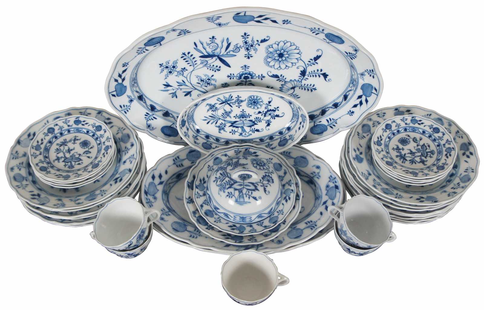 Antique 36 piece set of Meissen flow blue porcelain dinnerware in the Blue Onion pattern with the crossed swords makers mark.