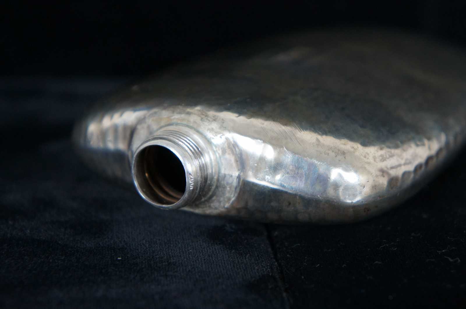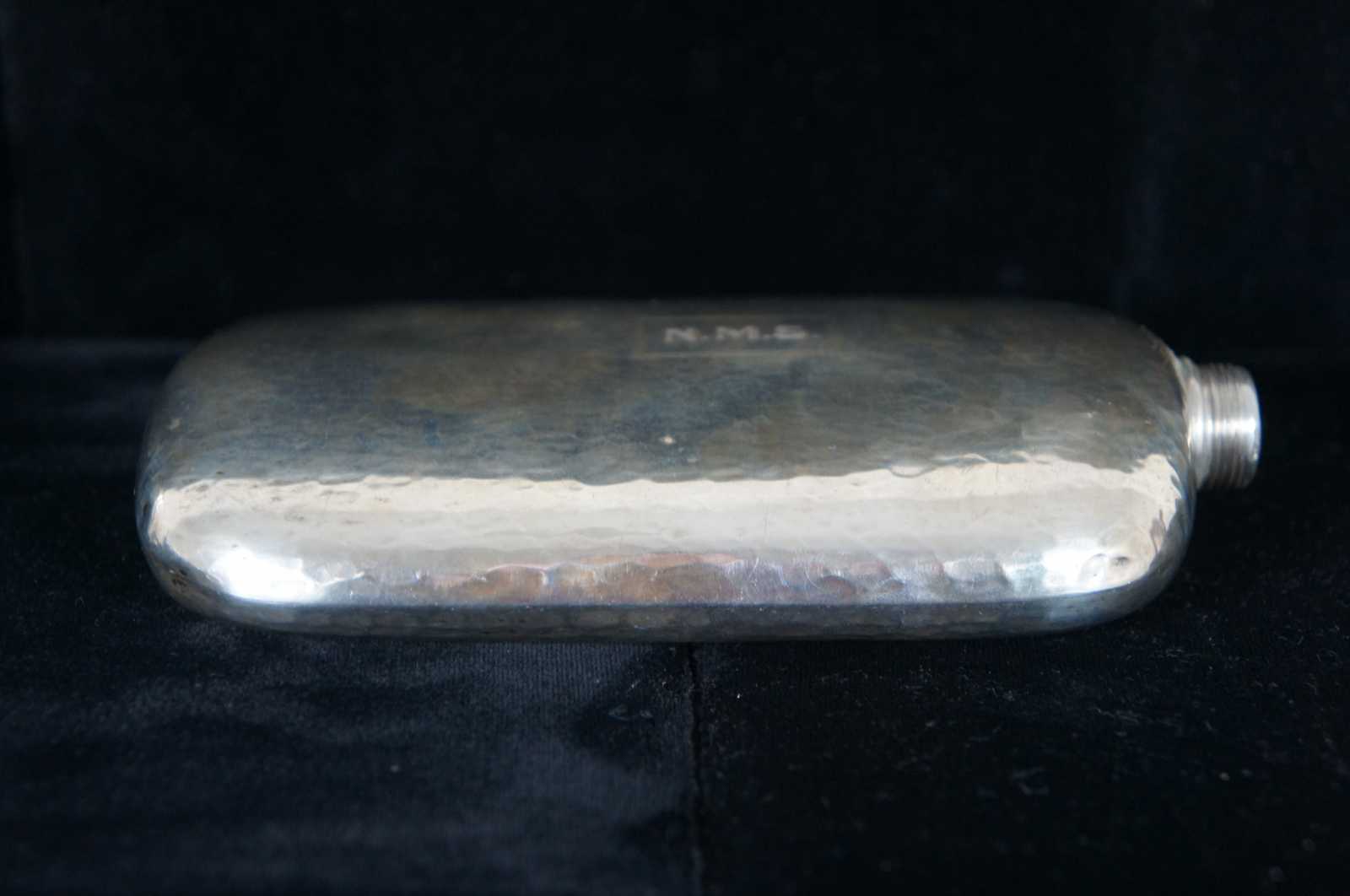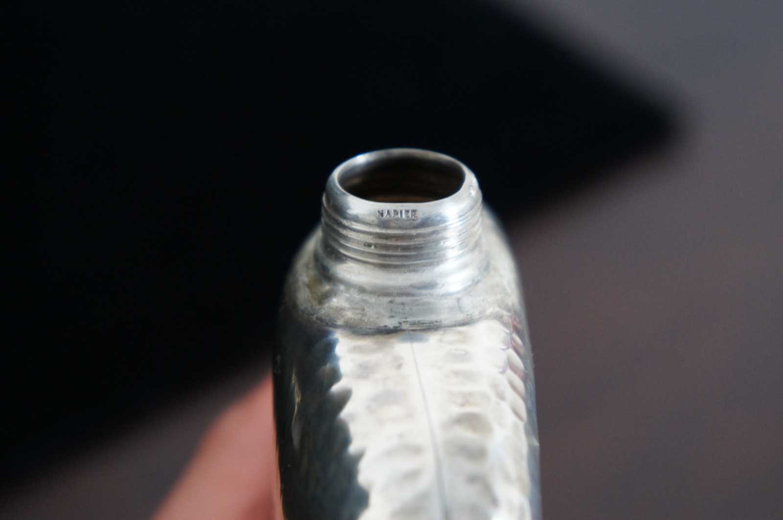 Antique Napier hammered sterling silver hip flask with collapsible shot glass cap. Engraved with the initials “NMS.”