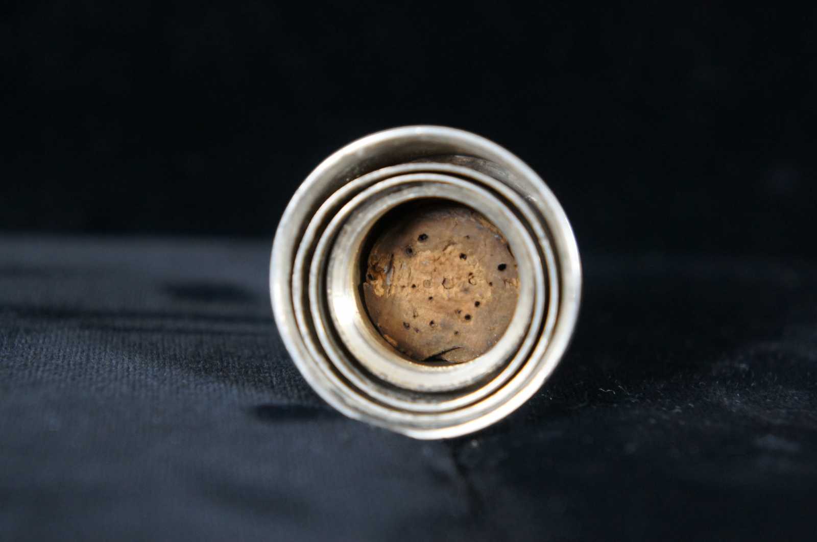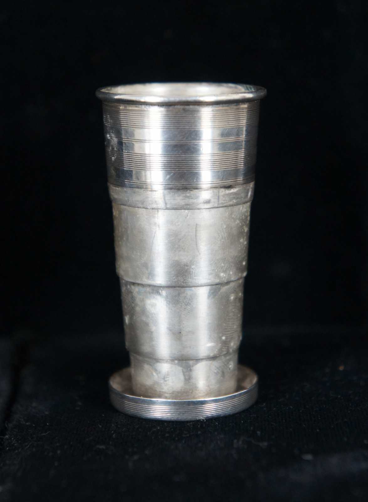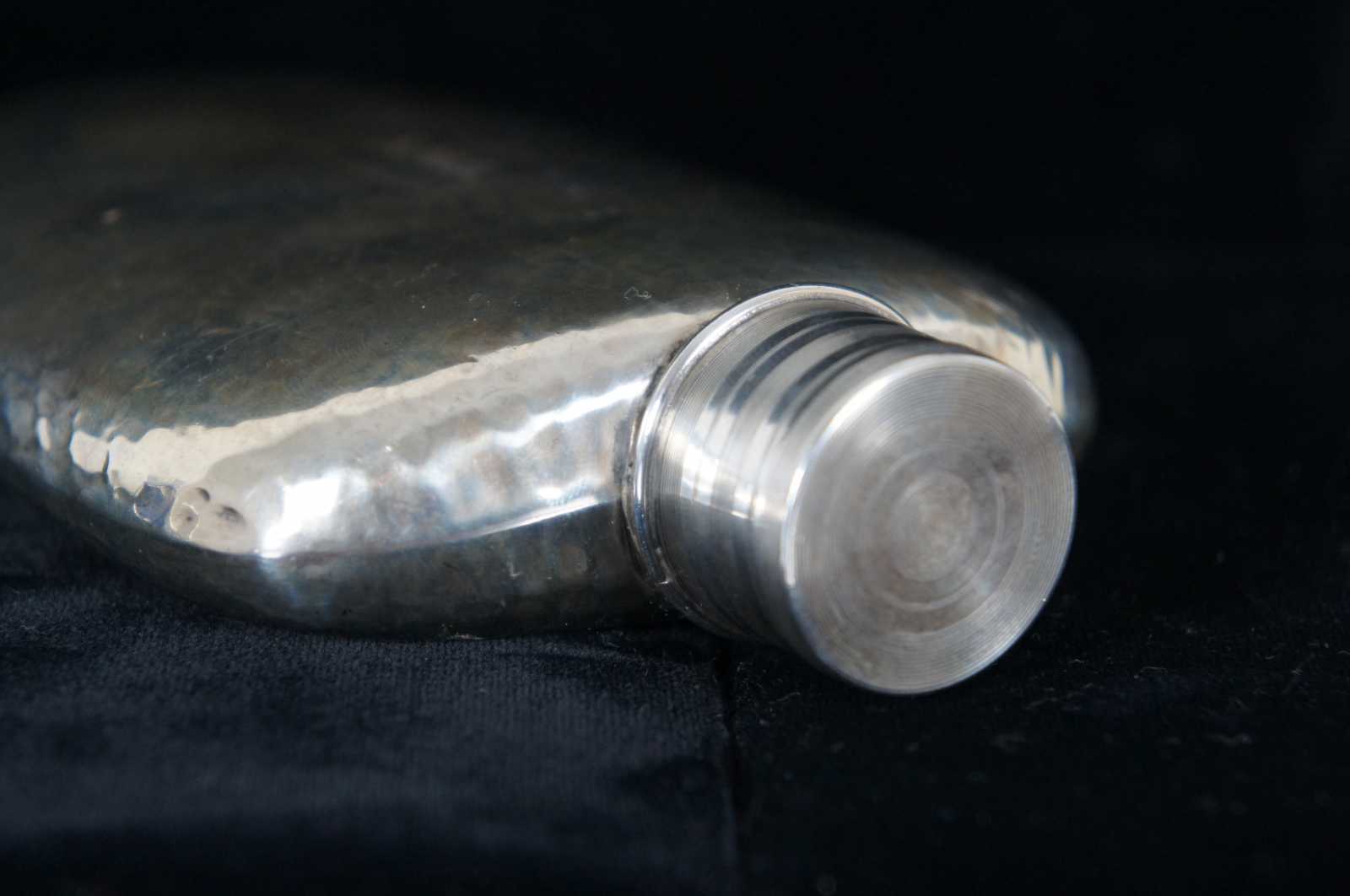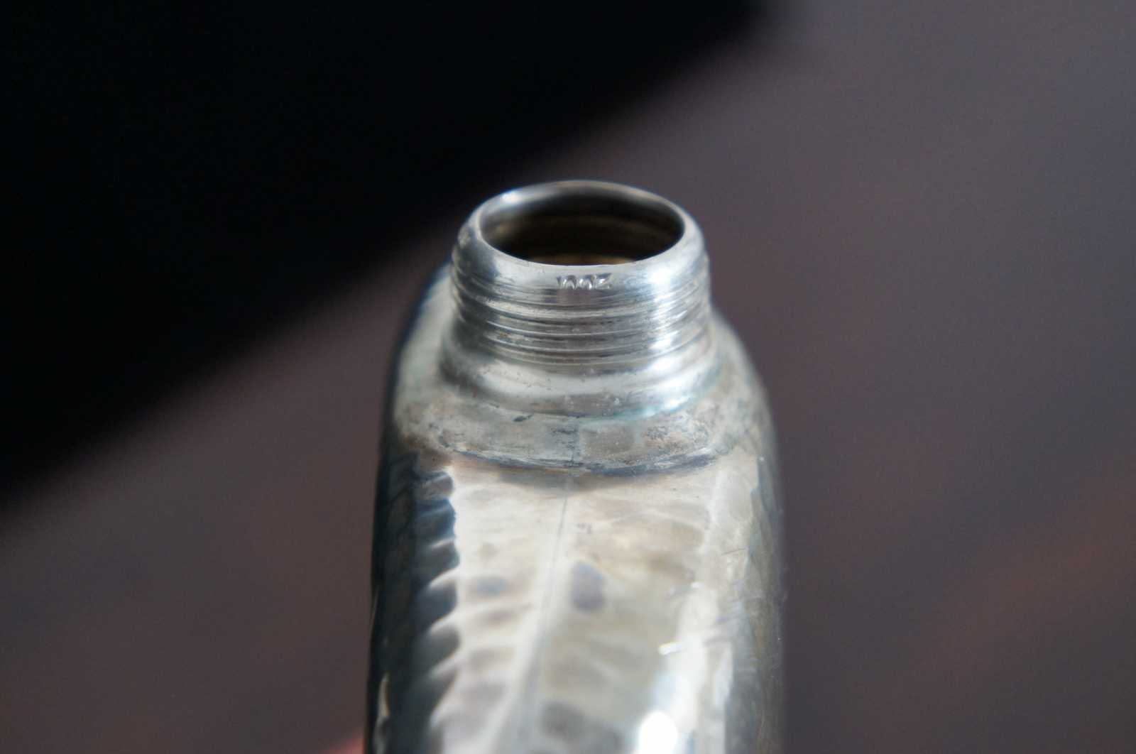 Antique Napier hammered sterling silver hip flask with collapsible shot glass cap. Engraved with the initials “NMS.”