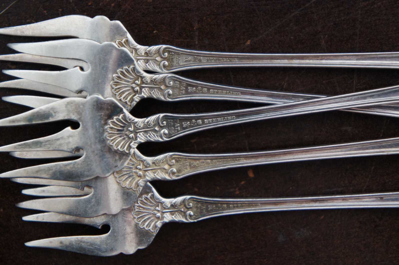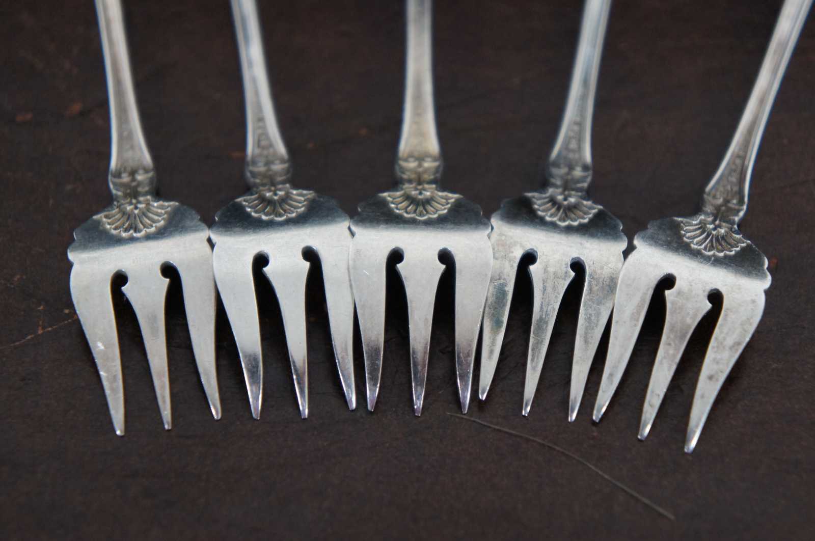 Set of 5 antique Gorham sterling silver cocktail or fish forks with floral and scallop shell pattern, engraved with a monogram “P.”