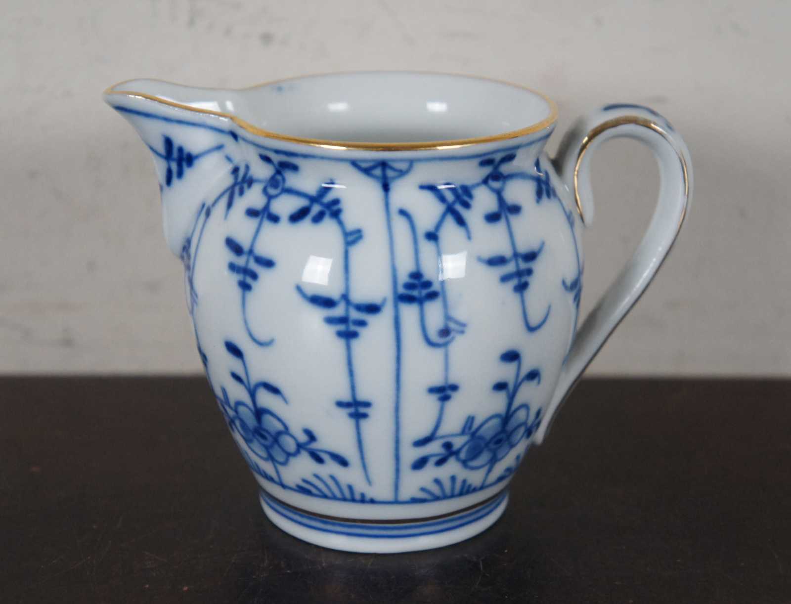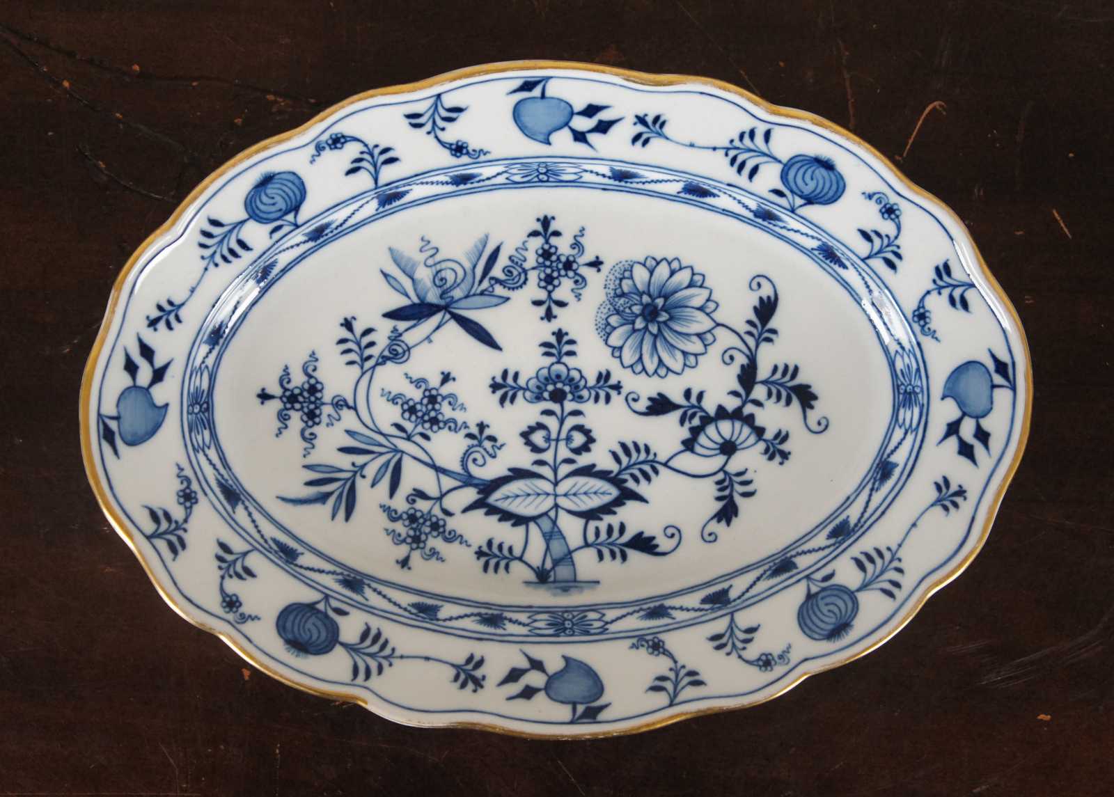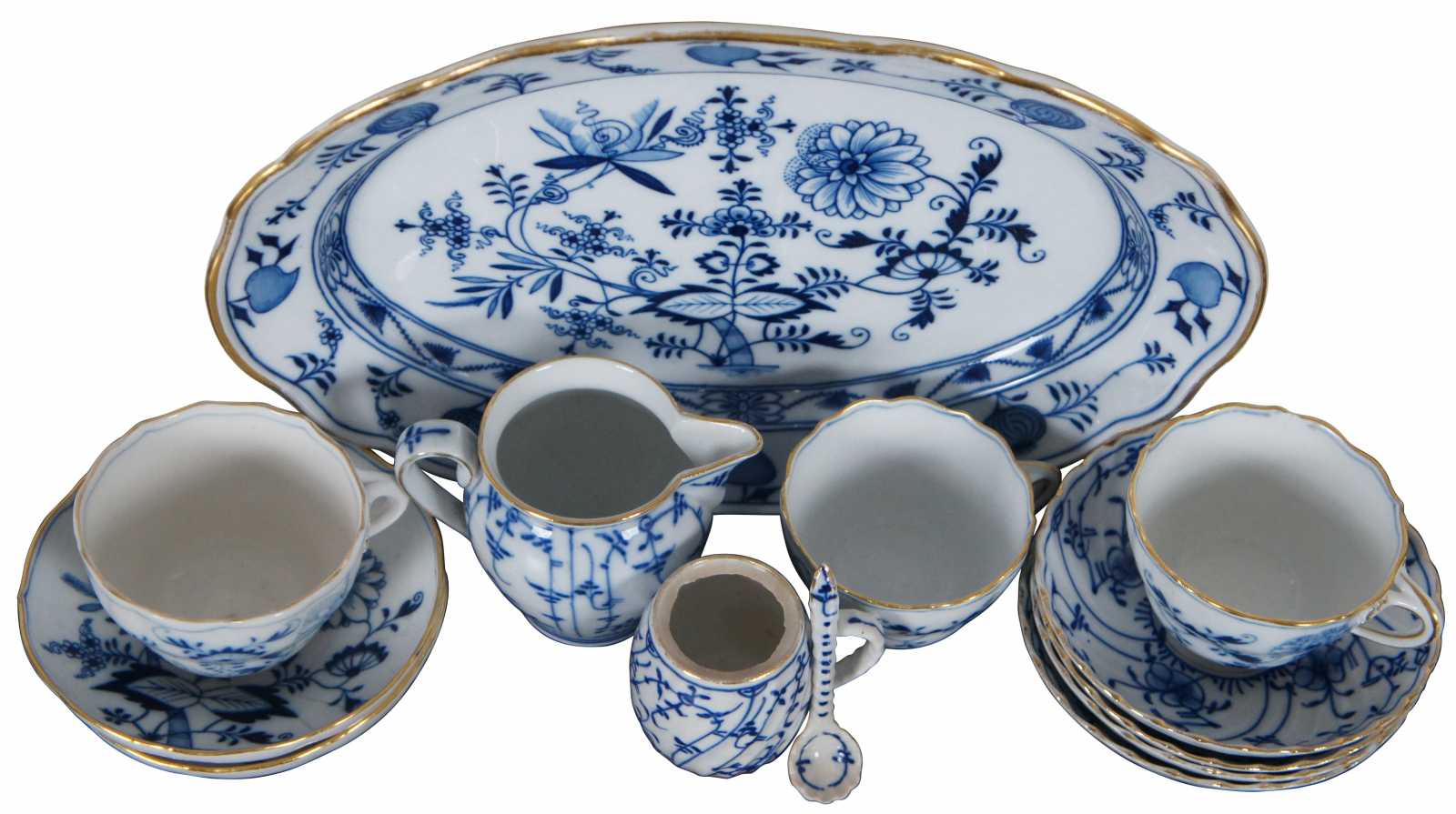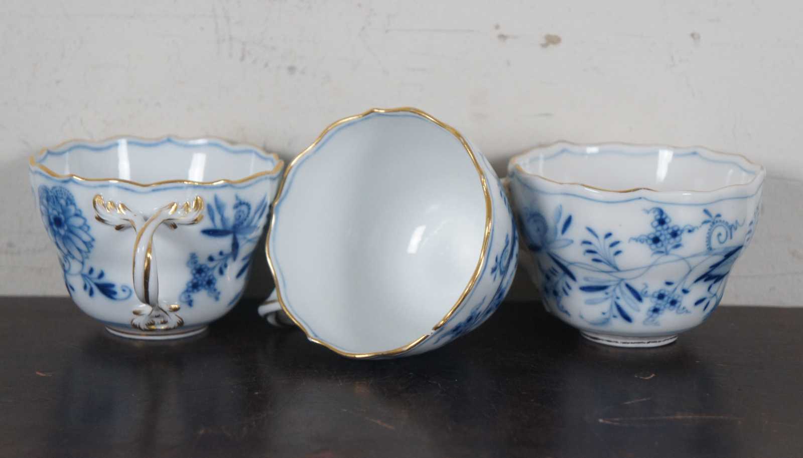 Lot of thirteen 19th century dinnerware pieces by Meissen and Königlich privilegierte Porzellanmanufaktur Tettau, Sontag & Maisel (1879–1902), featuring blue and white Blue Onion patterns and gilded accents.