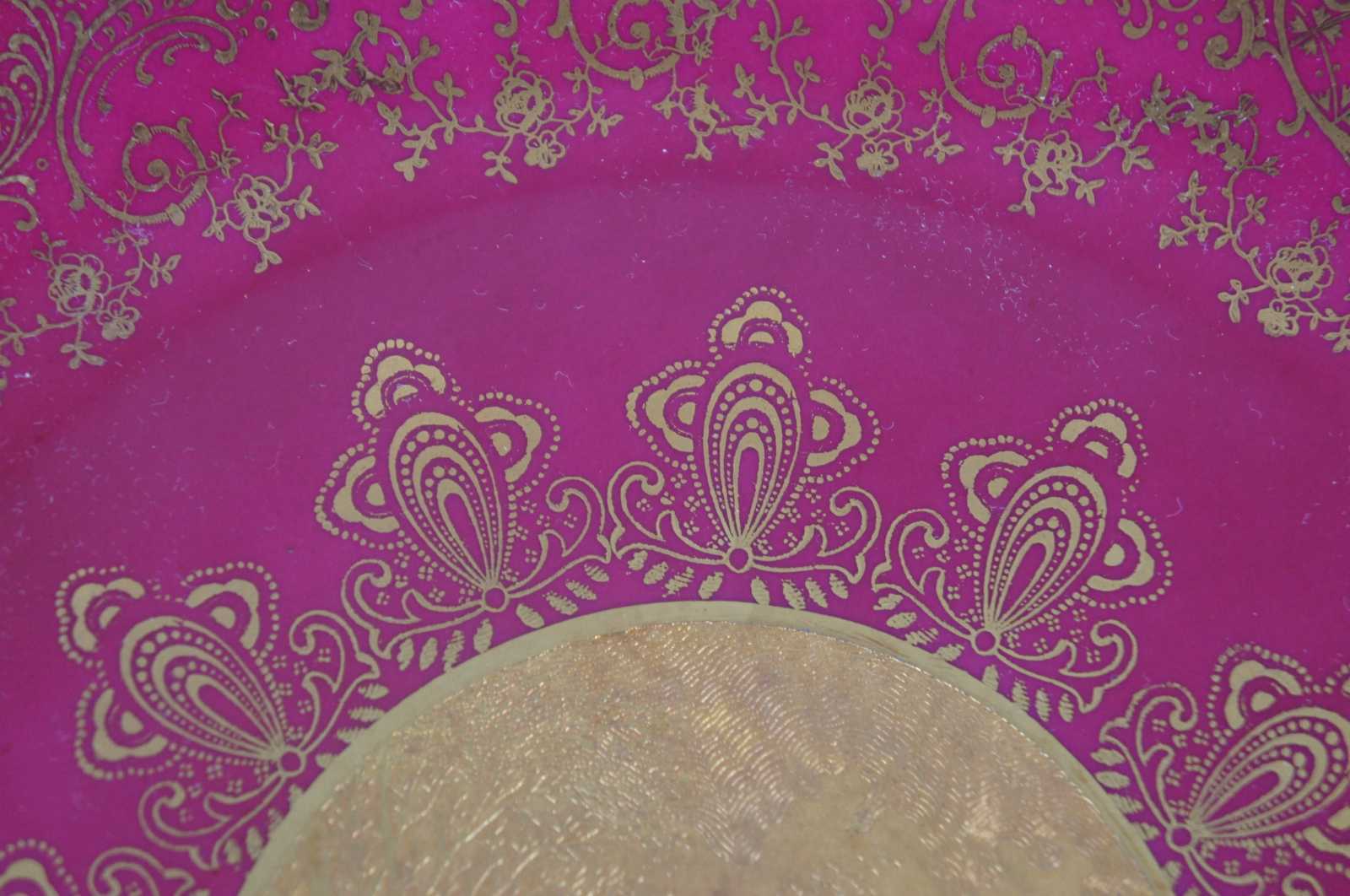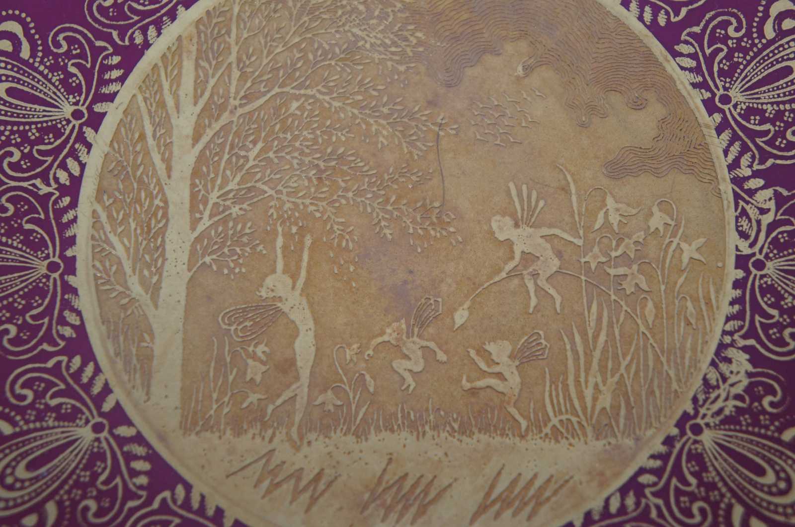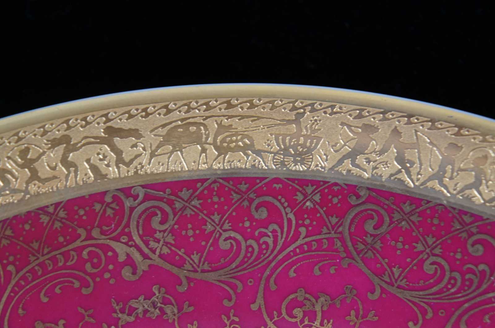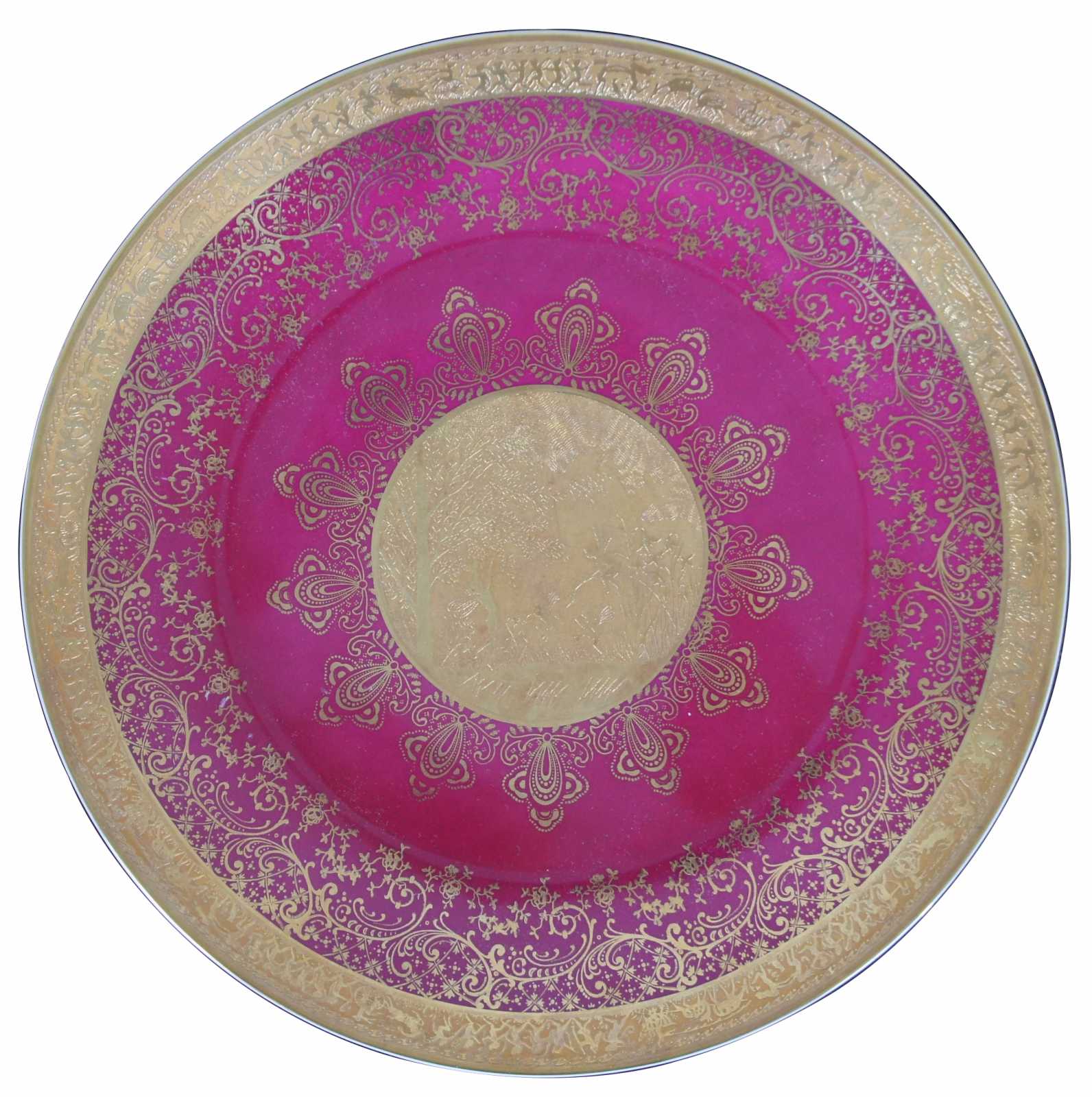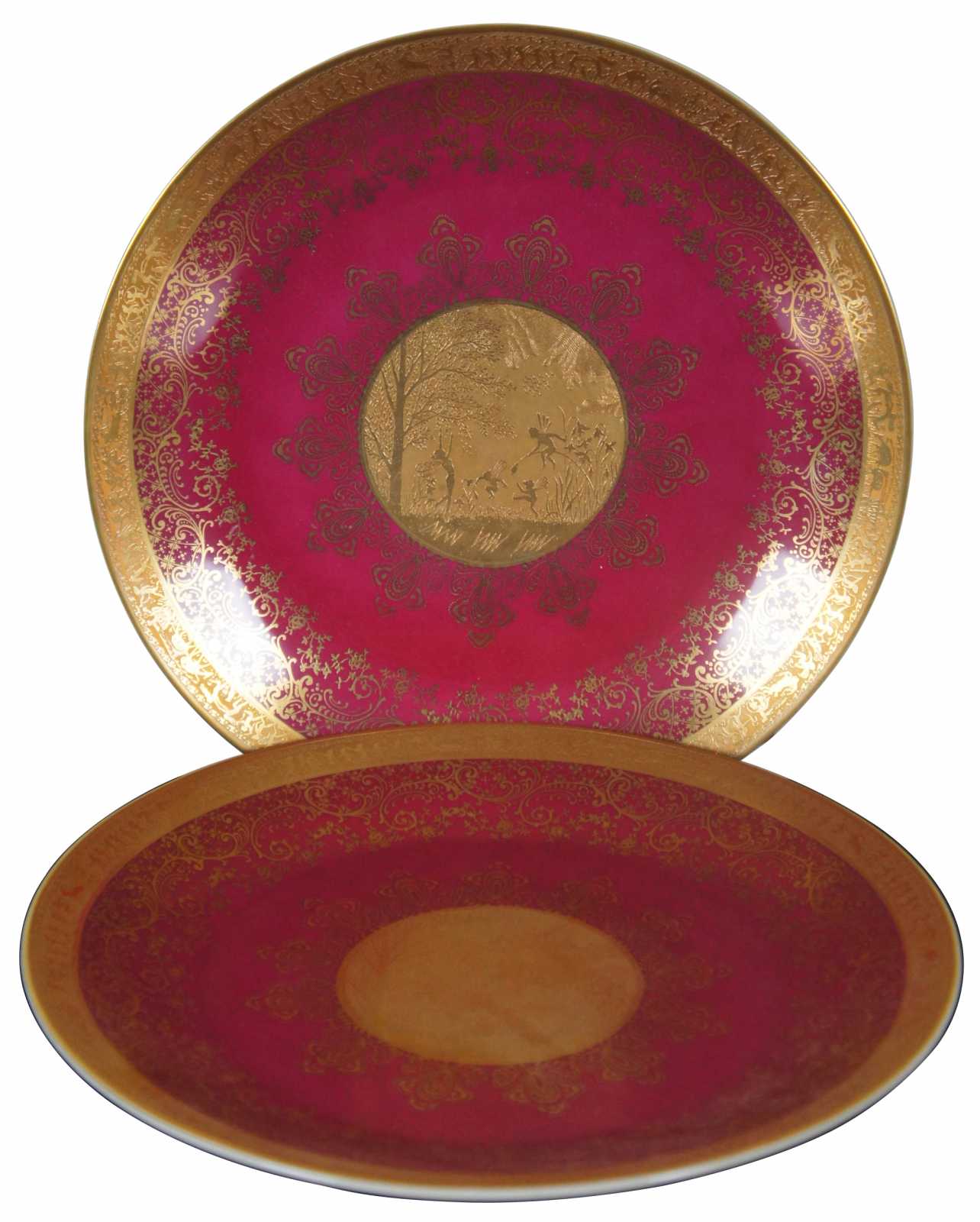 Pair of vintage Hutschenreuther Selb, Bavaria magenta porcelain chargers with Art Nouveau embossed gold center and border of silhouetted faires and other fey creatures.