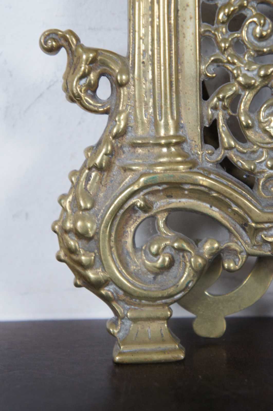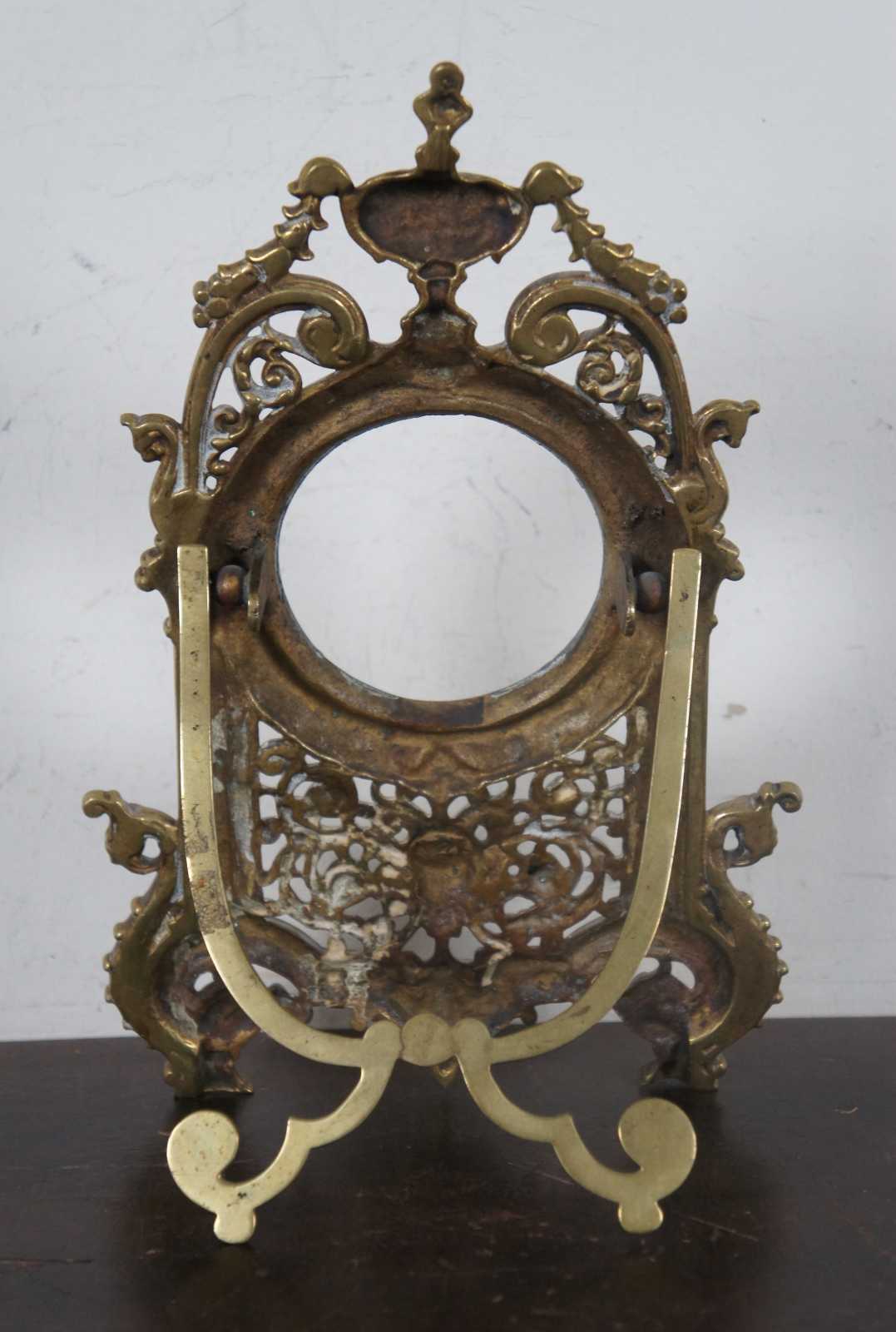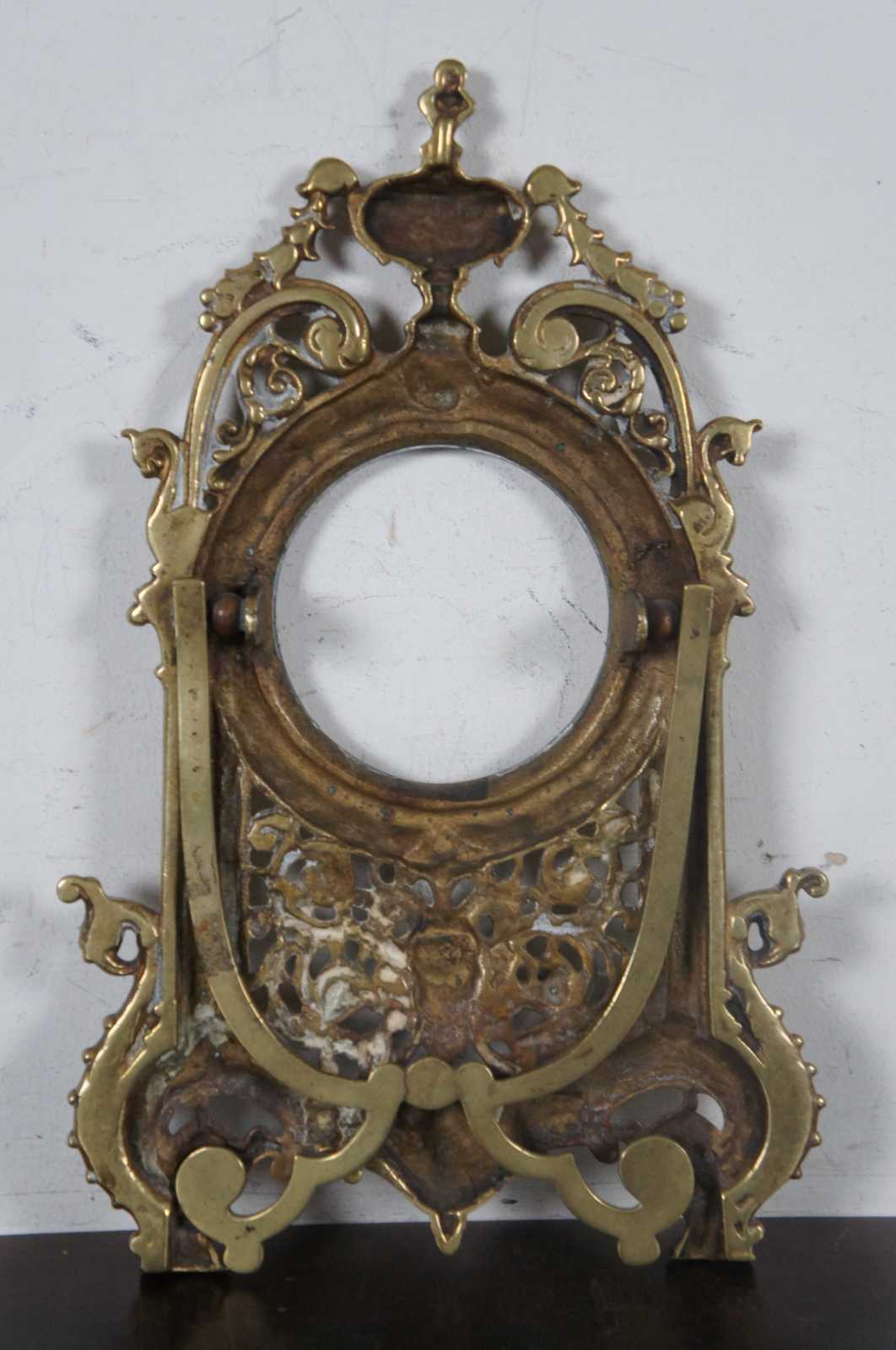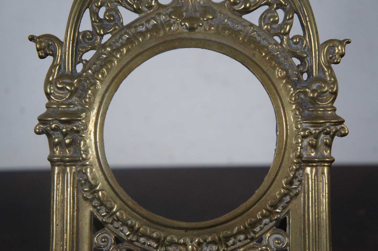 Antique brass easel style tabletop picture frame with round opening surrounded by neoclassical columns and topped with an urn, above a Green Man type face.
