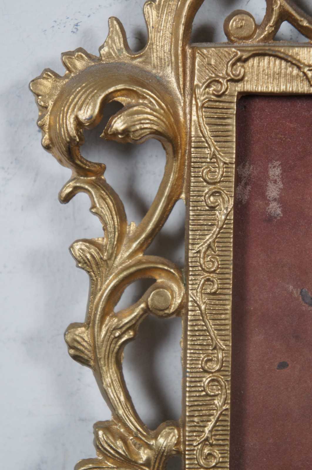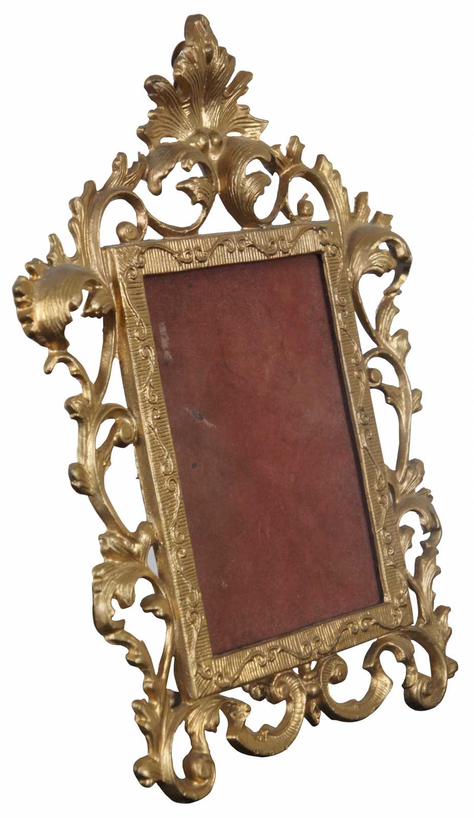 Antique gold painted cast iron picture or mirror frame styled with swirling Baroque leaves.