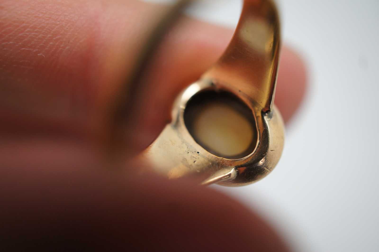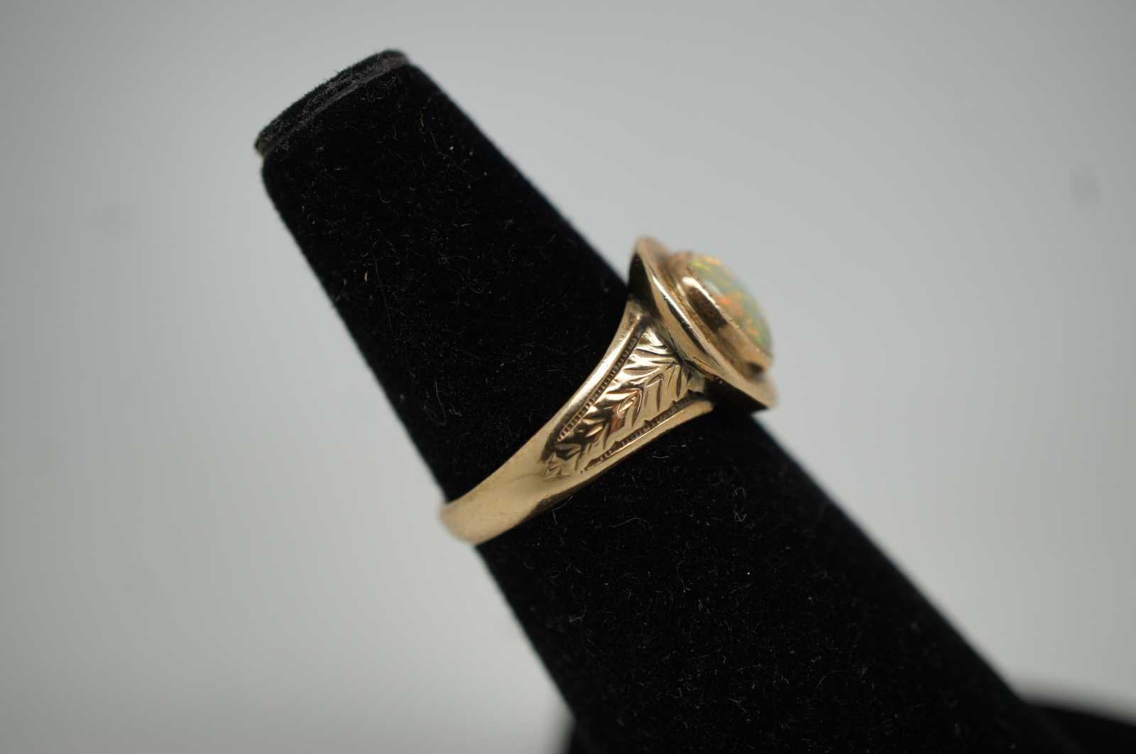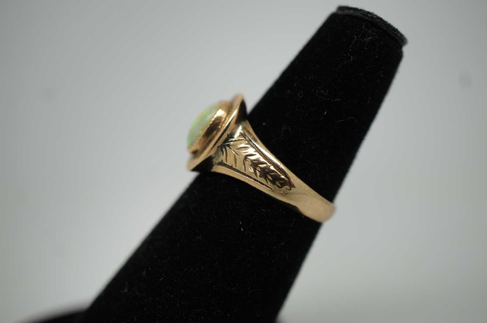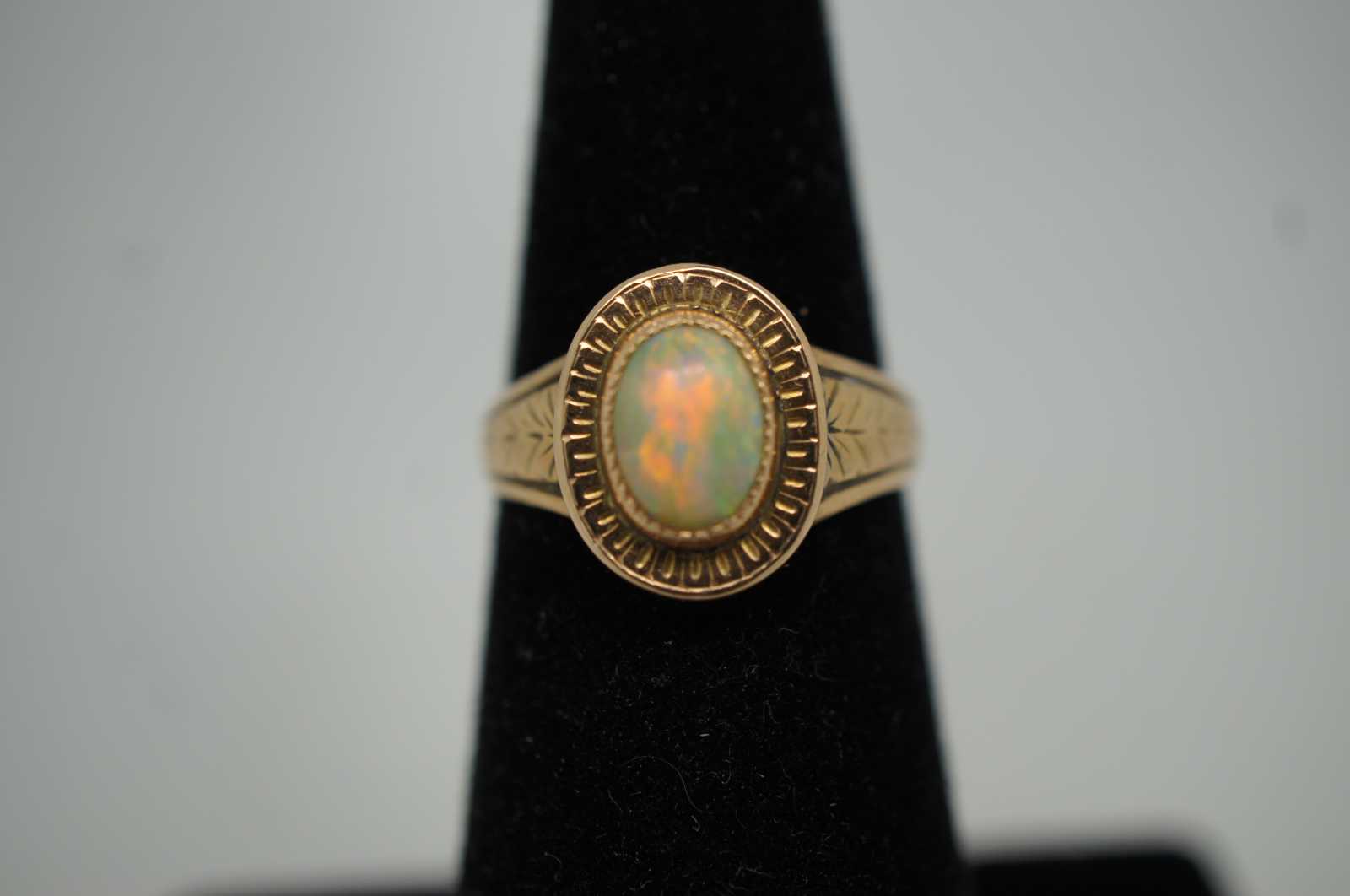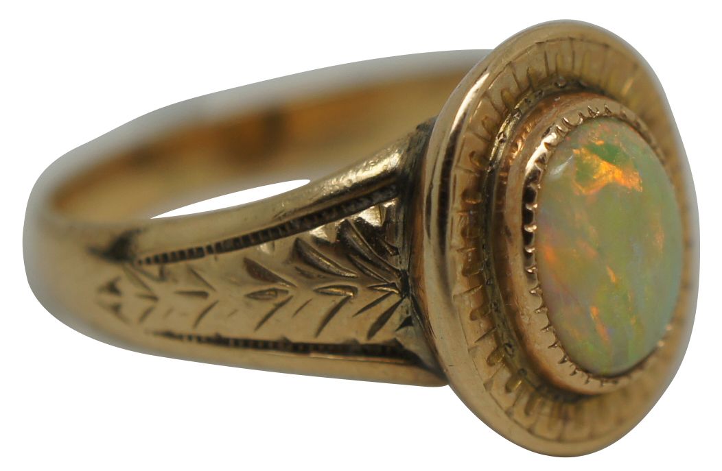 Antique 10k gold ring with Victorian styling, set with a cabochon opal and ornate detail.