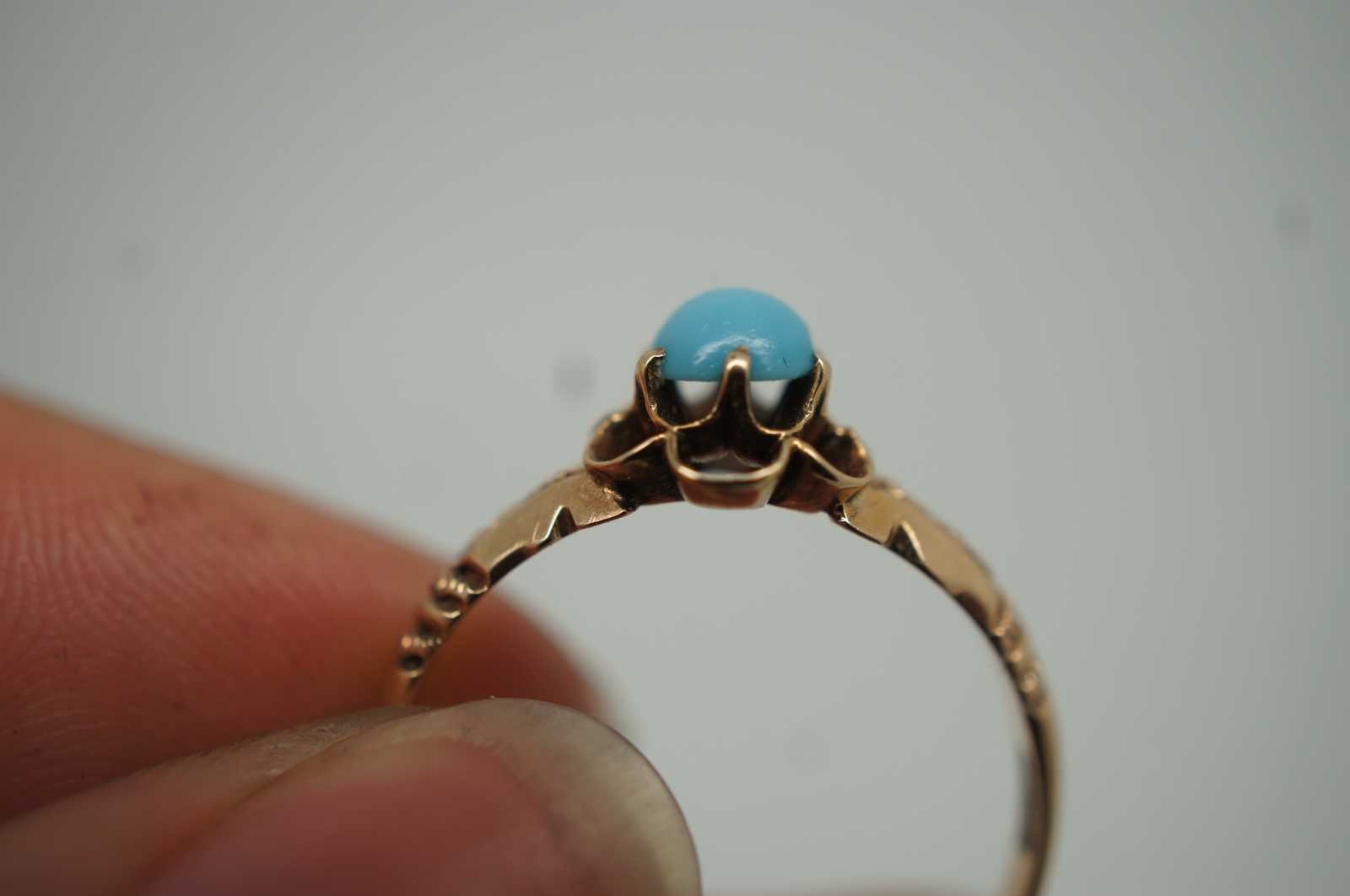 Antique Victorian 10K gold buttercup / floral shaped ring set with a cabochon turquoise stone, crafted by the Allsopp Brothers.