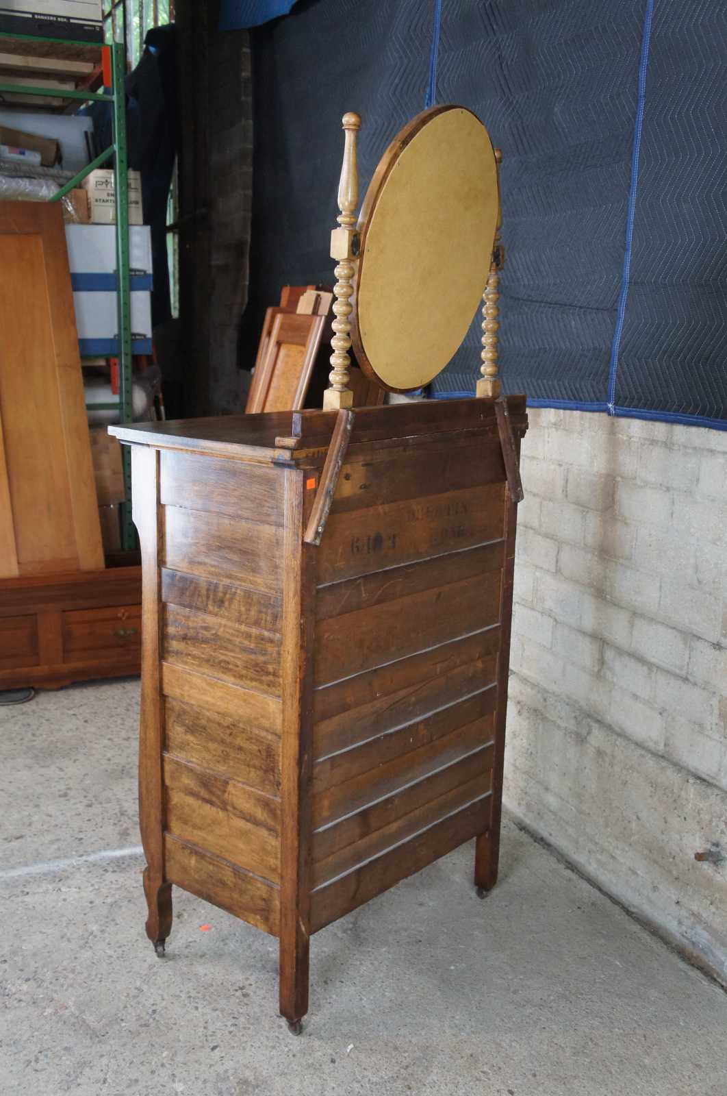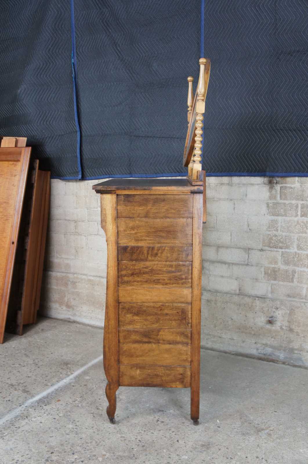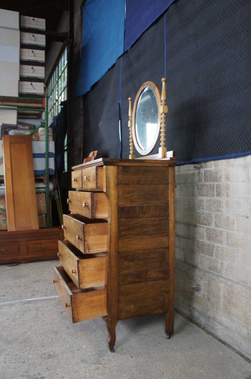 Mid Century Crescent Line highboy vanity dresser or chest. Made of oak featuring a vanity mirror with ribbed supports over six drawers.