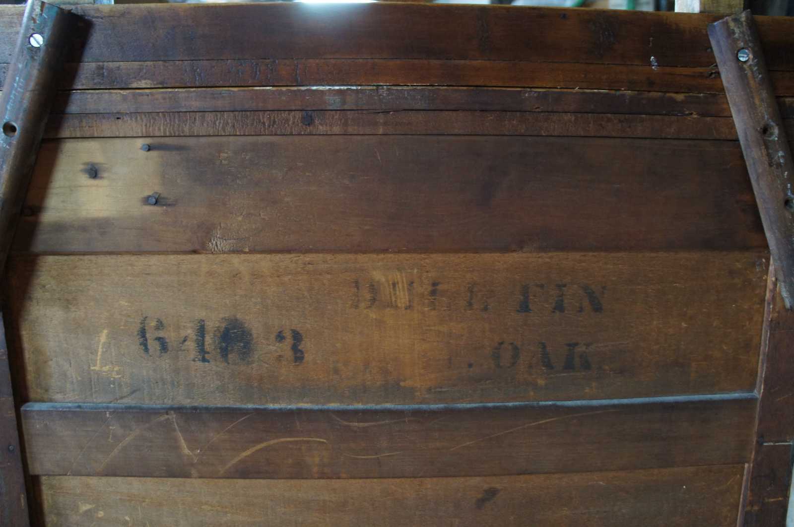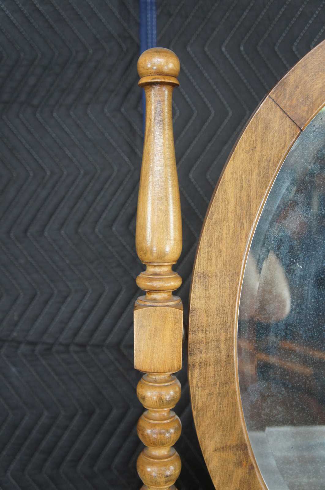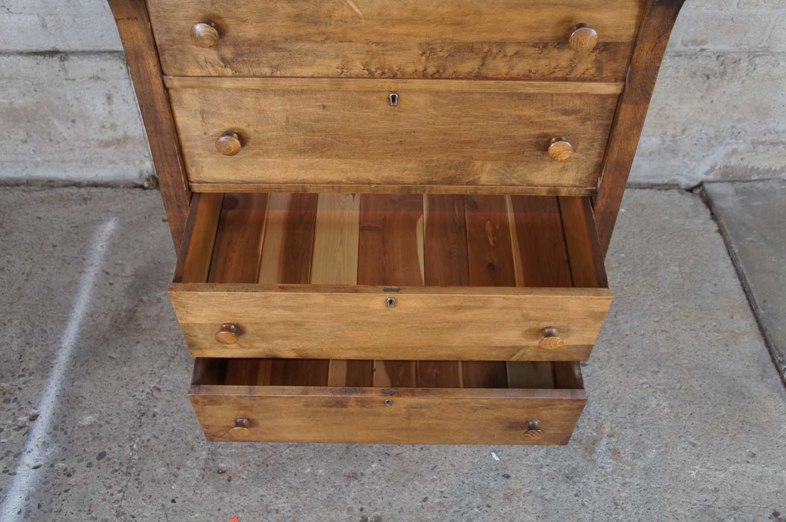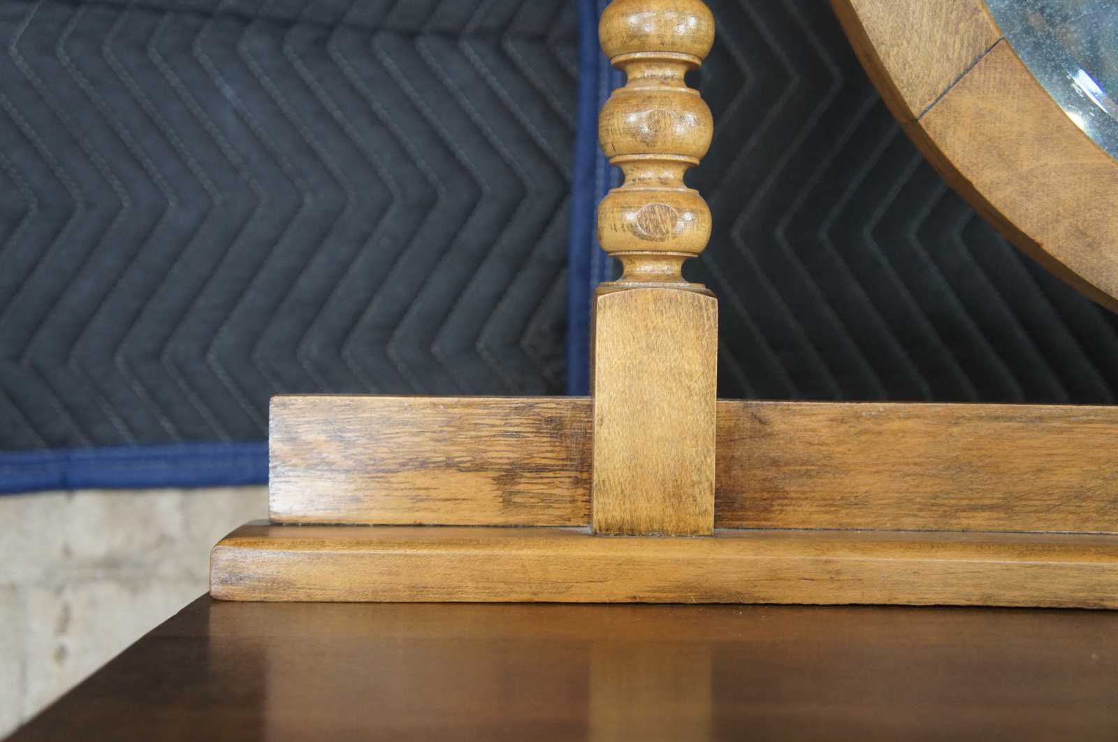 Mid Century Crescent Line highboy vanity dresser or chest. Made of oak featuring a vanity mirror with ribbed supports over six drawers.