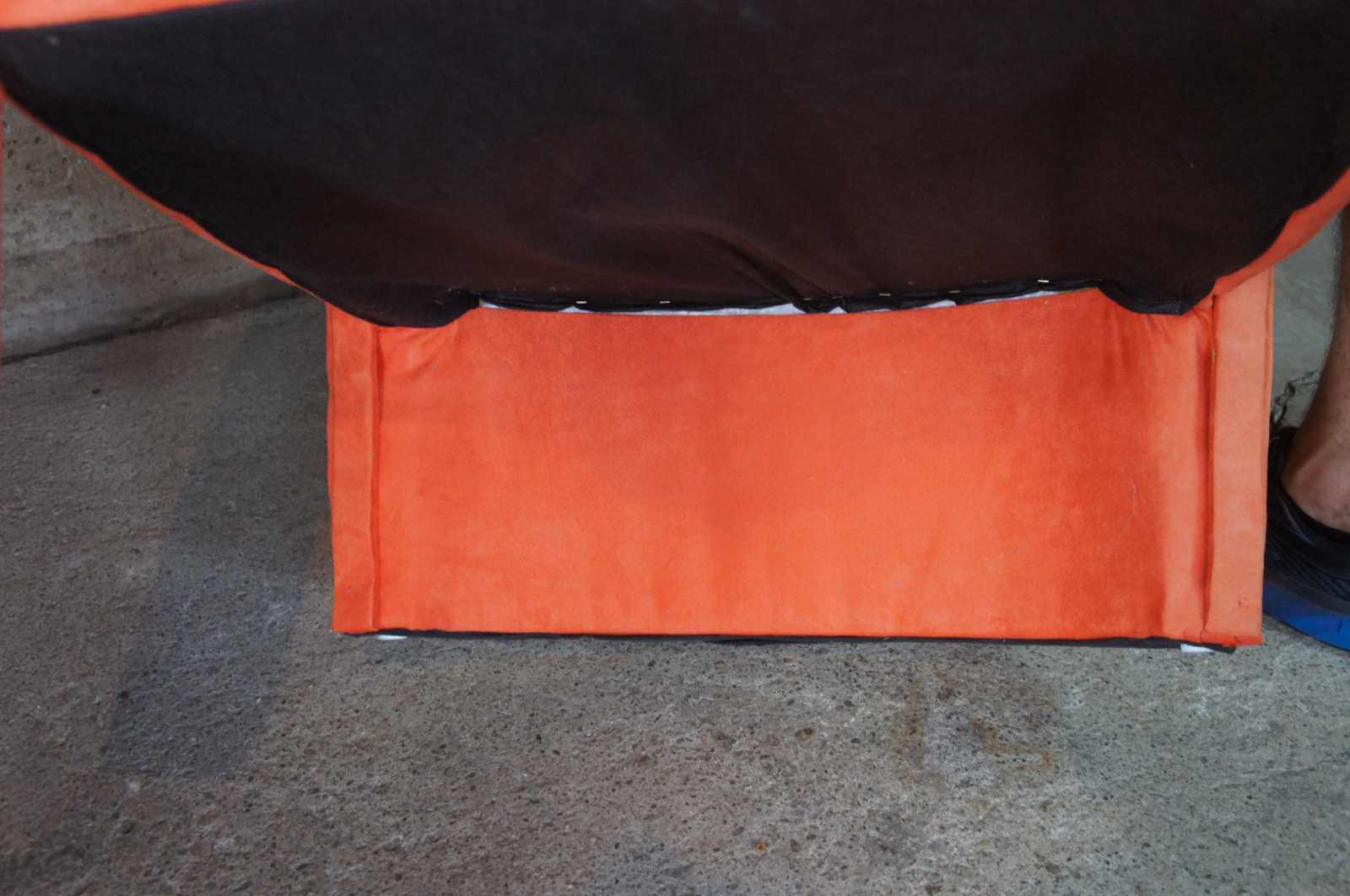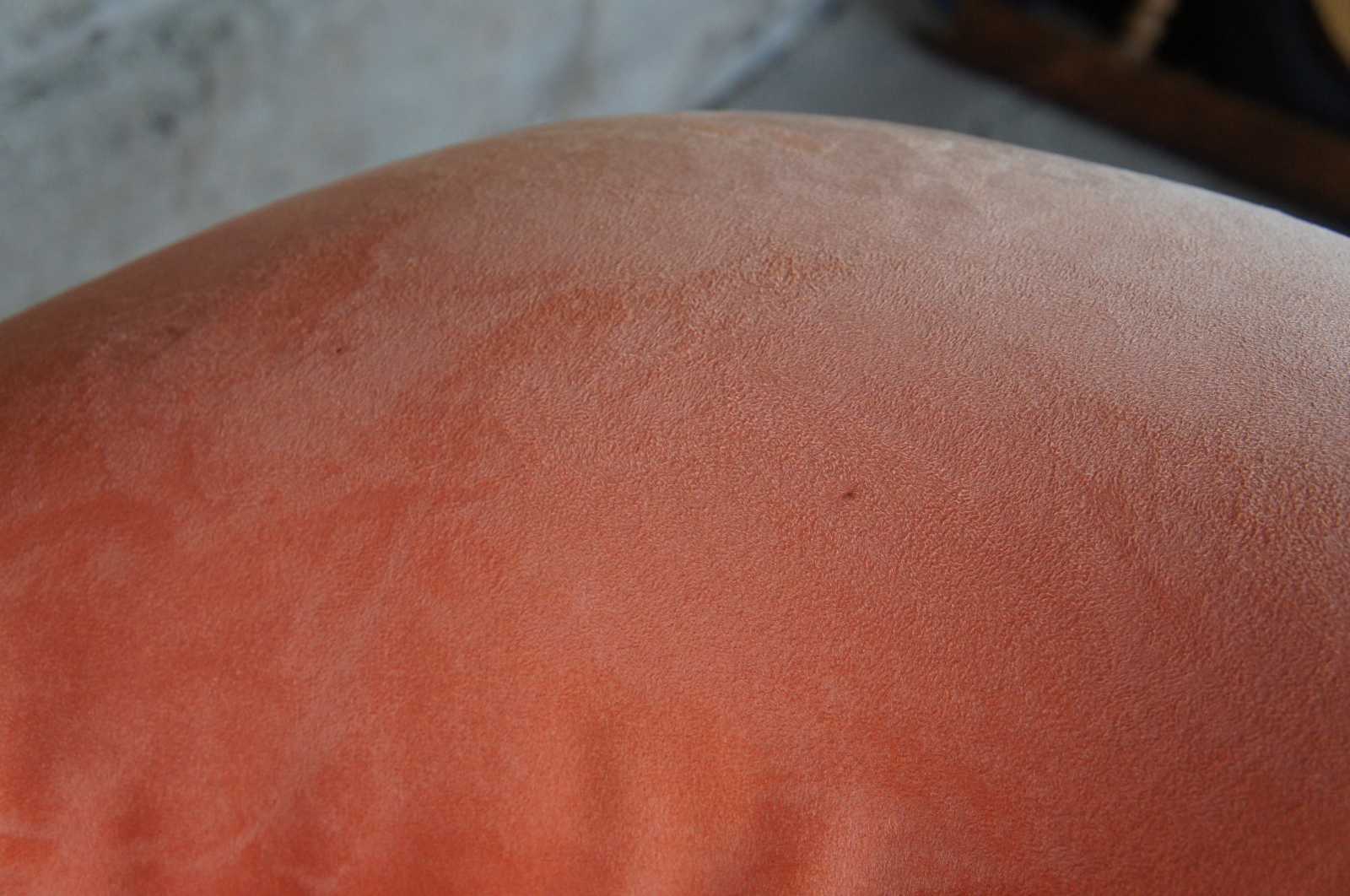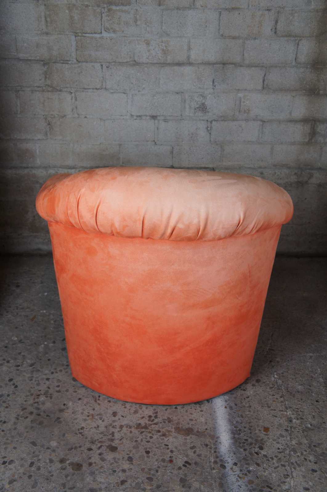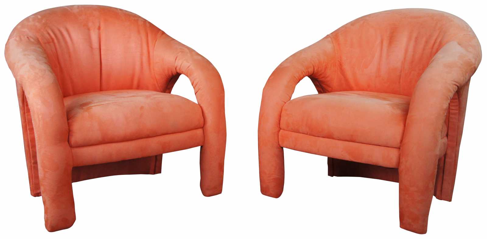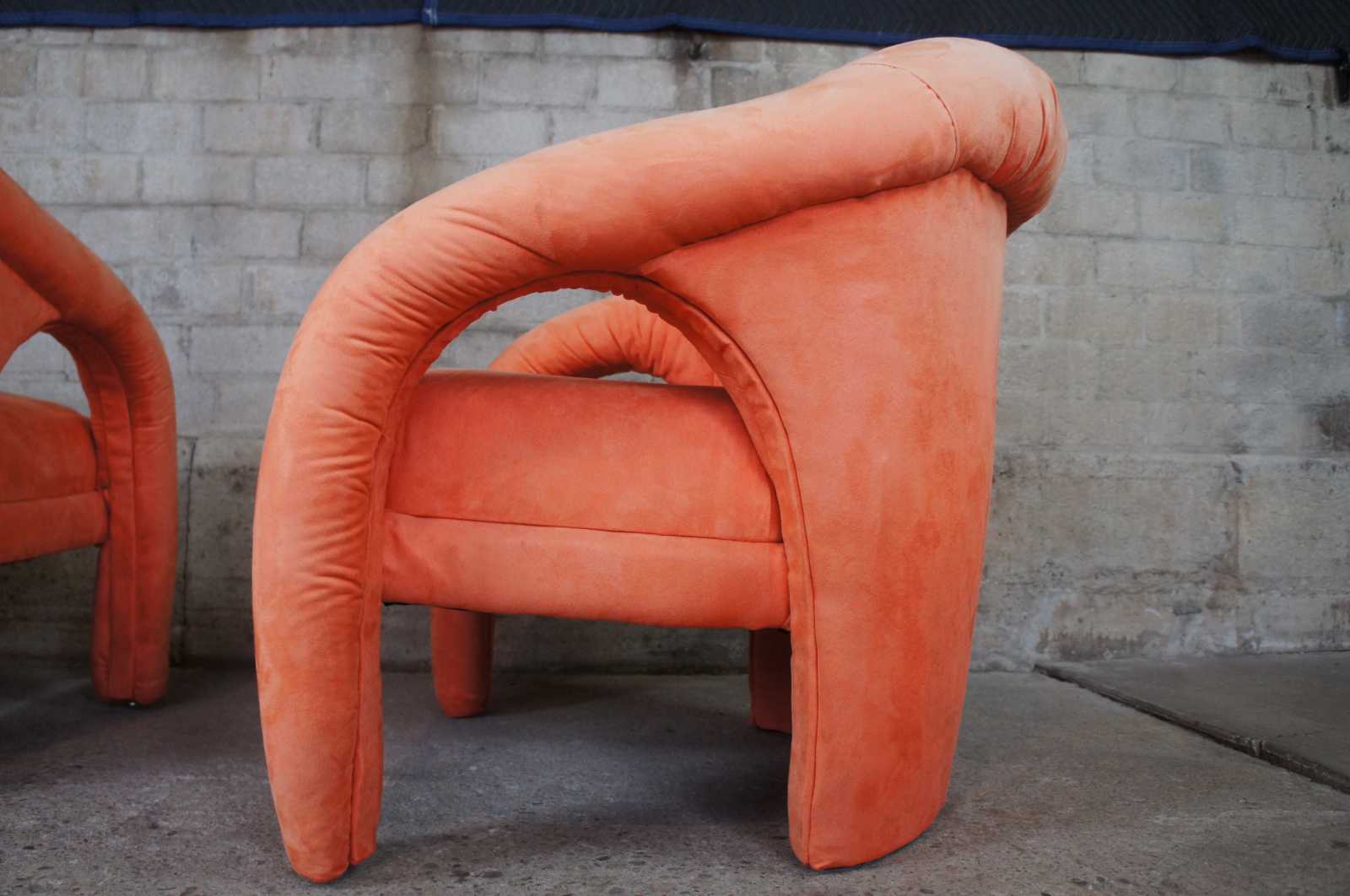 Pair of two post modern sculptural armchairs. Uphostered in peach velvet fabric. Attributed to Vladimir Kagan. Upholstery ranges from a peach to orange. A great addition to any boho chic themed setting.