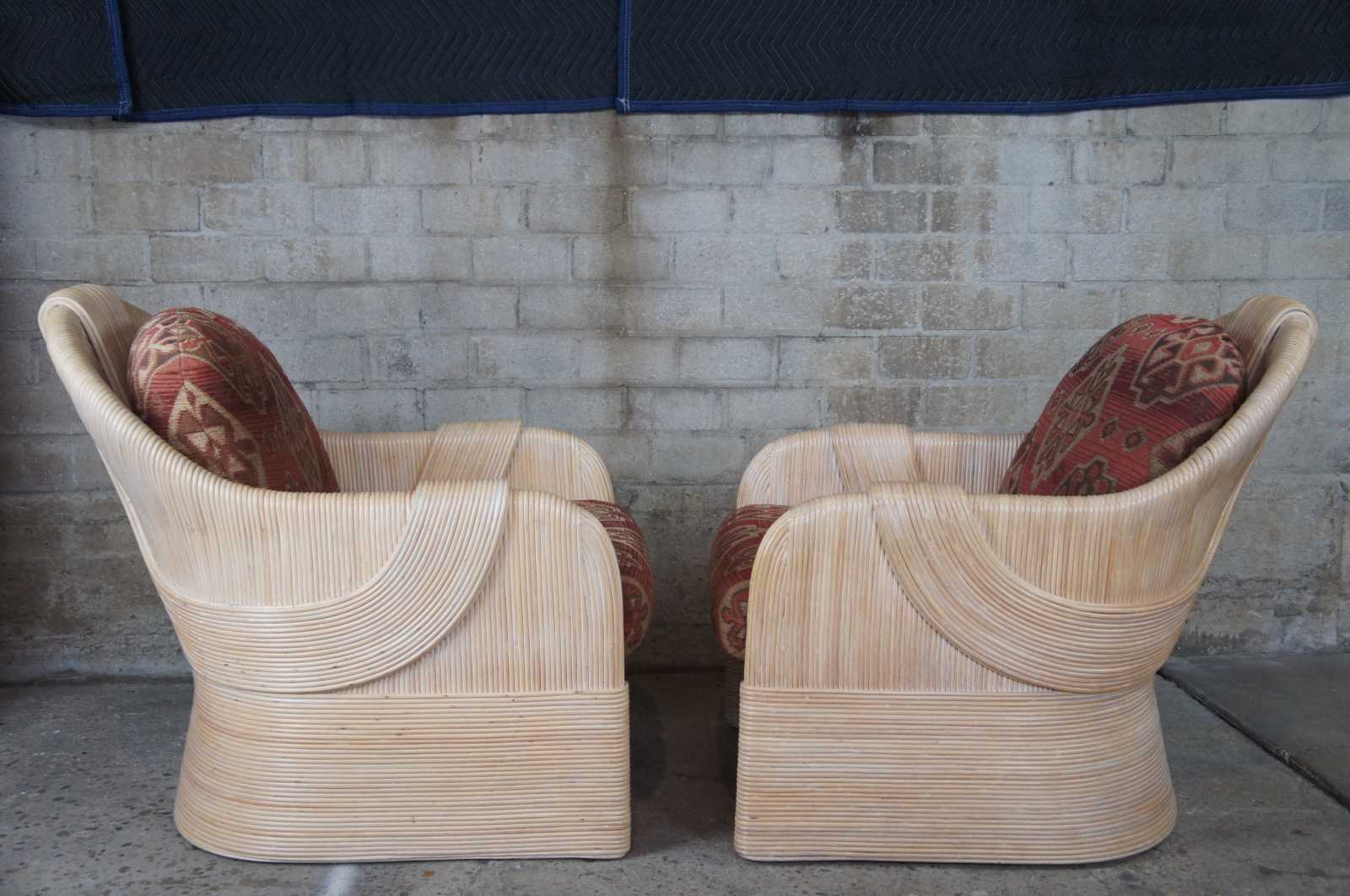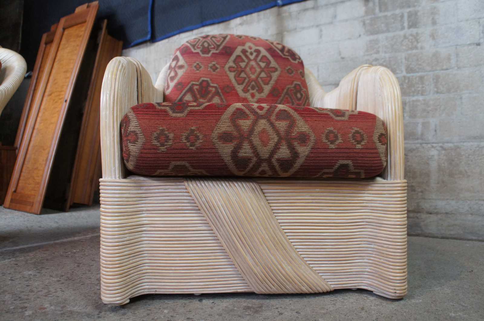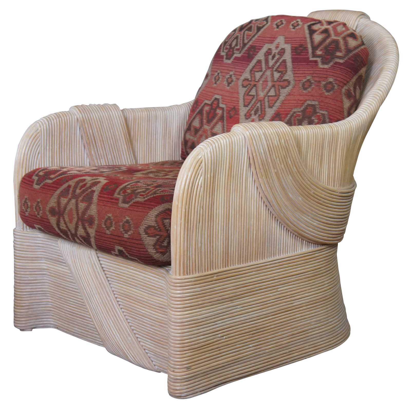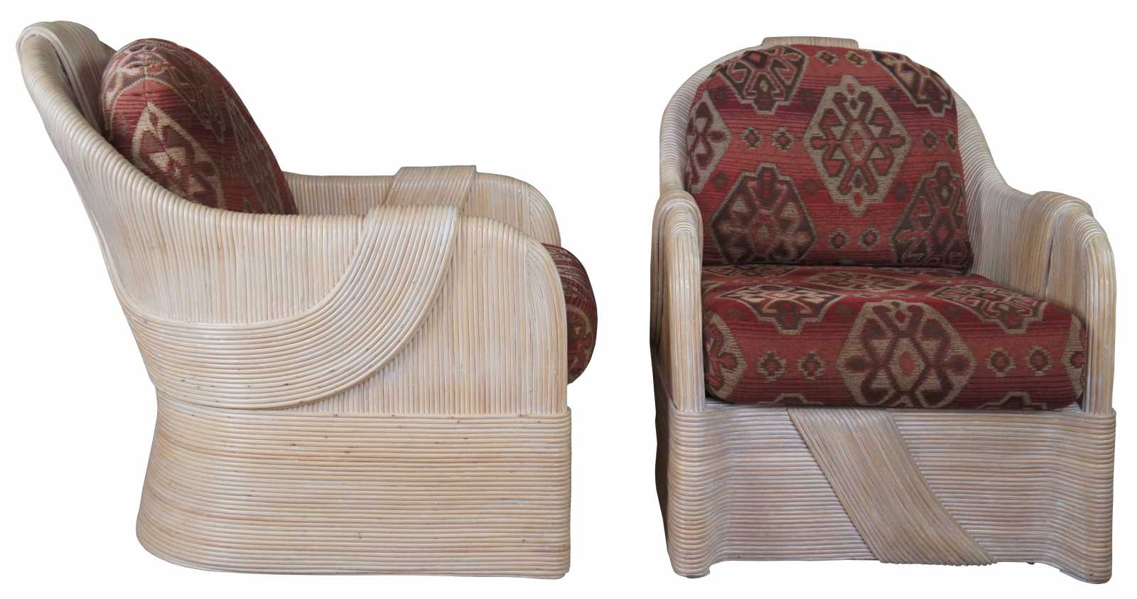 Sculptural pair of split or pencil reed club chairs. Features a red southwestern fabric.