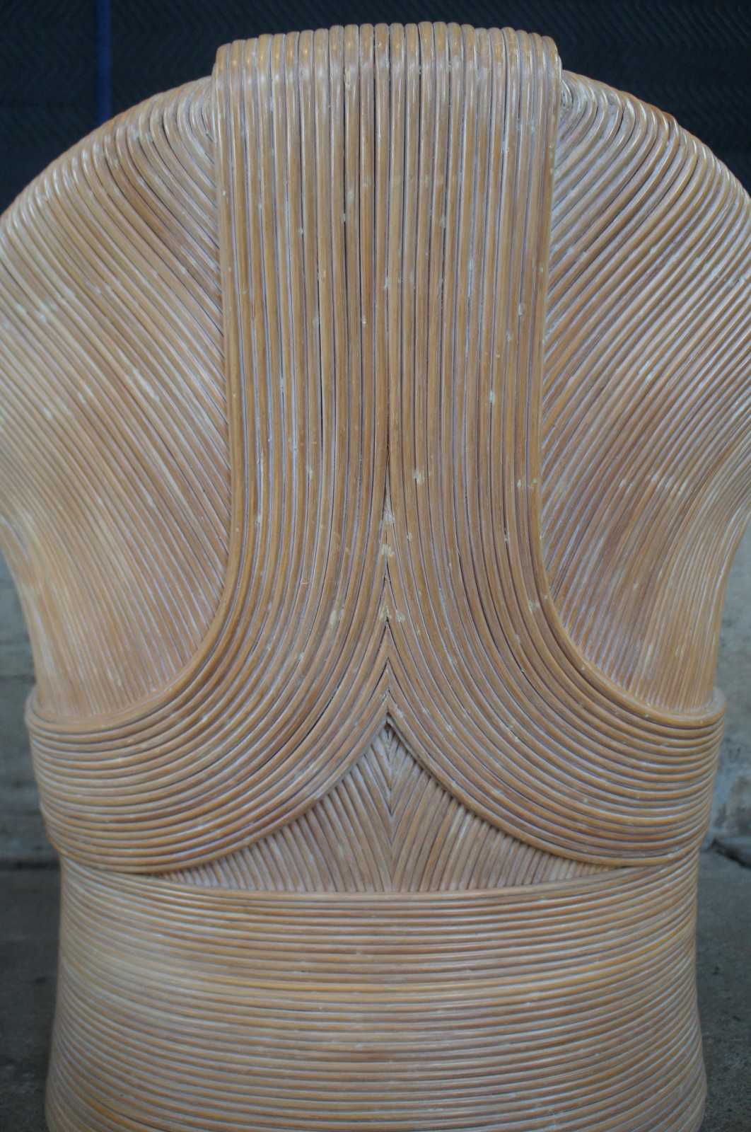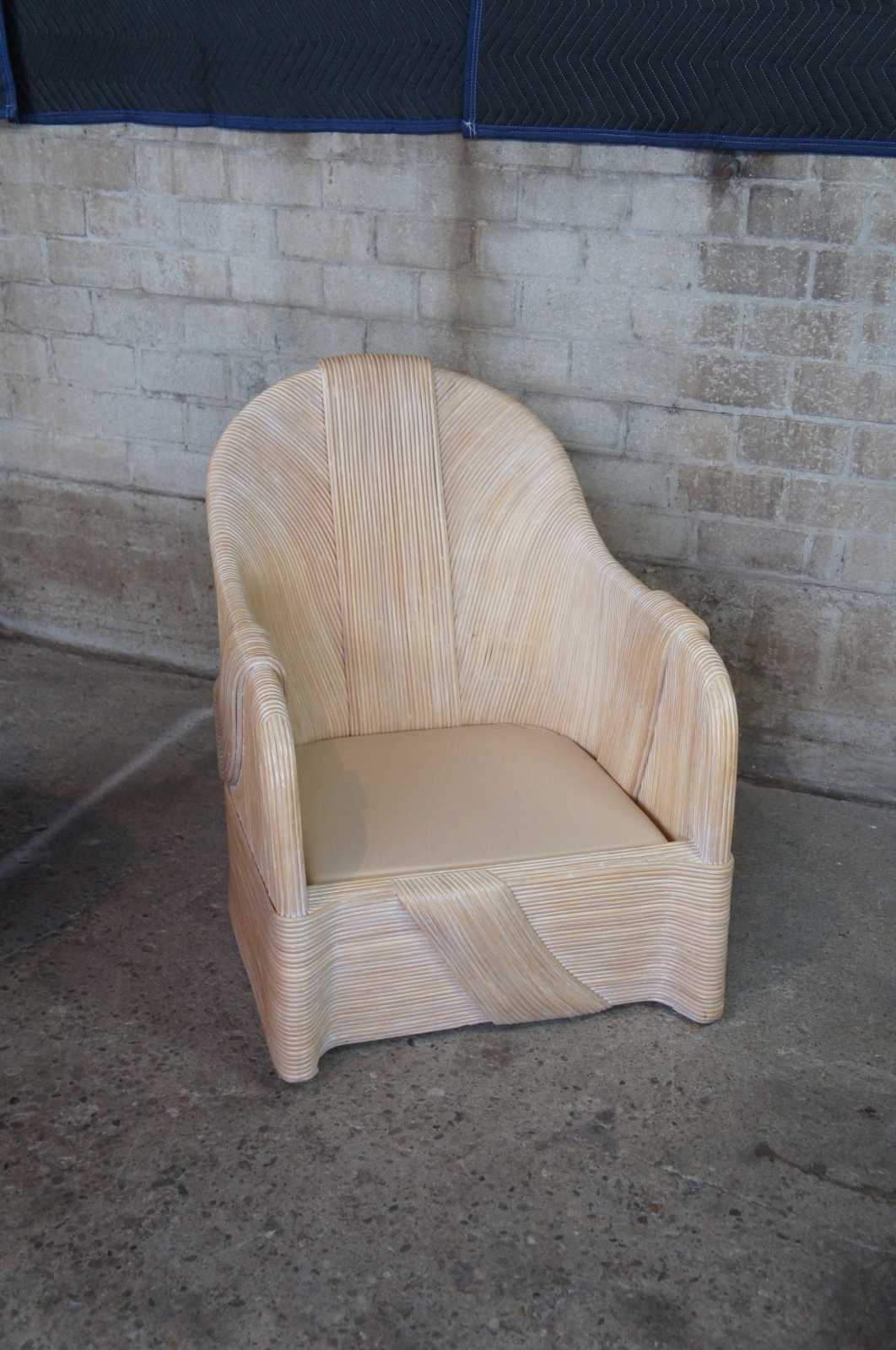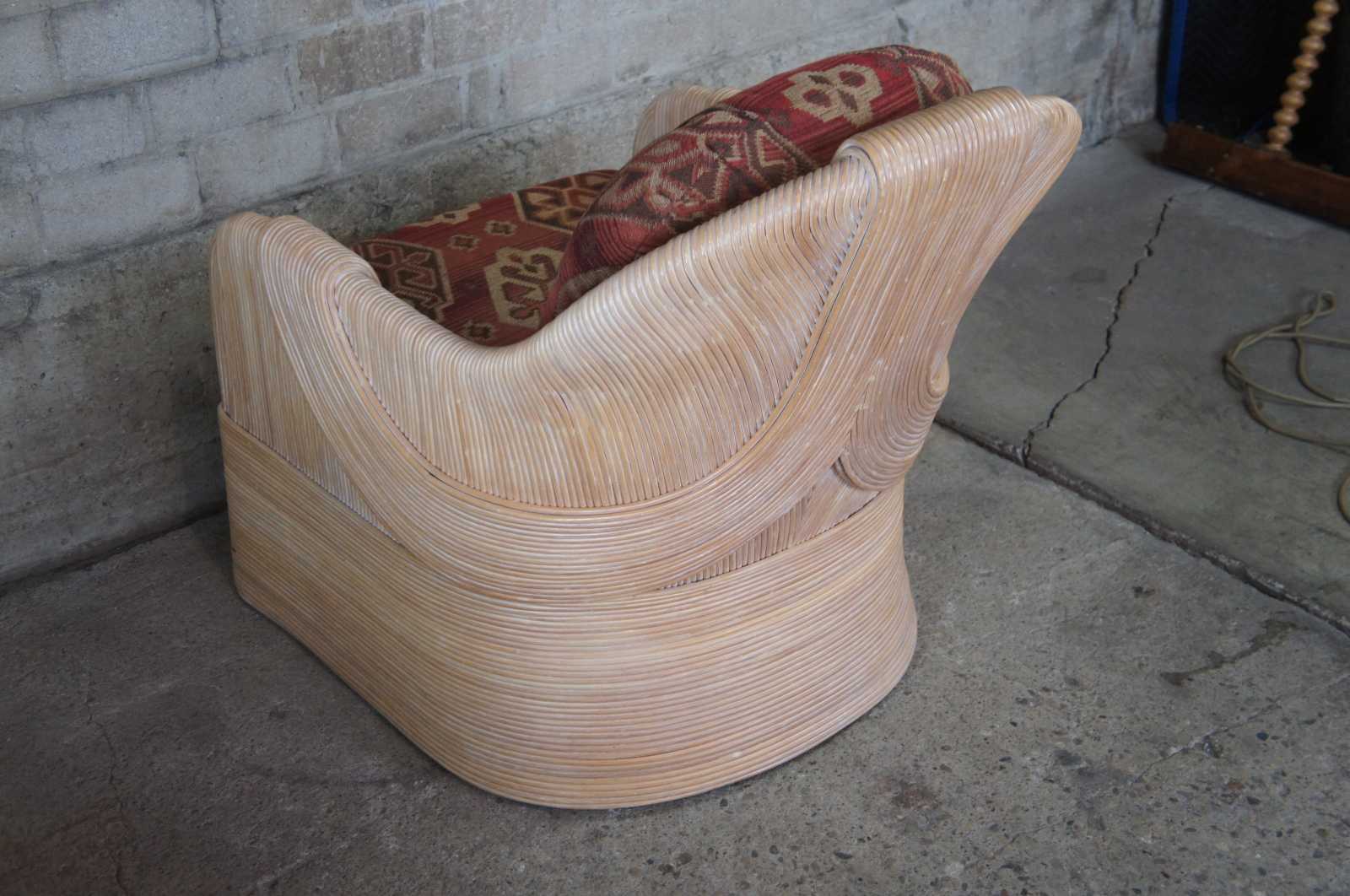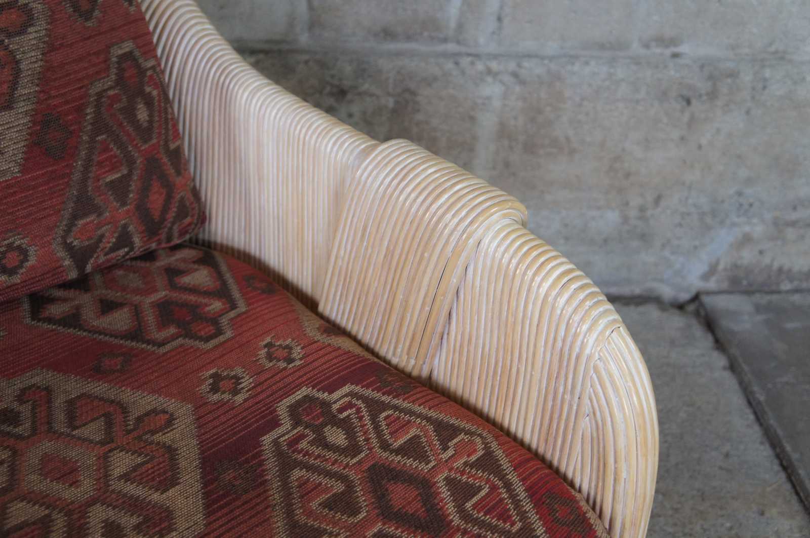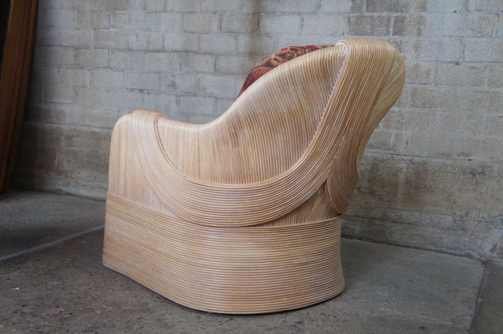 Sculptural pair of split or pencil reed club chairs. Features a red southwestern fabric.