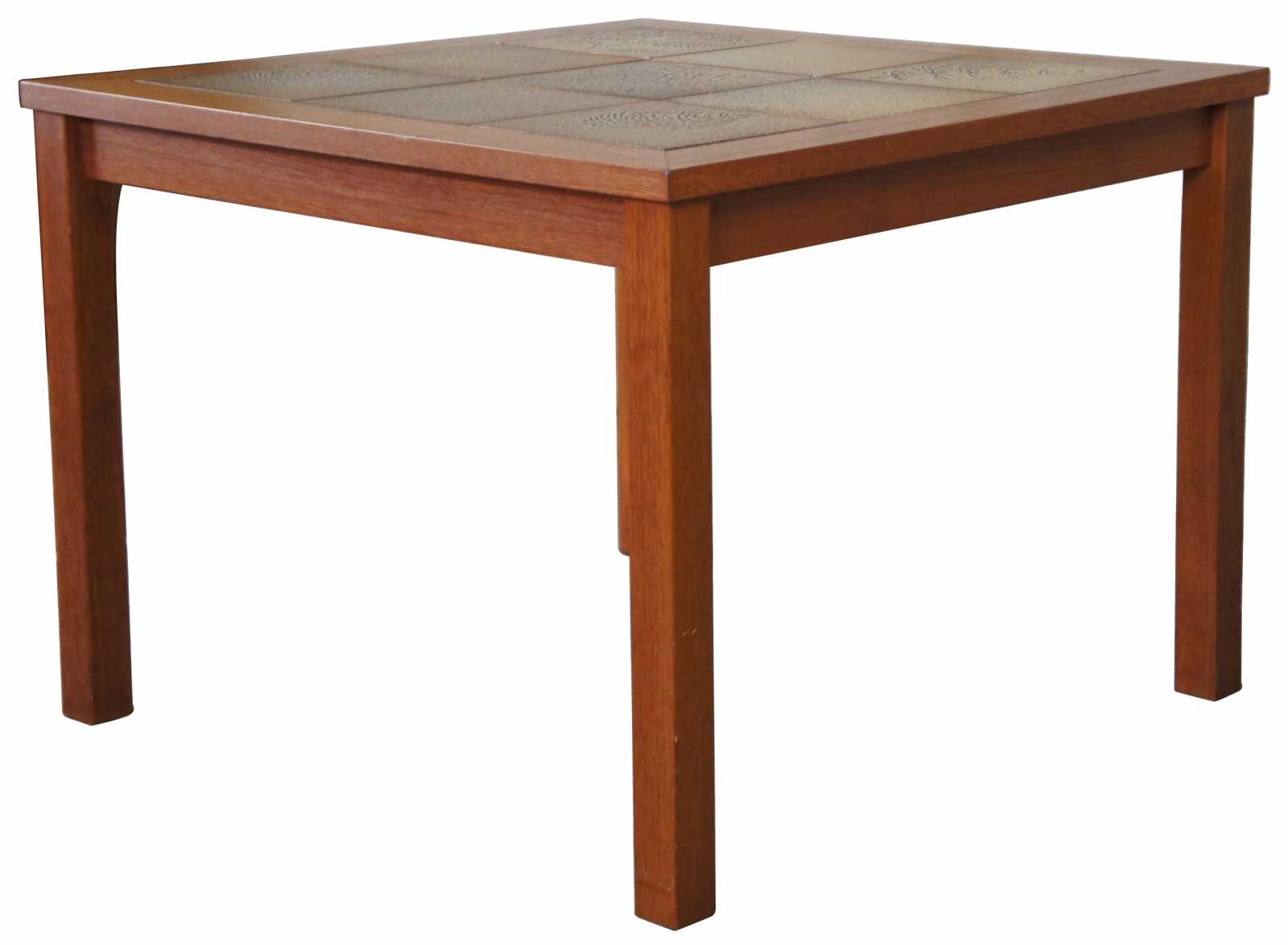 Danish modern square teak side accent table. Made of teak wood featuring a floral / leaf motif tiled top.