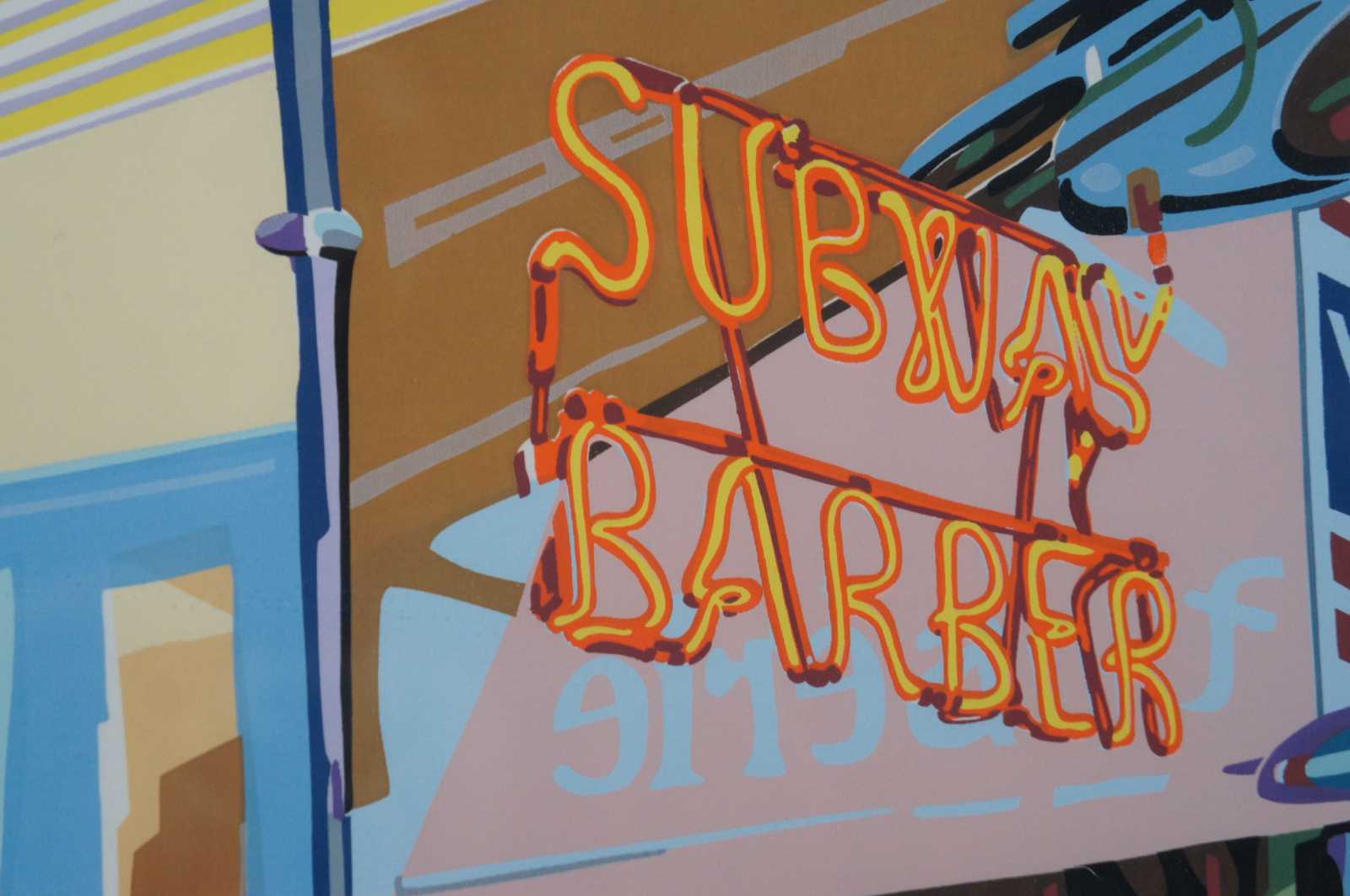 Vintage serigraph print of a small town 1950s style barbershop window with a peddle car titled “Subway Barber” by Randy Owens, 1983, pencil signed and numbered 47/99.