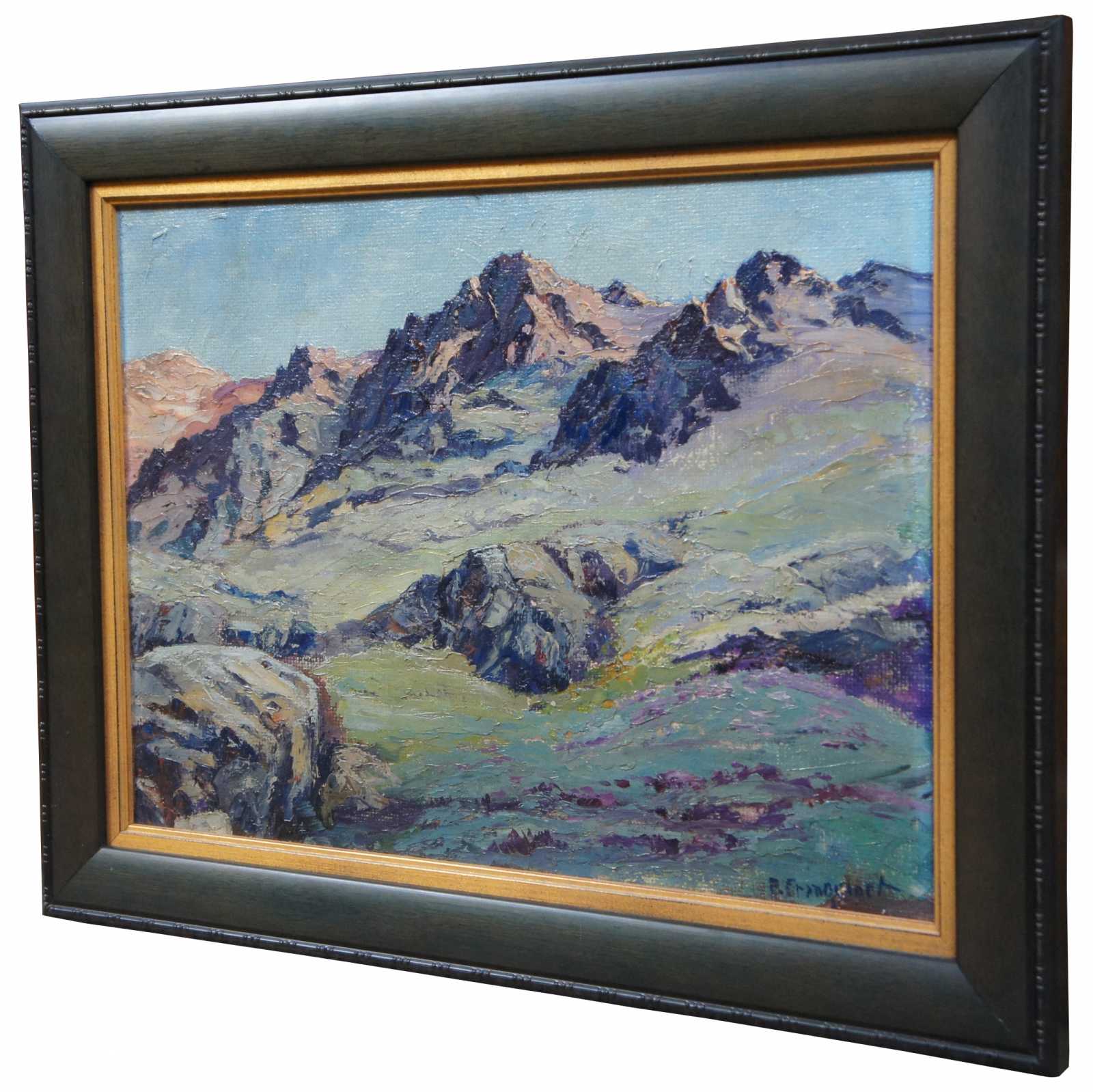 Antique impressionist oil on masonite landscape painting by Eugene Franquinet, “Crags, Black Rock Looking North from Cliff Creek Canyon.” Signed lower right corner; signed and titled on verso (currecntly concealed under framing paper).