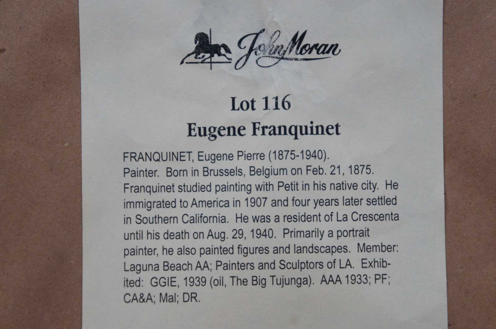 “Eugene Pierre Franquinet was born in Brussels, Belgium on February 21, 1875. Franquinet studied painting with Petit in his native city. He immigrated to America in 1907 and four years later settled in Southern California. He was a resident of La Crescenta until his death on August 29, 1940. Primarily a portrait painter, he also painted figures and landscapes.”