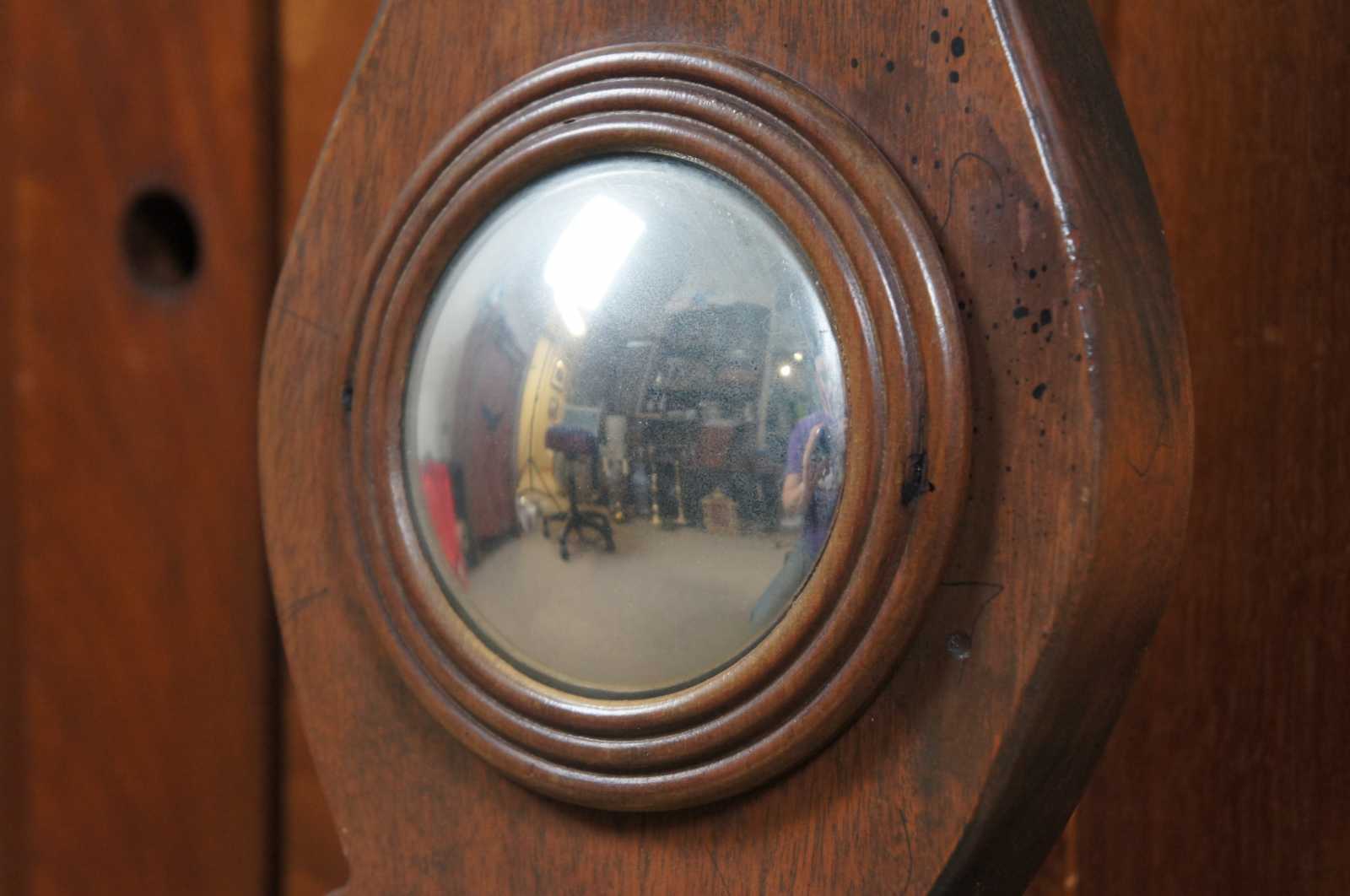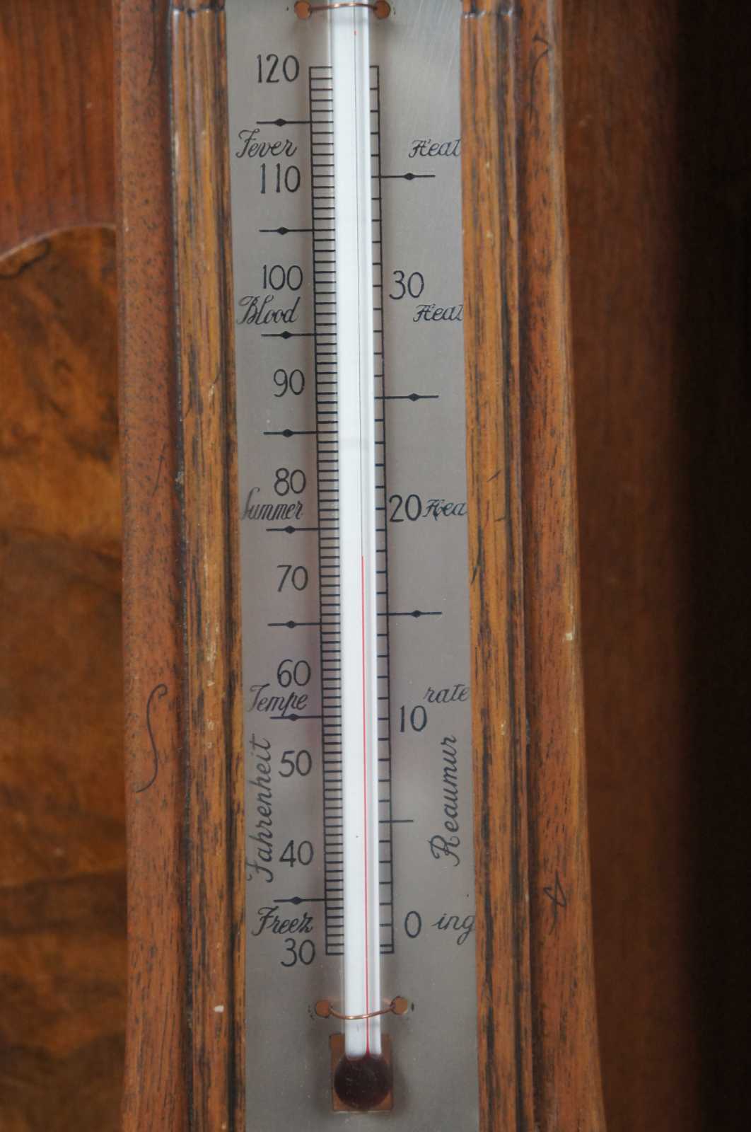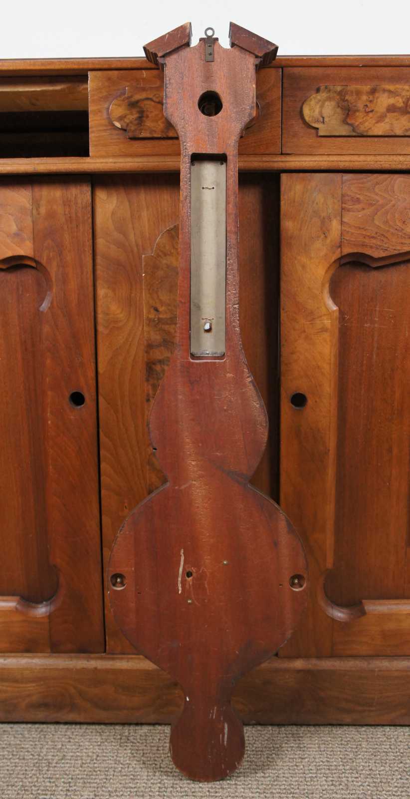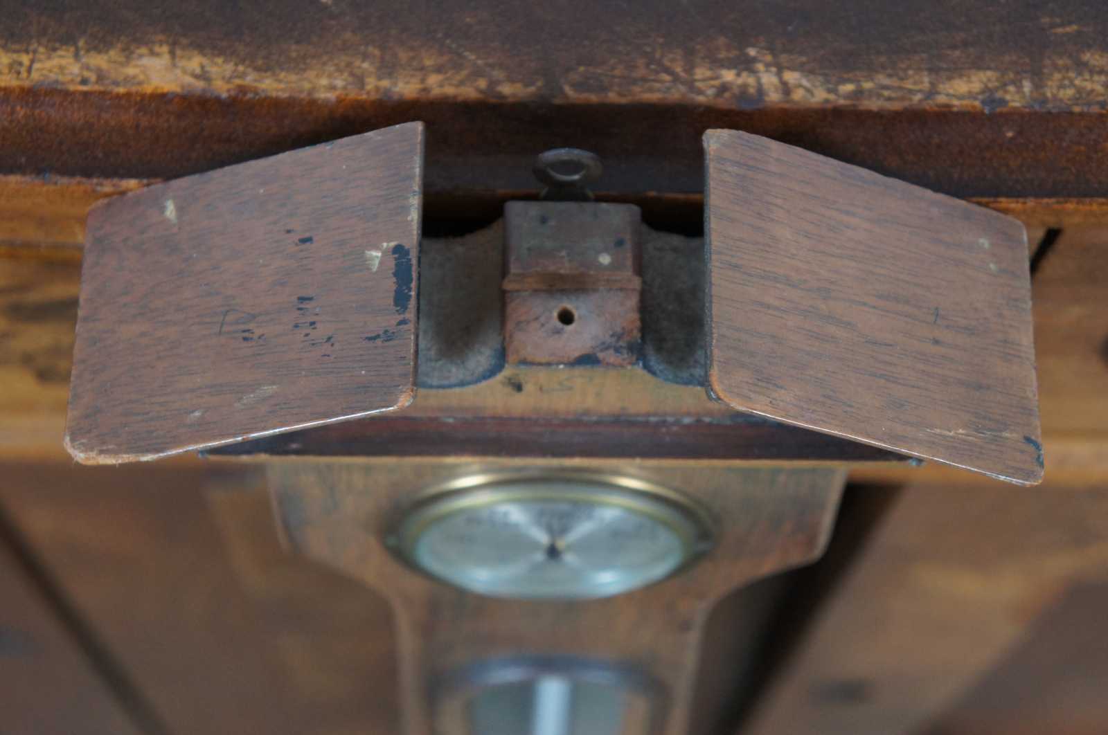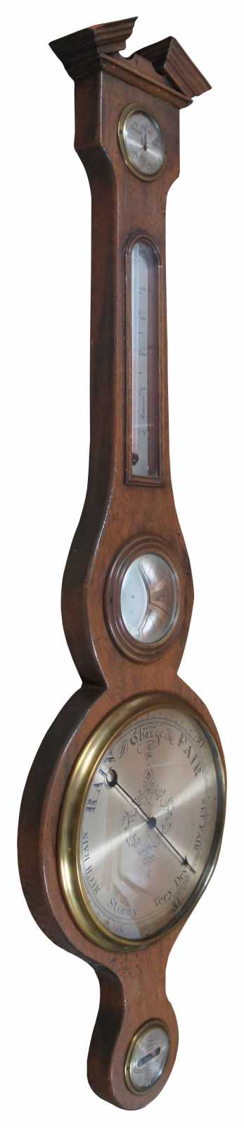 Antique banjo style wall hanging wood cased barometer and thermometer with Federal style crest and brass face.