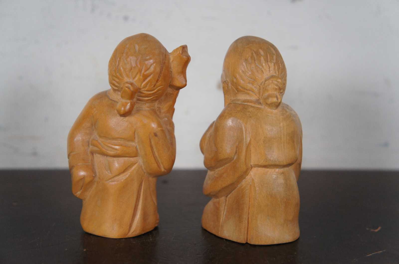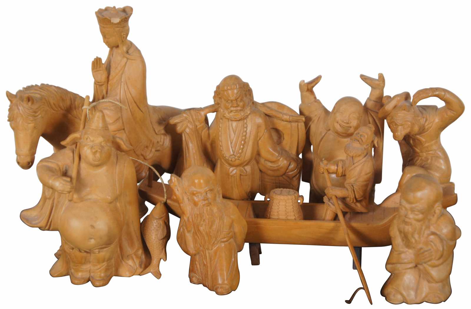 Lot of eight assorted Chinese figurines, hand carved in Taipei, Taiwan. Included: Laughing Buddha (Hotei), Sanxing dieties Fuxing and Shouxing, “Journey to the West” characters Sun Wukong (Monkey King), Zhu Bajie (Pigsy), Tang Sanzang (Tripitaka) and the White Dragon Horse, Sha Wujing (Sandy), and a fisherman in a boat.