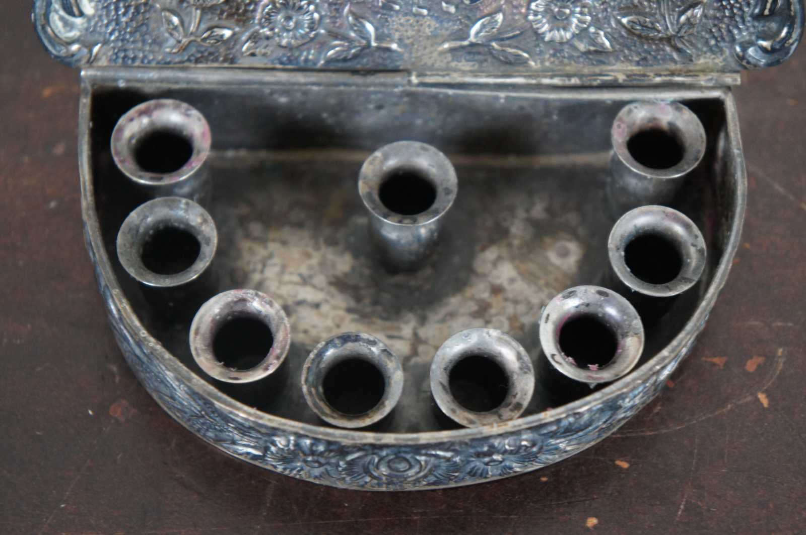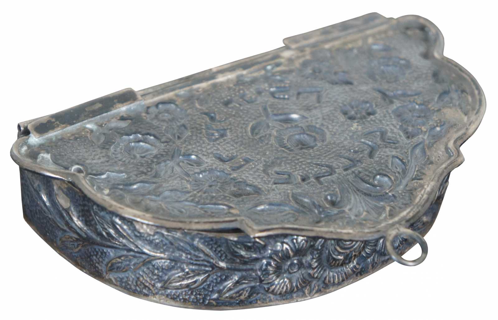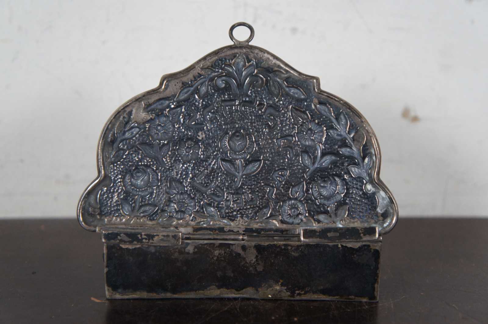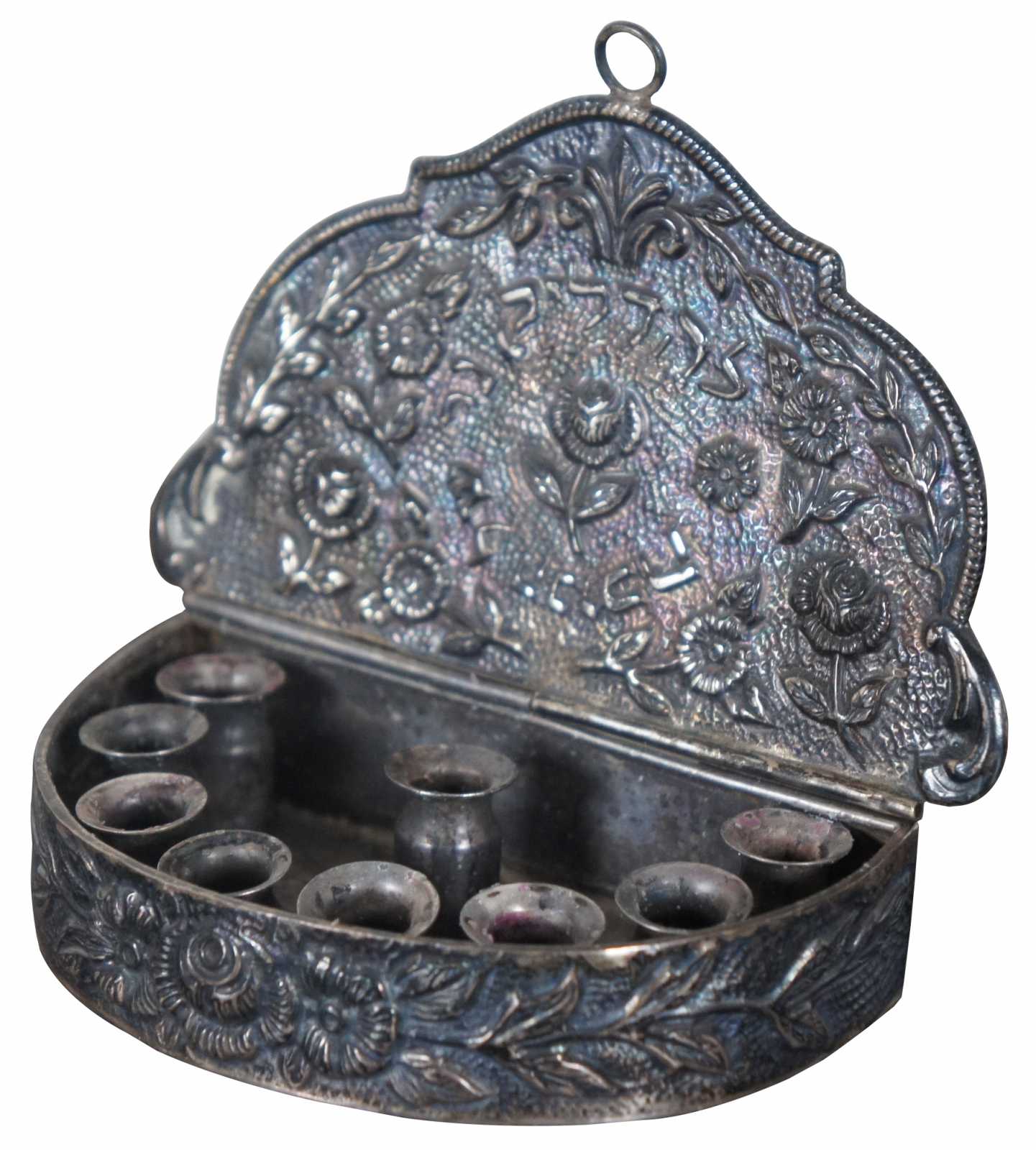 Antique repousse silver miniature Channukah menorah, a small demilune box with 9 small taper holders including the shamash, decorated with flowers, including a small hook at the top edge of the lid for wall hanging.