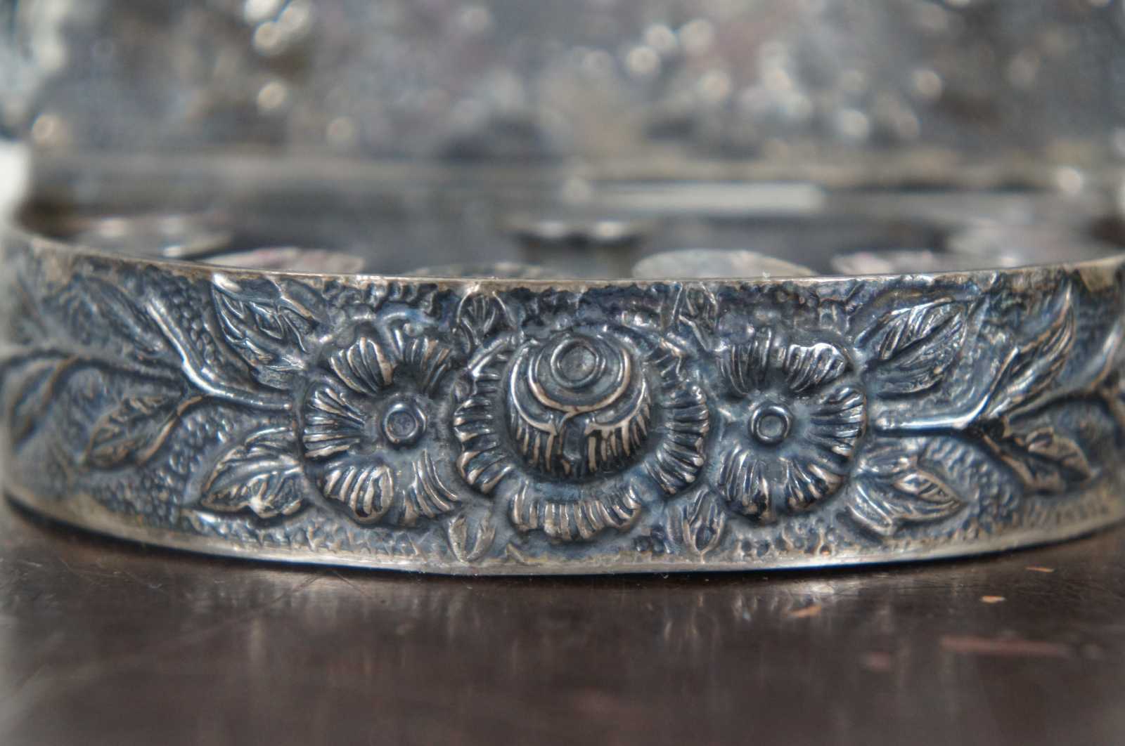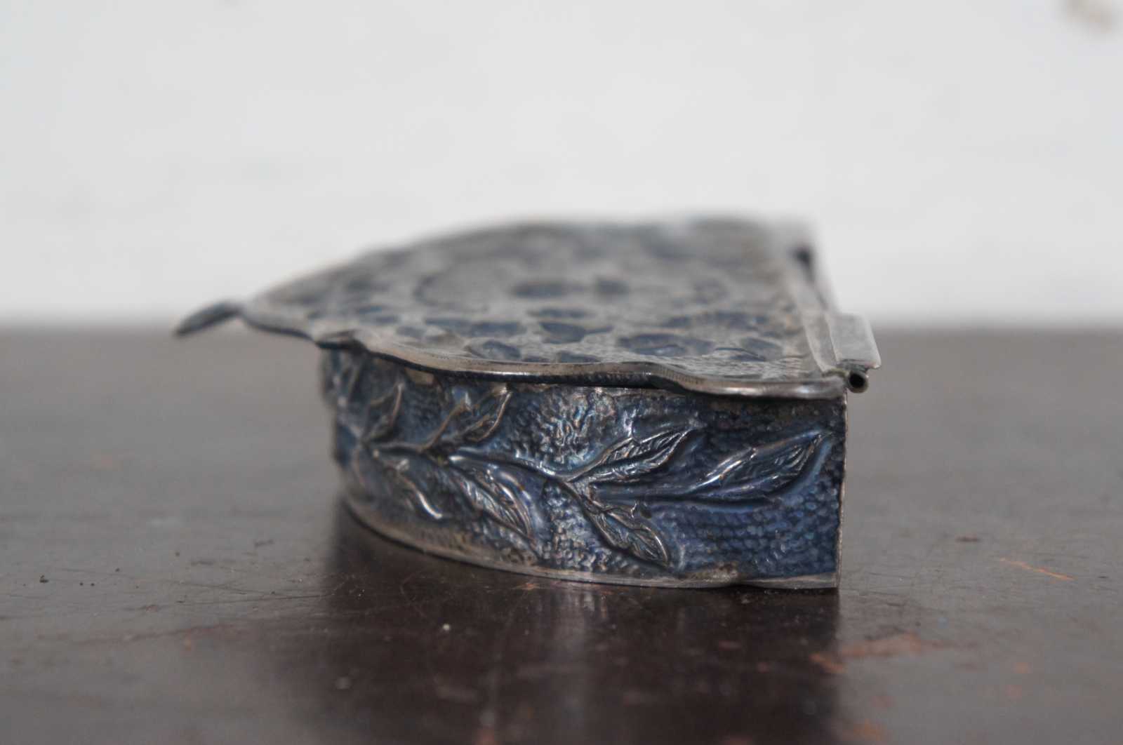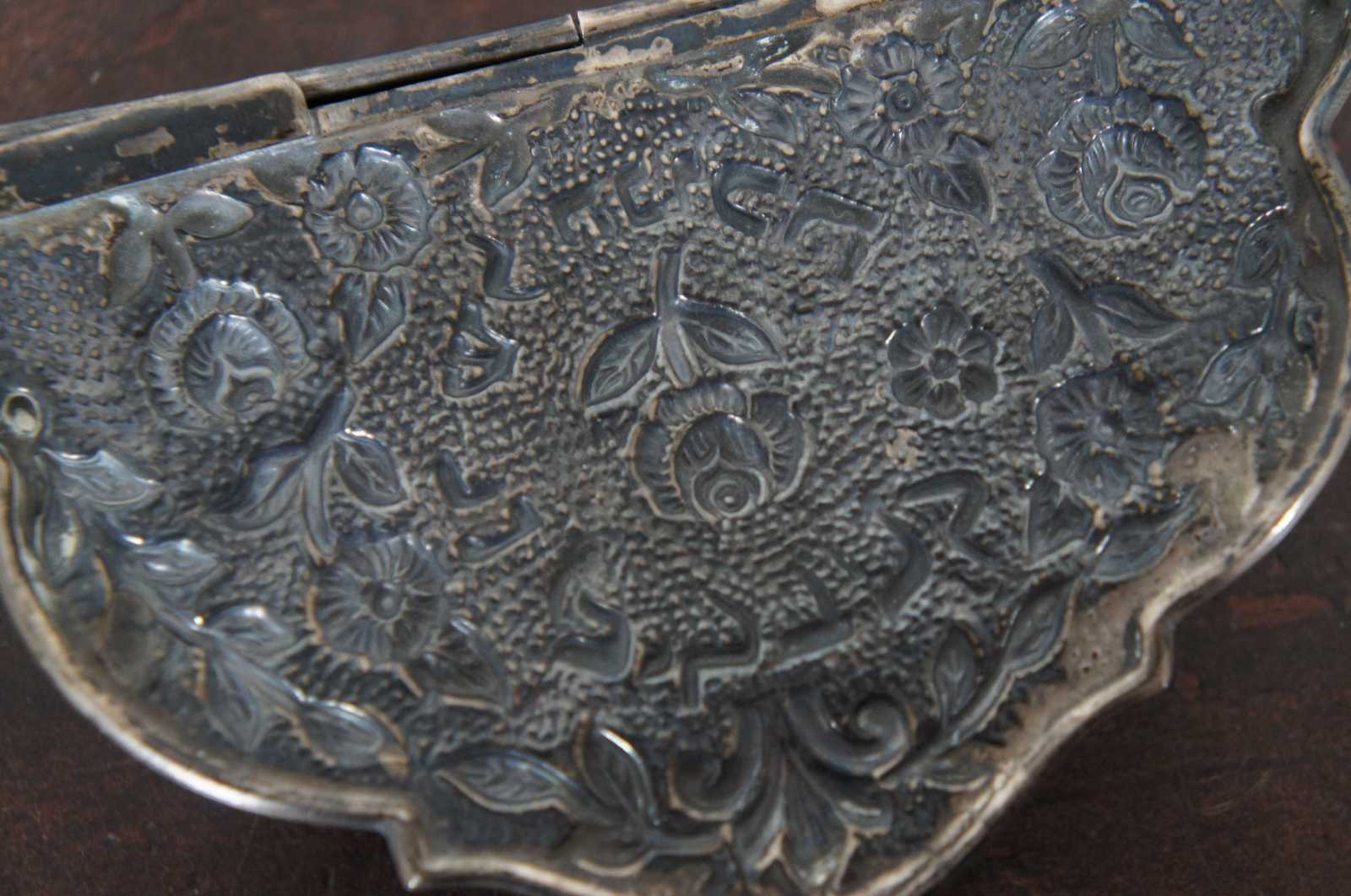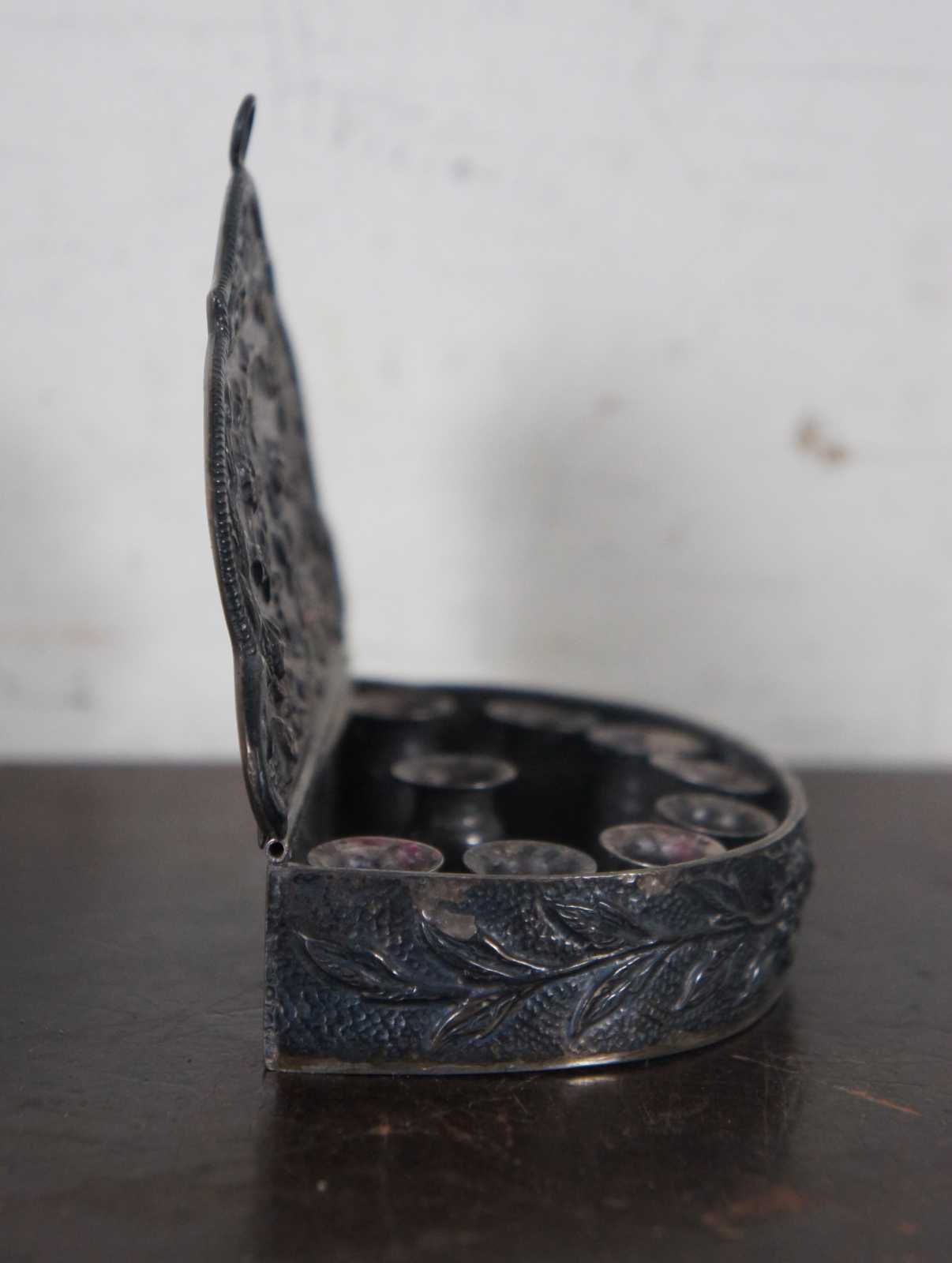 Antique repousse silver miniature Channukah menorah, a small demilune box with 9 small taper holders including the shamash, decorated with flowers, including a small hook at the top edge of the lid for wall hanging.