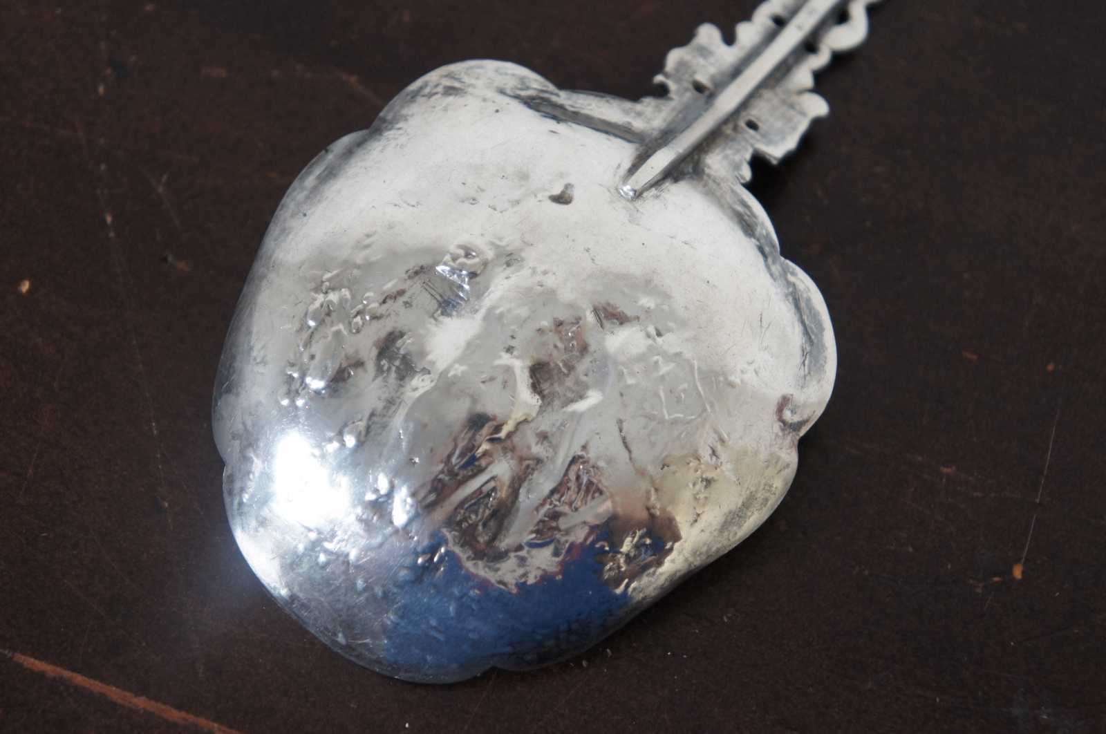 Antique German figural silver spoon with ornate open work handle of leaves, dragons, and Green Man or Baccus face and a scene of soldiers in the bowl.