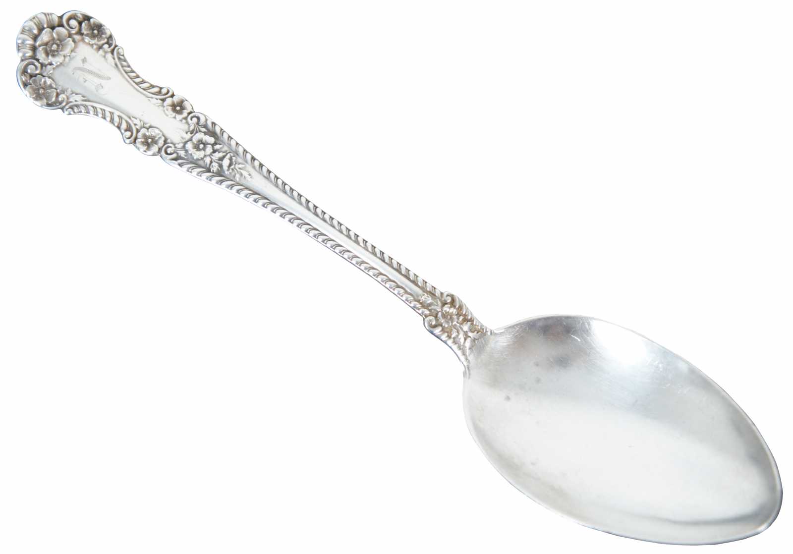 Antique Gorham sterling silver .925 serving spoon in the 1899 Cambridge pattern, monogrammed with an N and the year 1904.