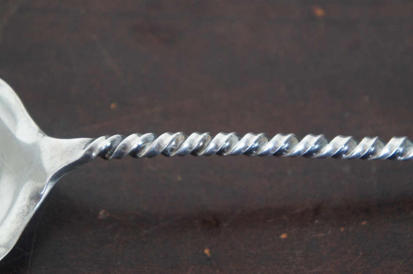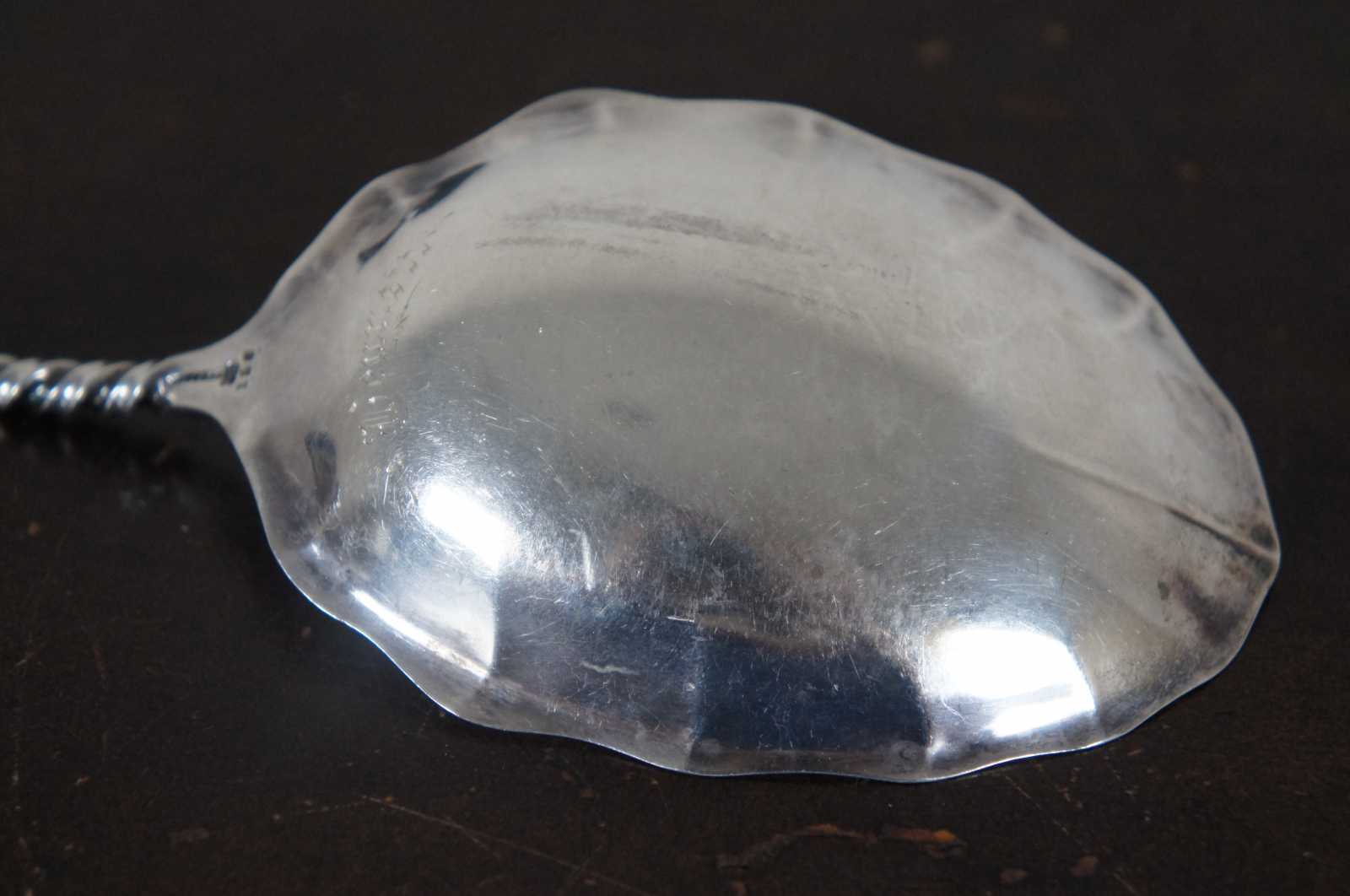 Antique sterling silver 925 serving spoon with twisted handle and lightly scalloped bowl, engraved on the back with the name “Bennett.” Sterling 128.