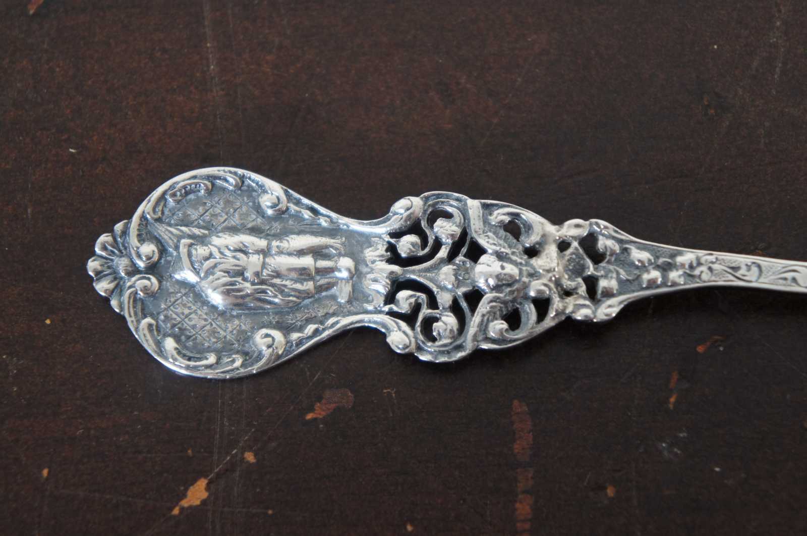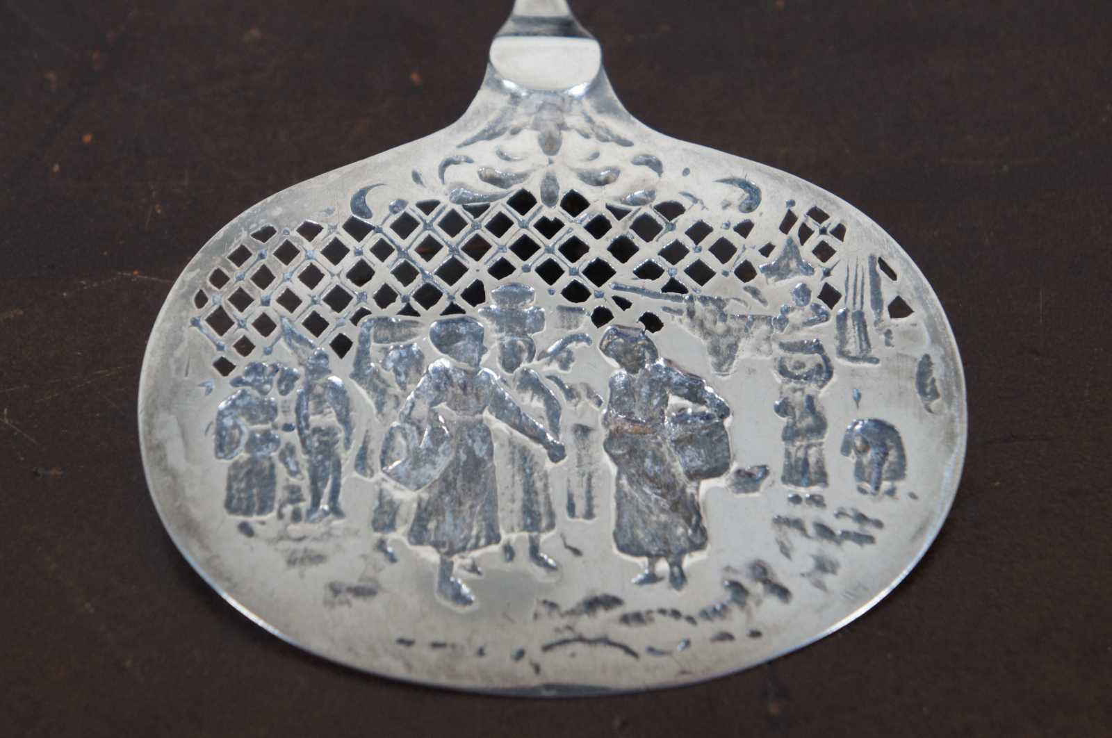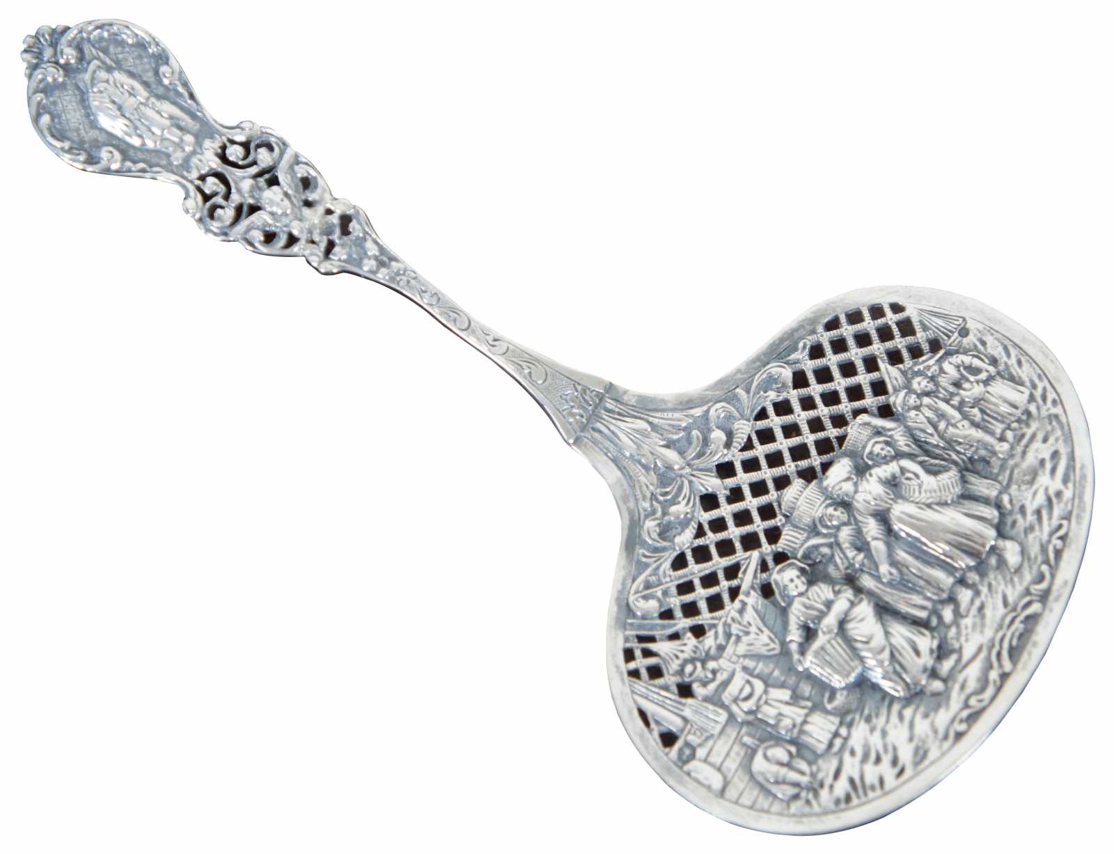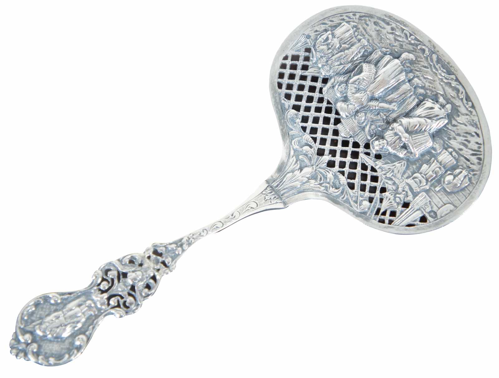 Antique German silver open work repousse reticulated bon bon / caddy / tomato server with a scene of peasant women on the bowl and a handle decorated with swirling leaves and a figure.