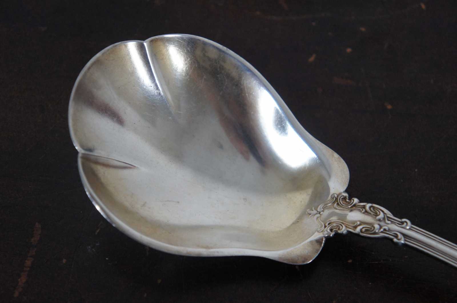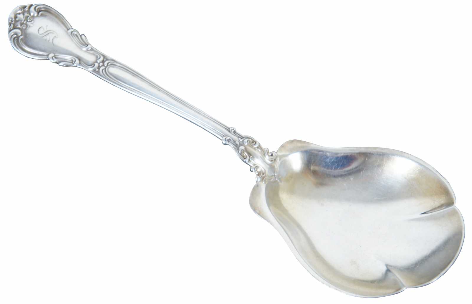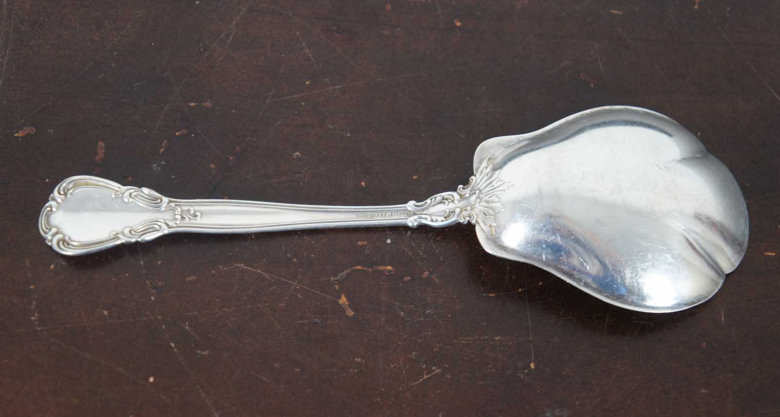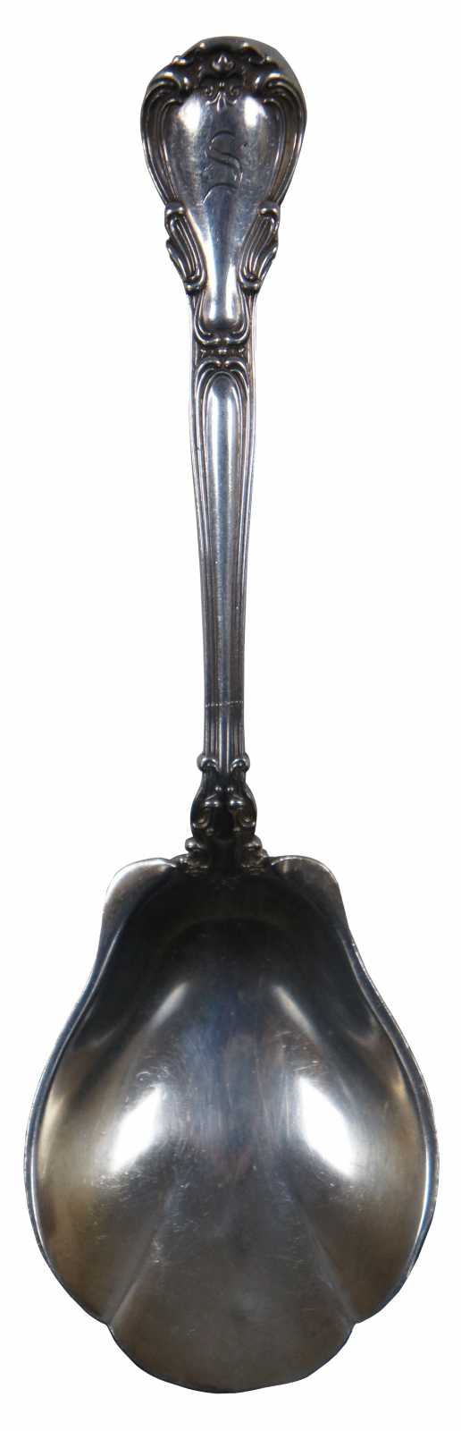 Antique Gorham sterling silver 925 berry / citrus serving spoon in the Chantilly pattern, monogrammed with an S.