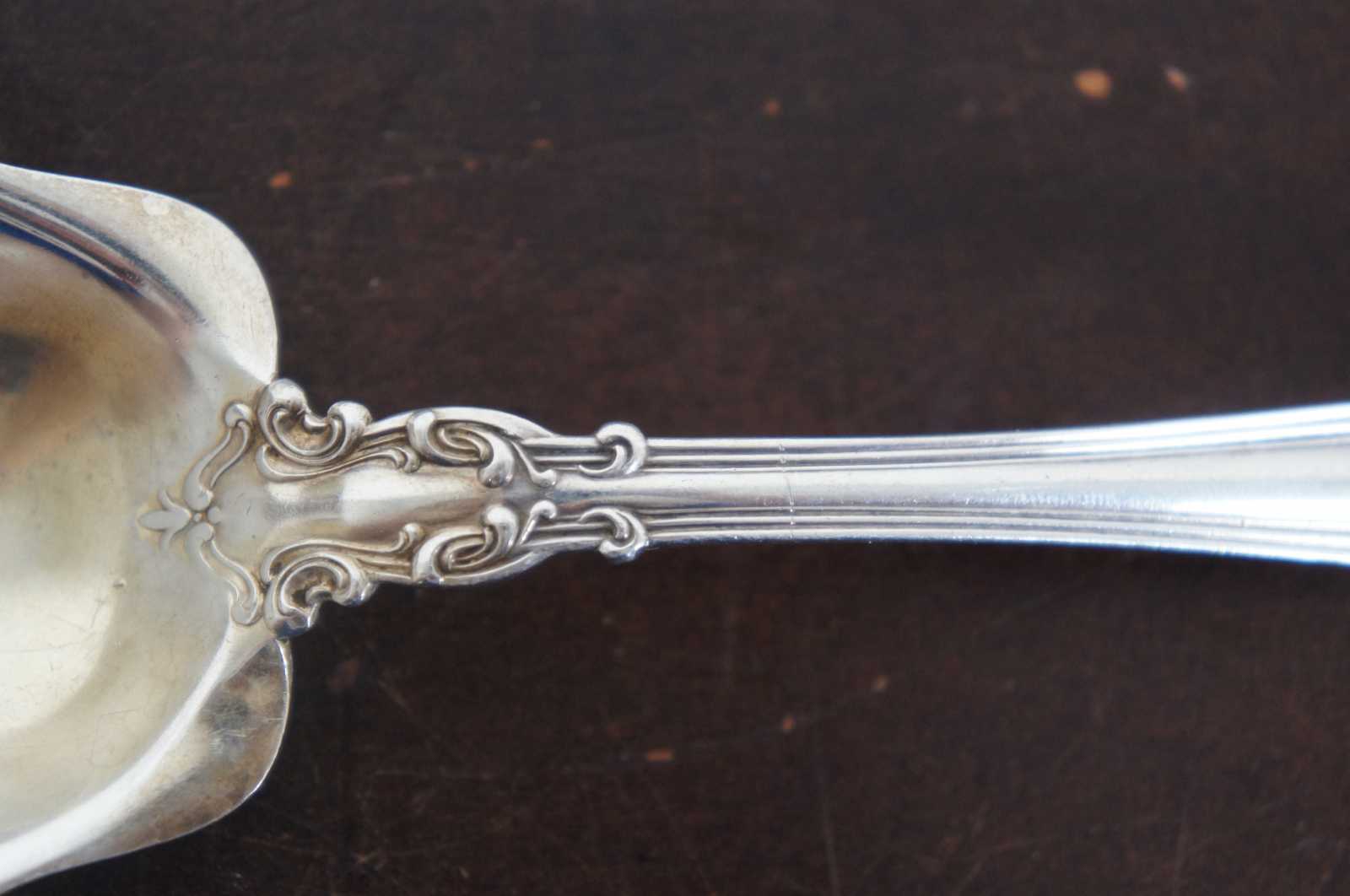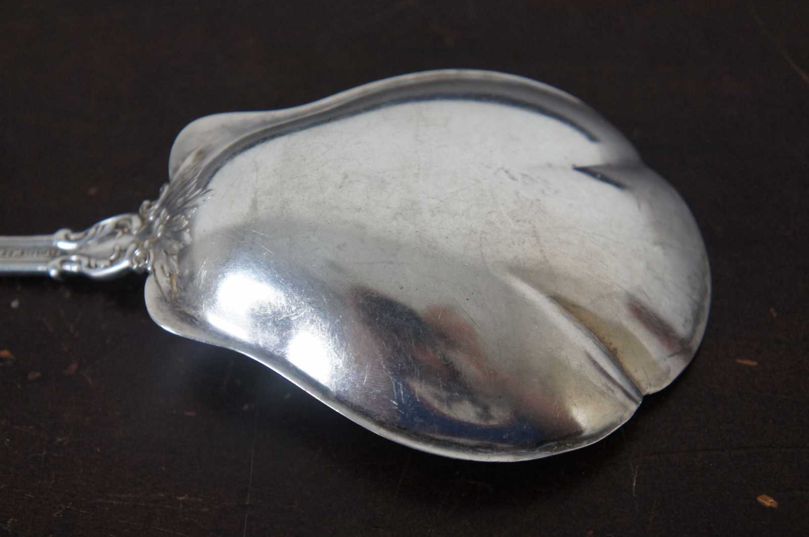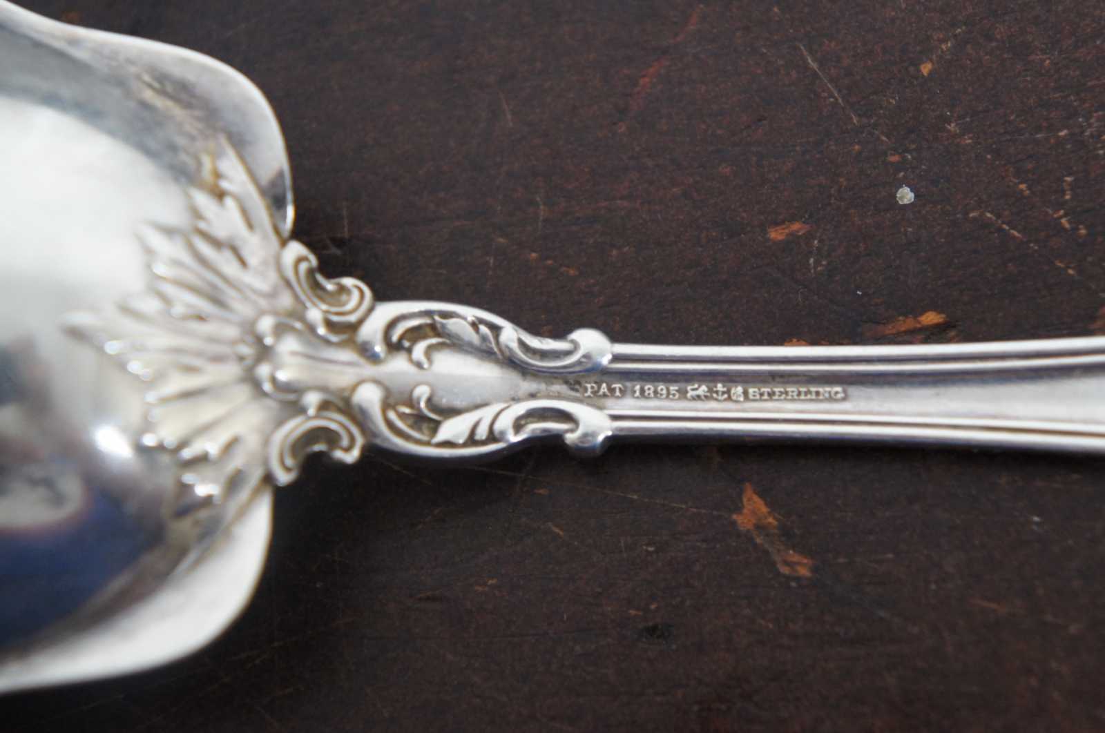 Antique Gorham sterling silver 925 berry / citrus serving spoon in the Chantilly pattern, monogrammed with an S.