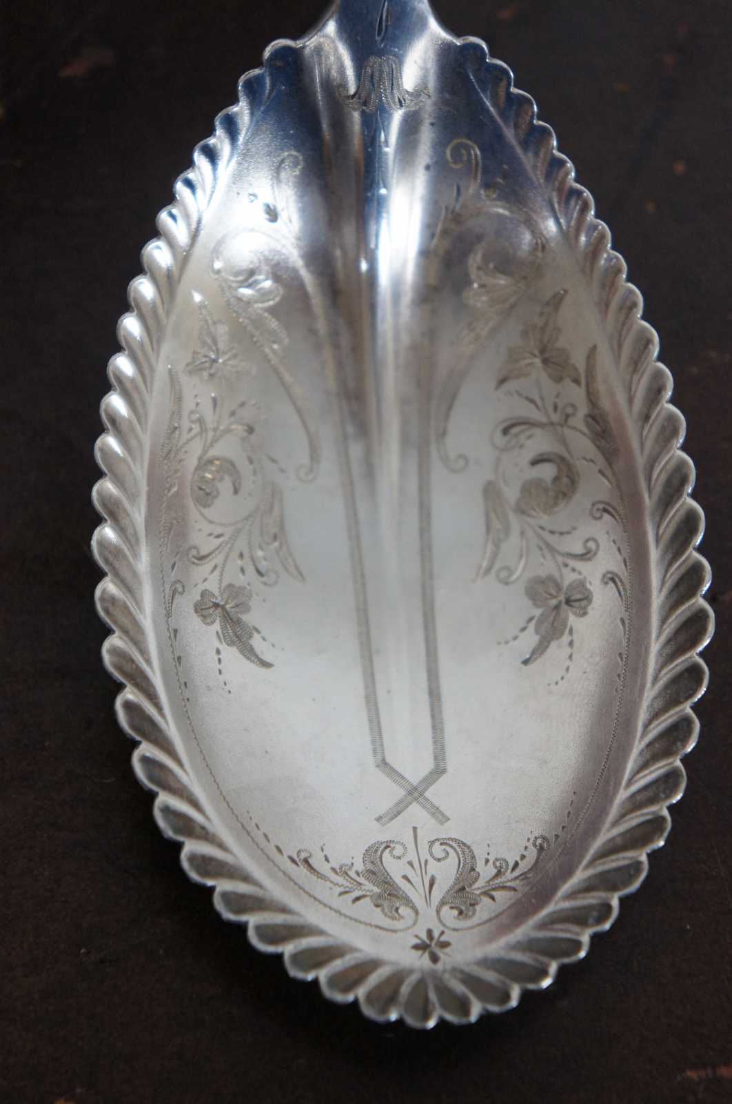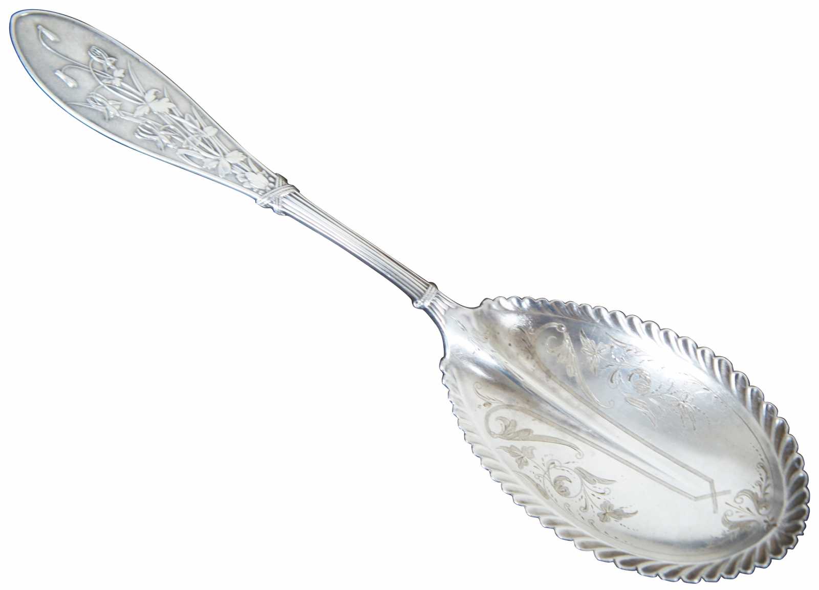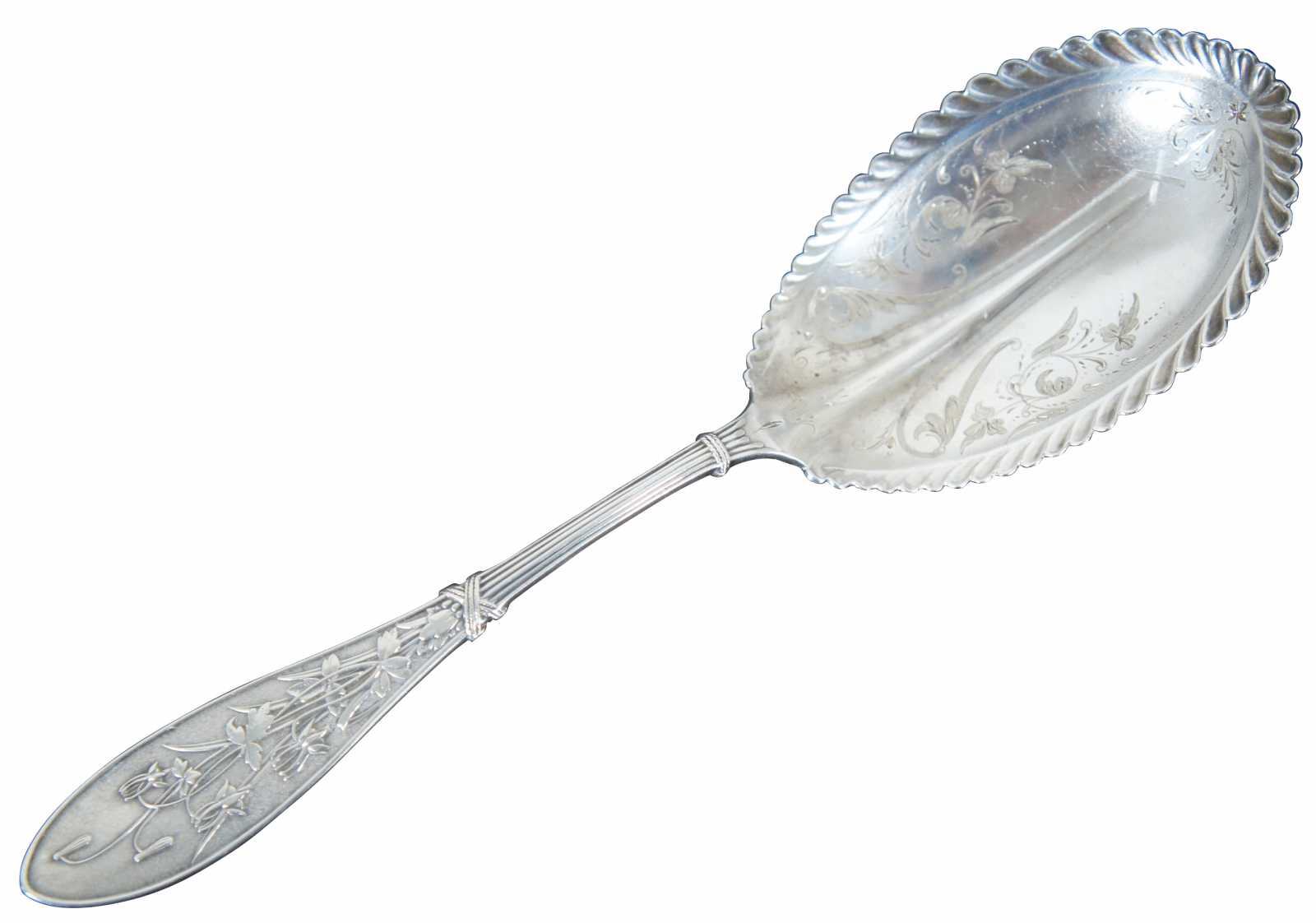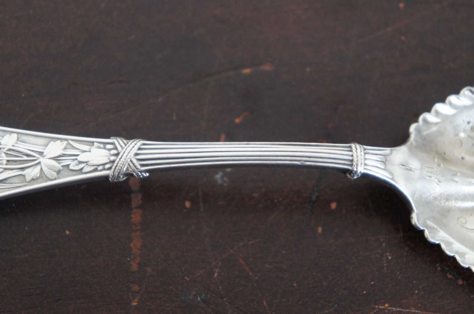 Antique W.W. Child Whiting Manufacturing Company sterling silver .925 casserole berry or citrus spoon in the 1870 Honeysuckle pattern with floral etched and scallop edged bowl; monogrammed “AAB.” Similar to the Arabeqsque pattern.