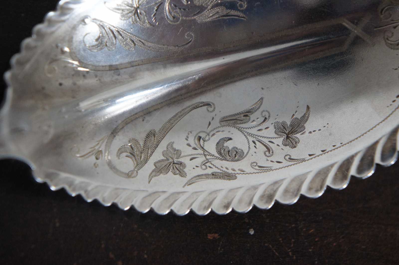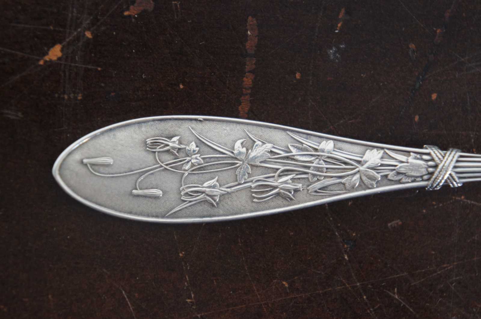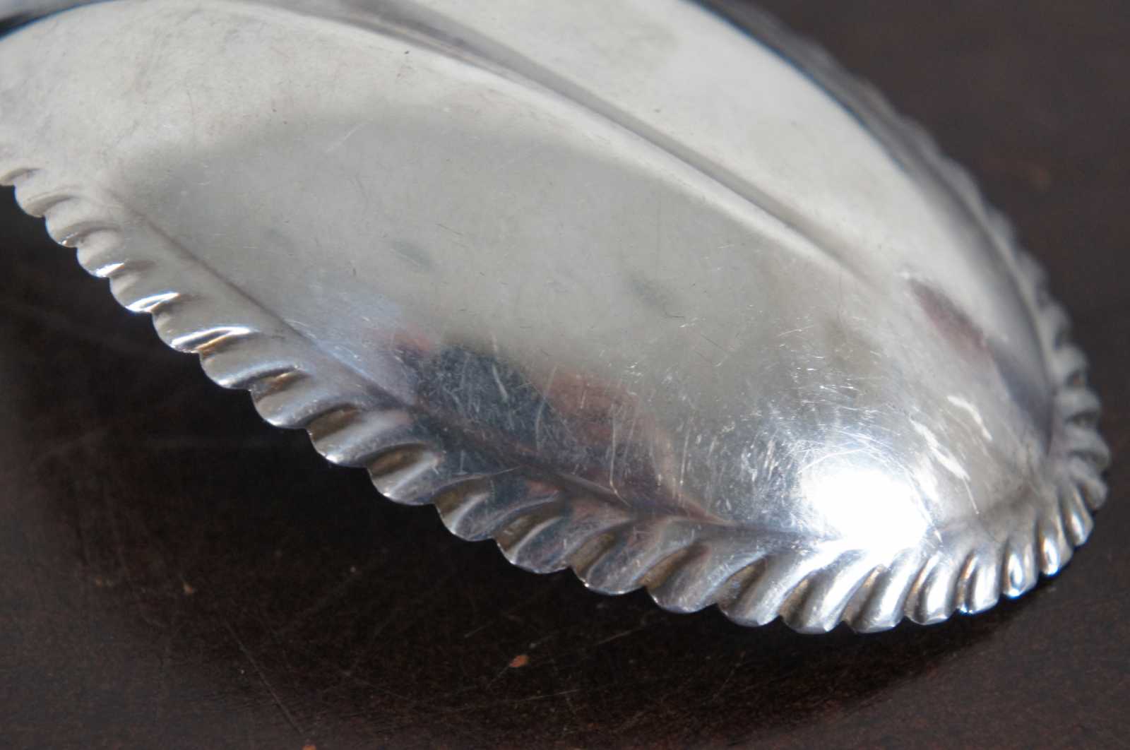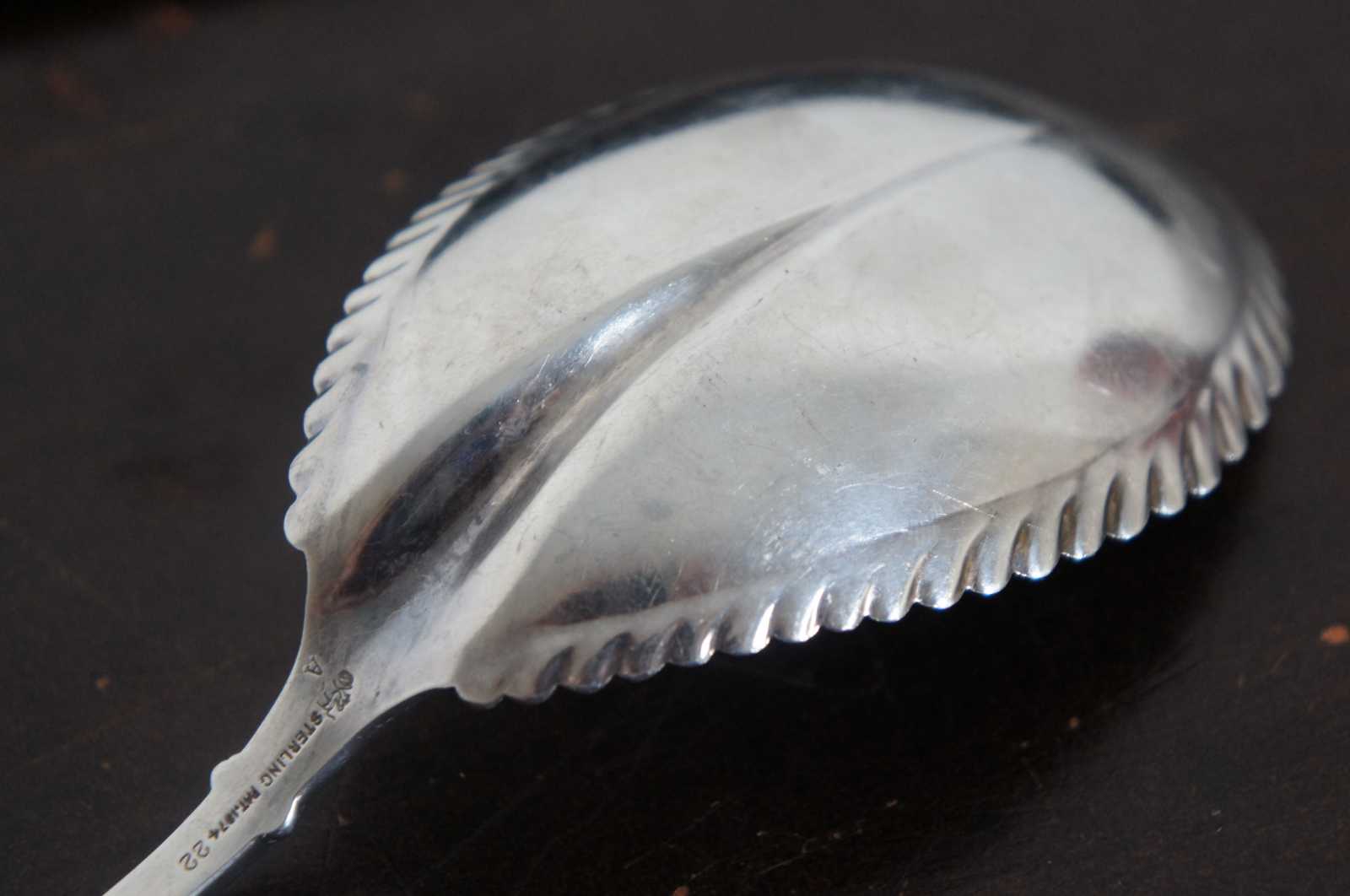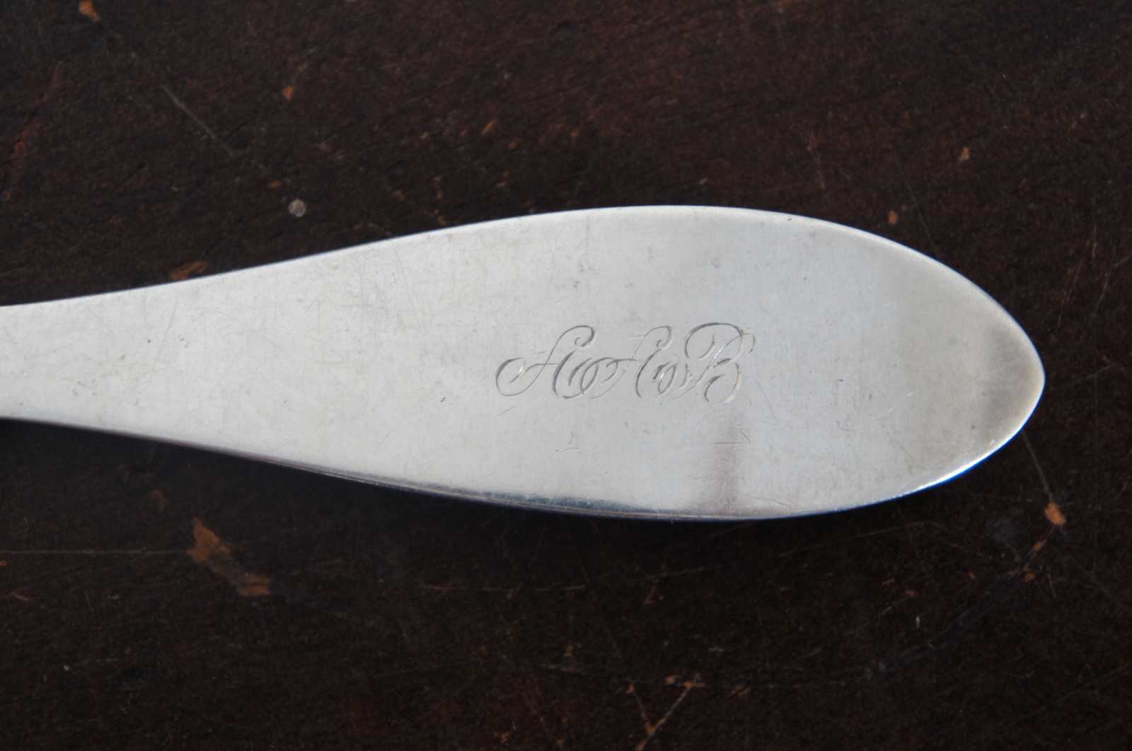 Antique W.W. Child Whiting Manufacturing Company sterling silver .925 casserole berry or citrus spoon in the 1870 Honeysuckle pattern with floral etched and scallop edged bowl; monogrammed “AAB.” Similar to the Arabeqsque pattern.