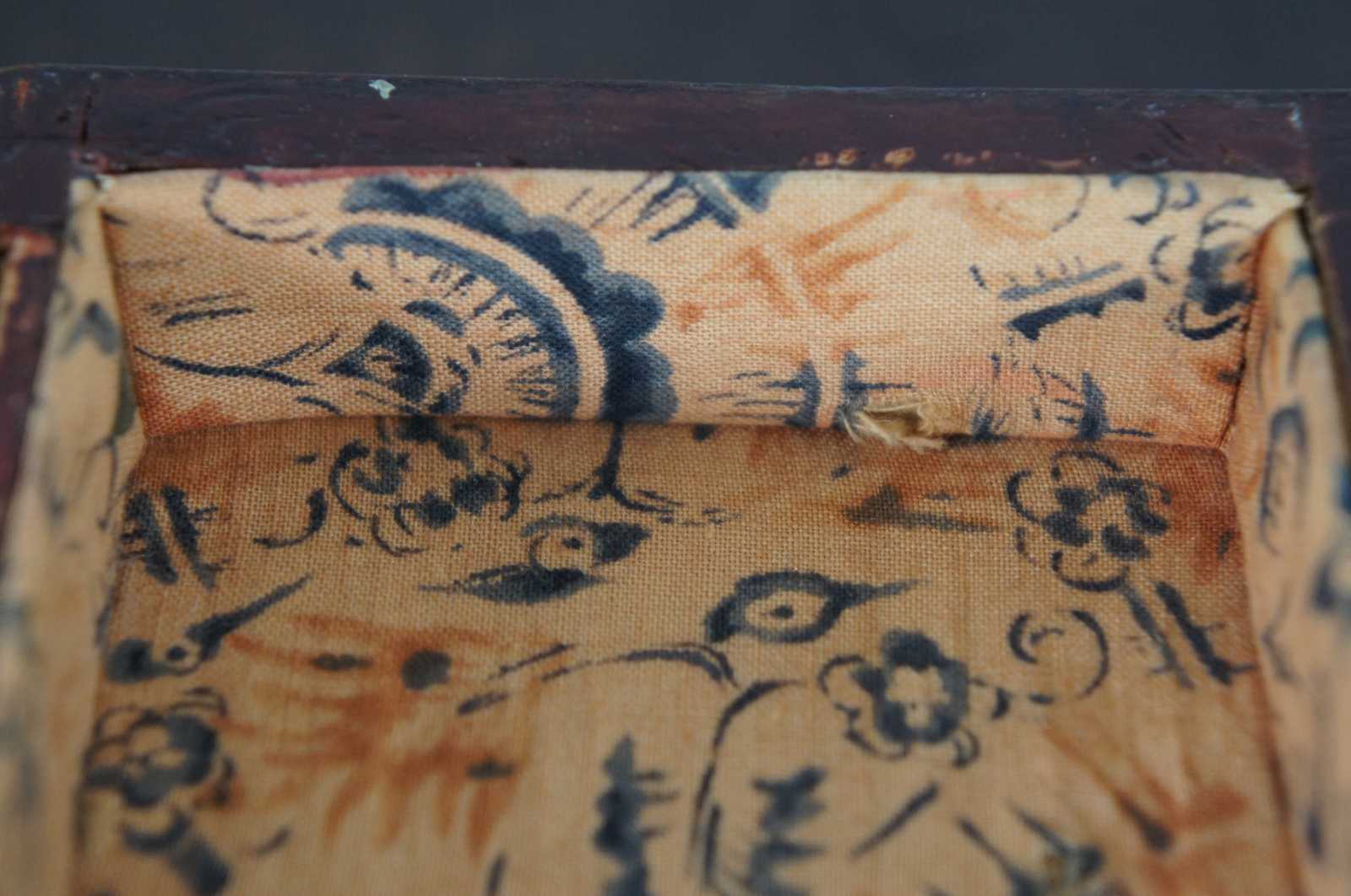 Antique mahogany trinket box with a half domed lid, decorative lock, and lined in floral cloth.