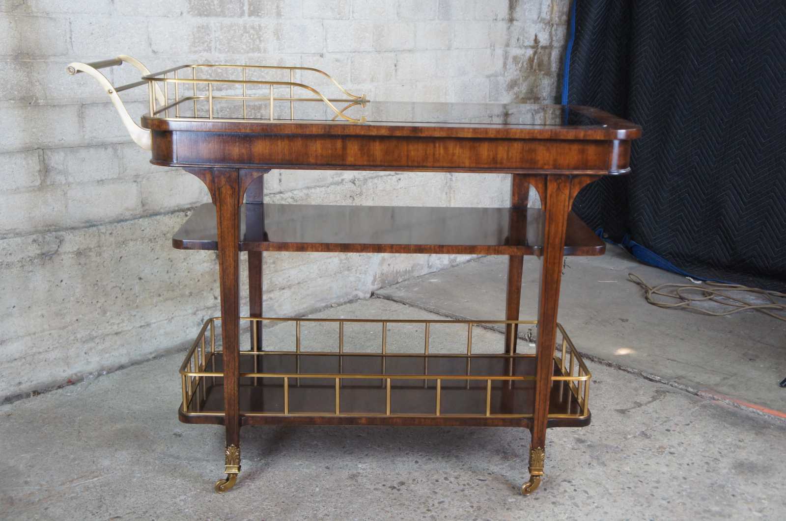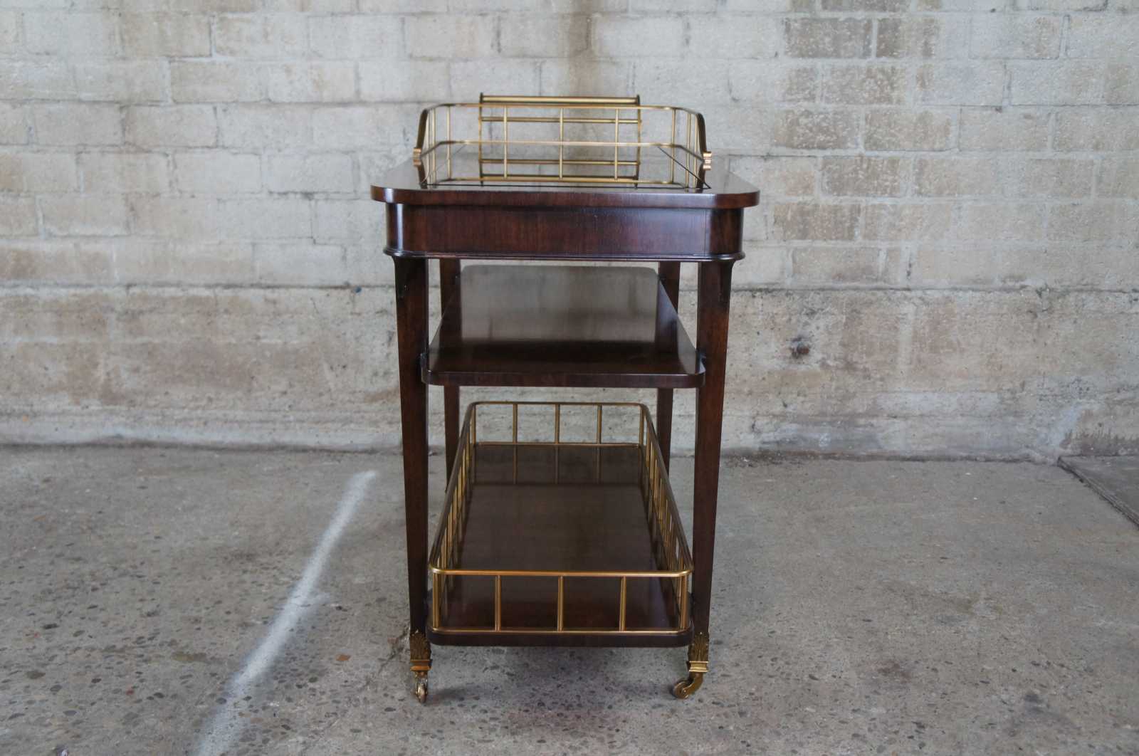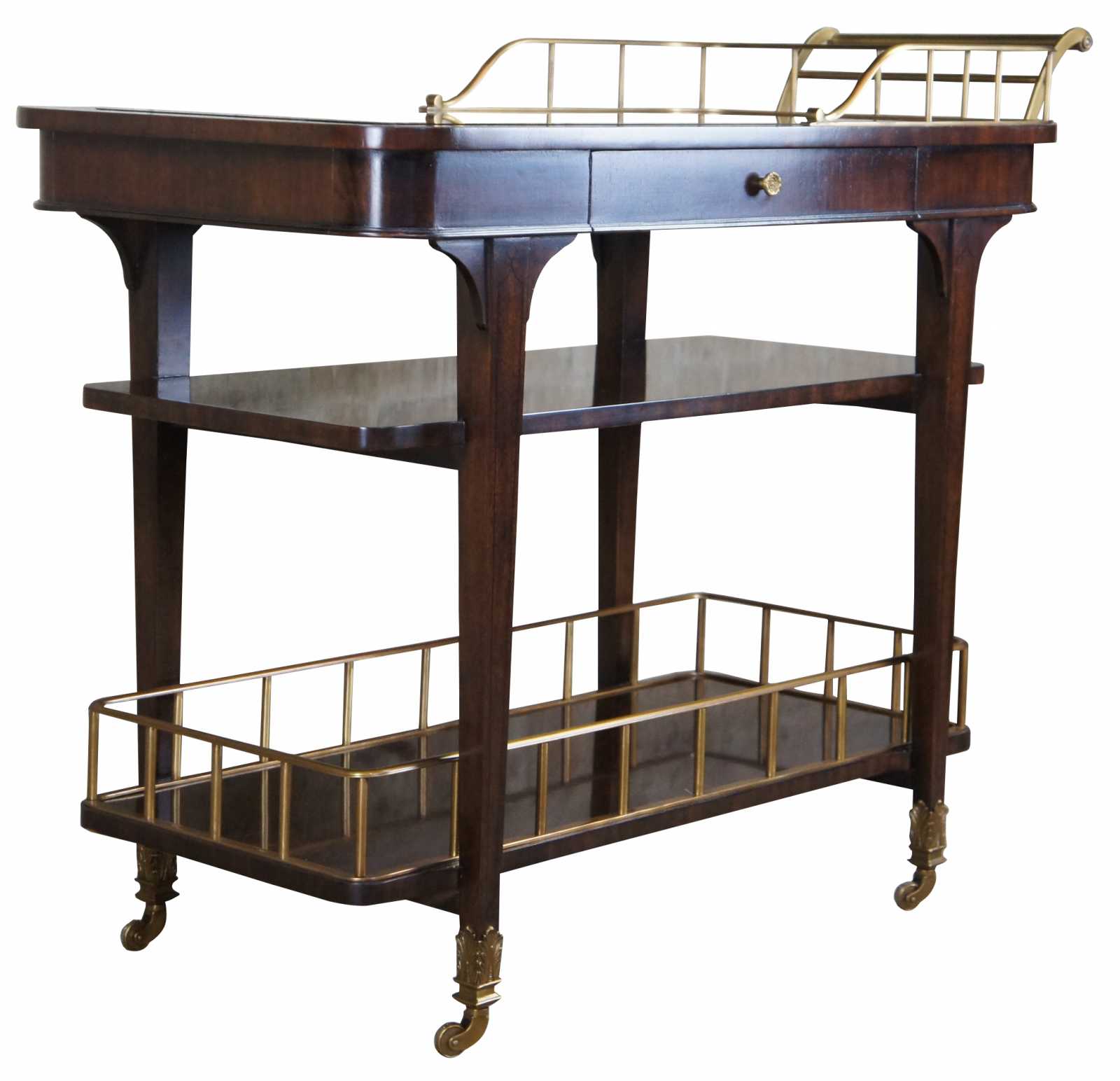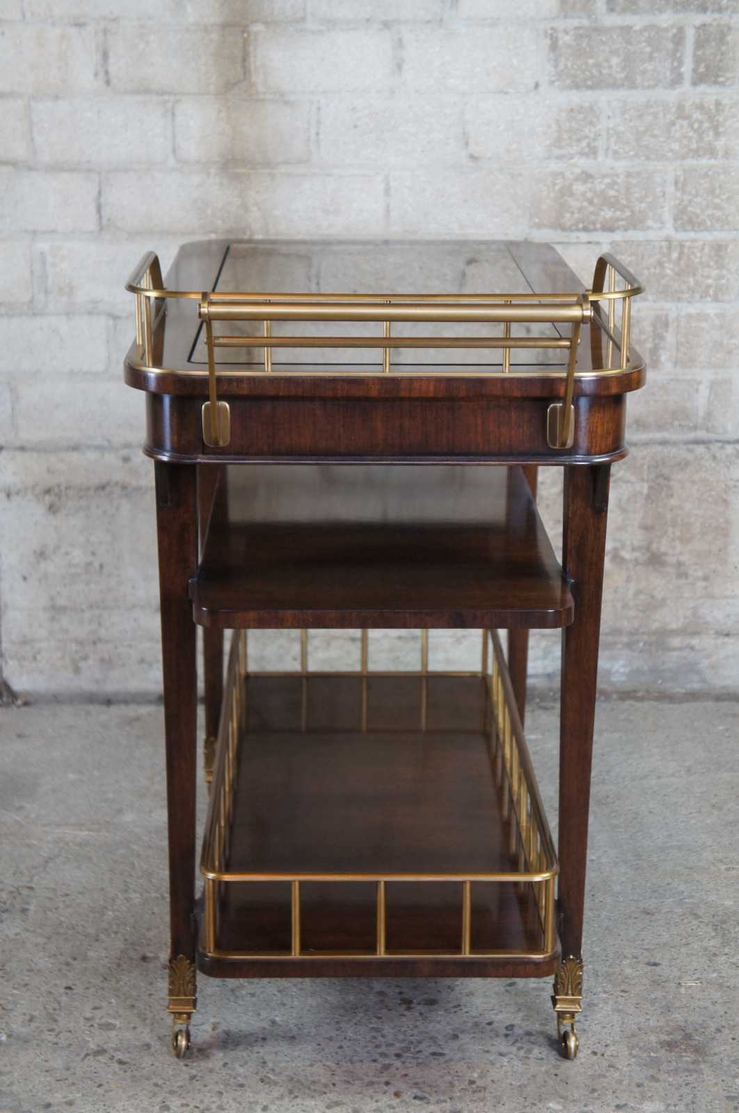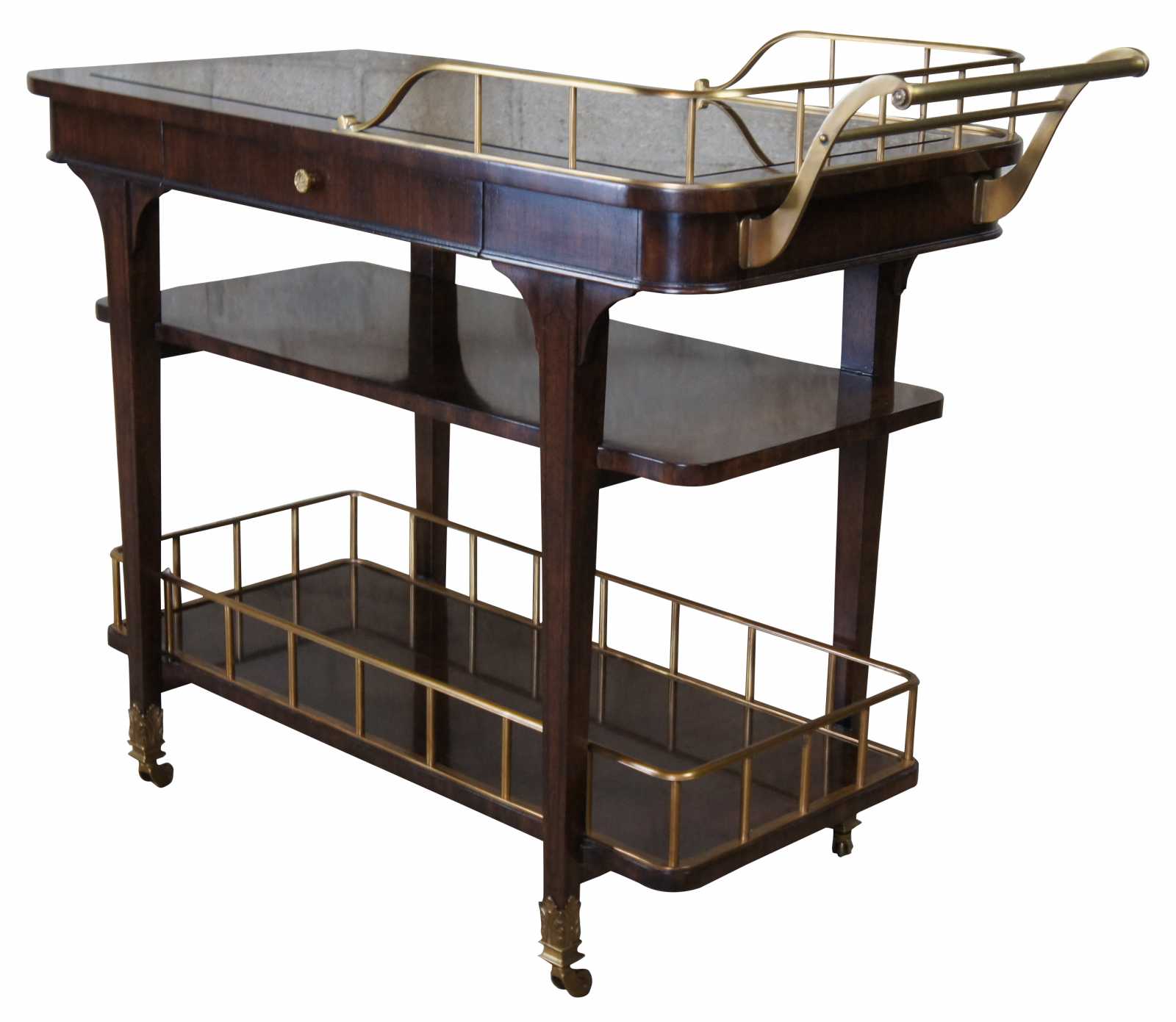 2014 three tier Henredon Furniture bar cart. Made from premium Mahoni and Gemelina wood, and Walnut veneers; and featuring brass galleries, mirrored top, lined accessories drawer, and swivel castors.