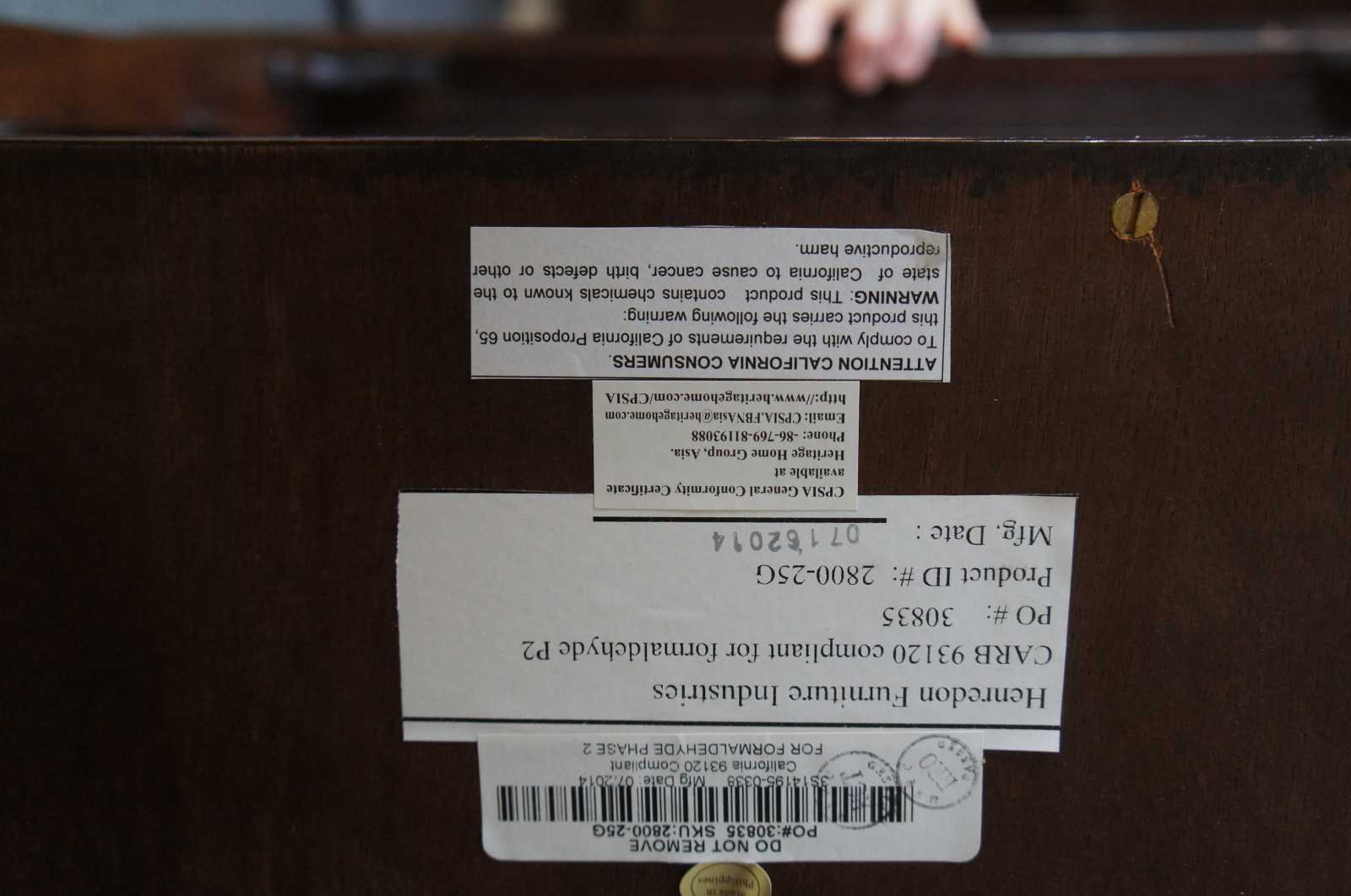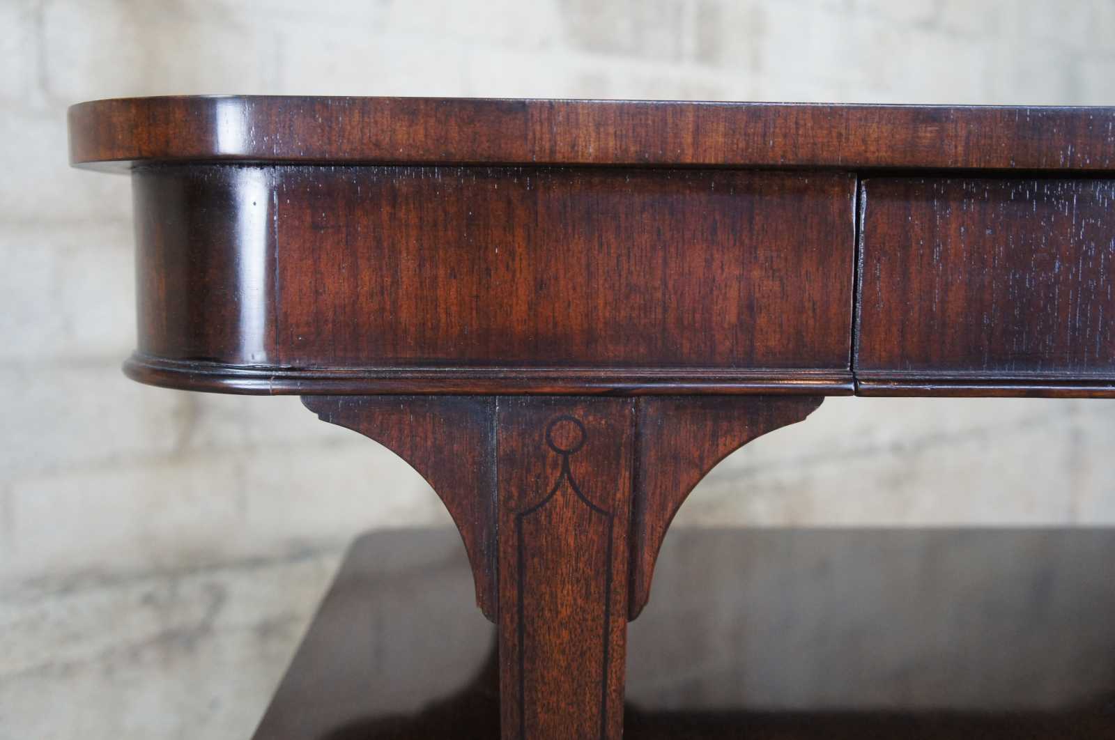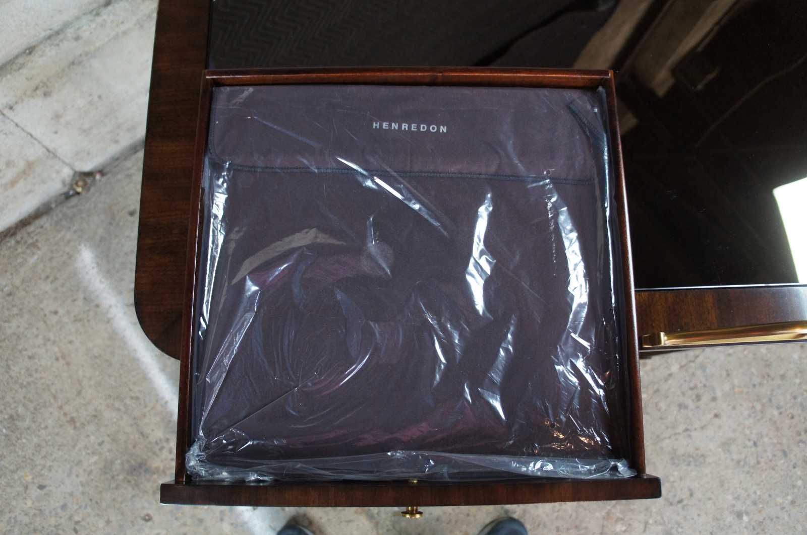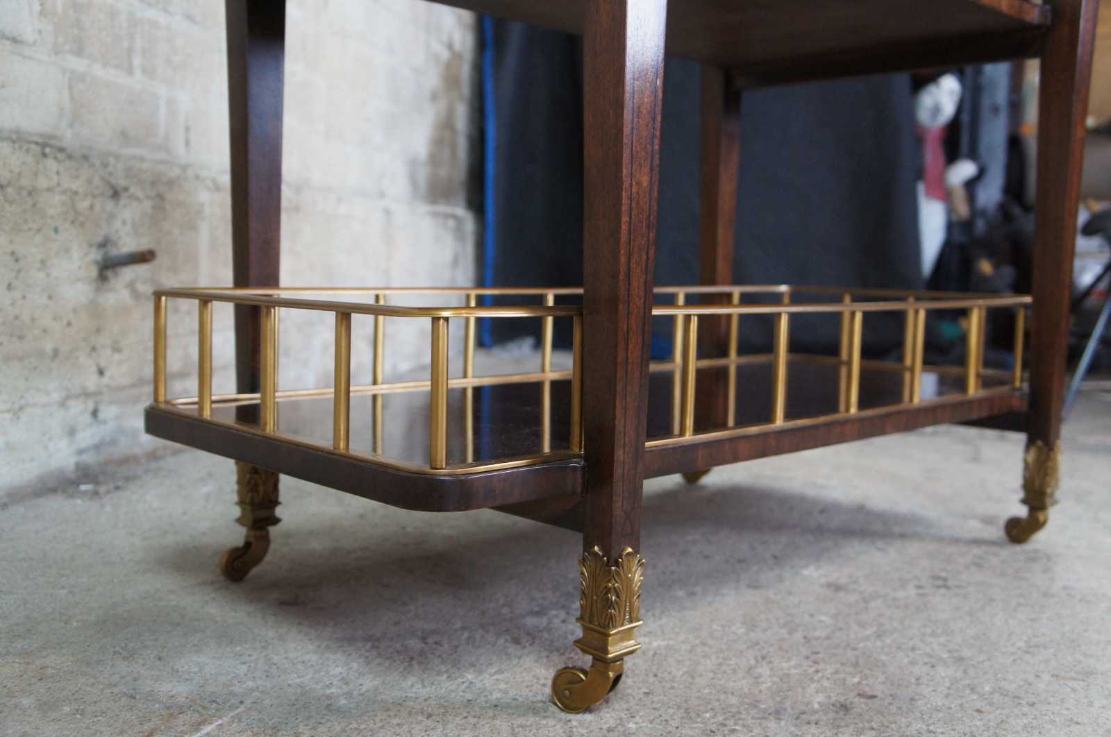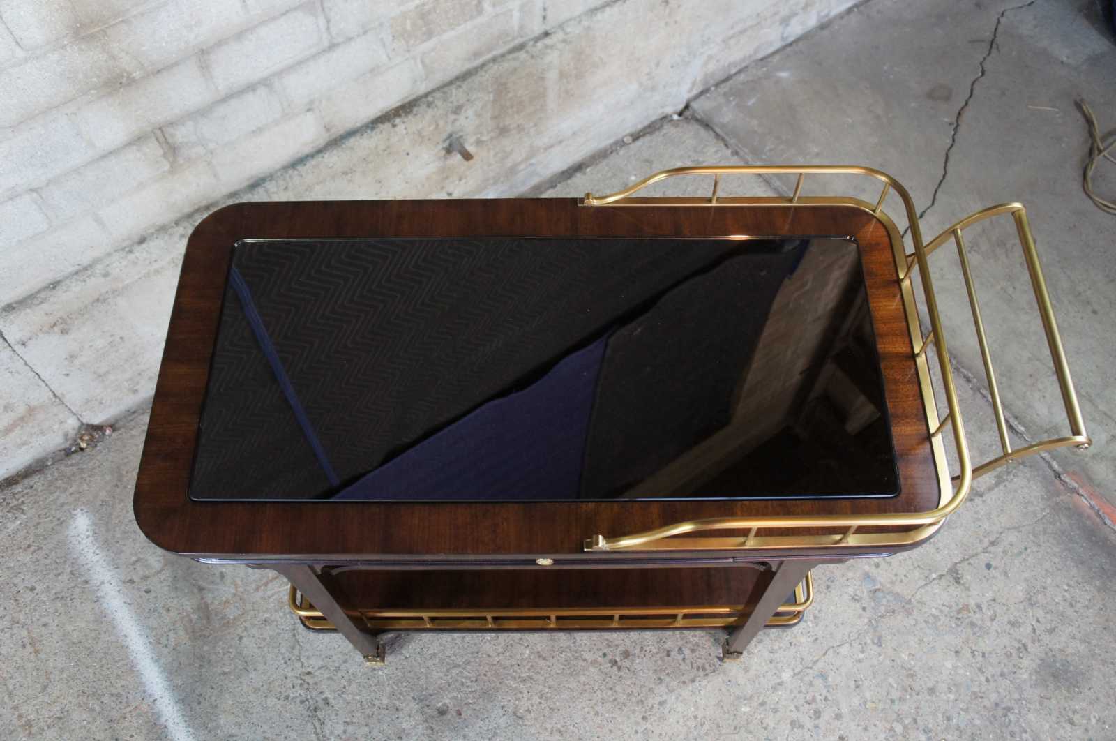 2014 three tier Henredon Furniture bar cart. Made from premium Mahoni and Gemelina wood, and Walnut veneers; and featuring brass galleries, mirrored top, lined accessories drawer, and swivel castors.