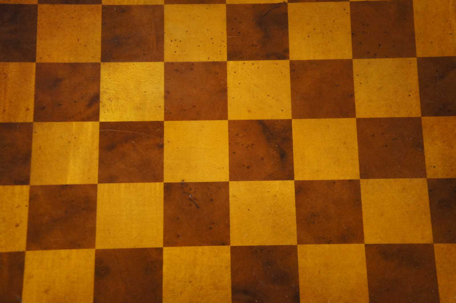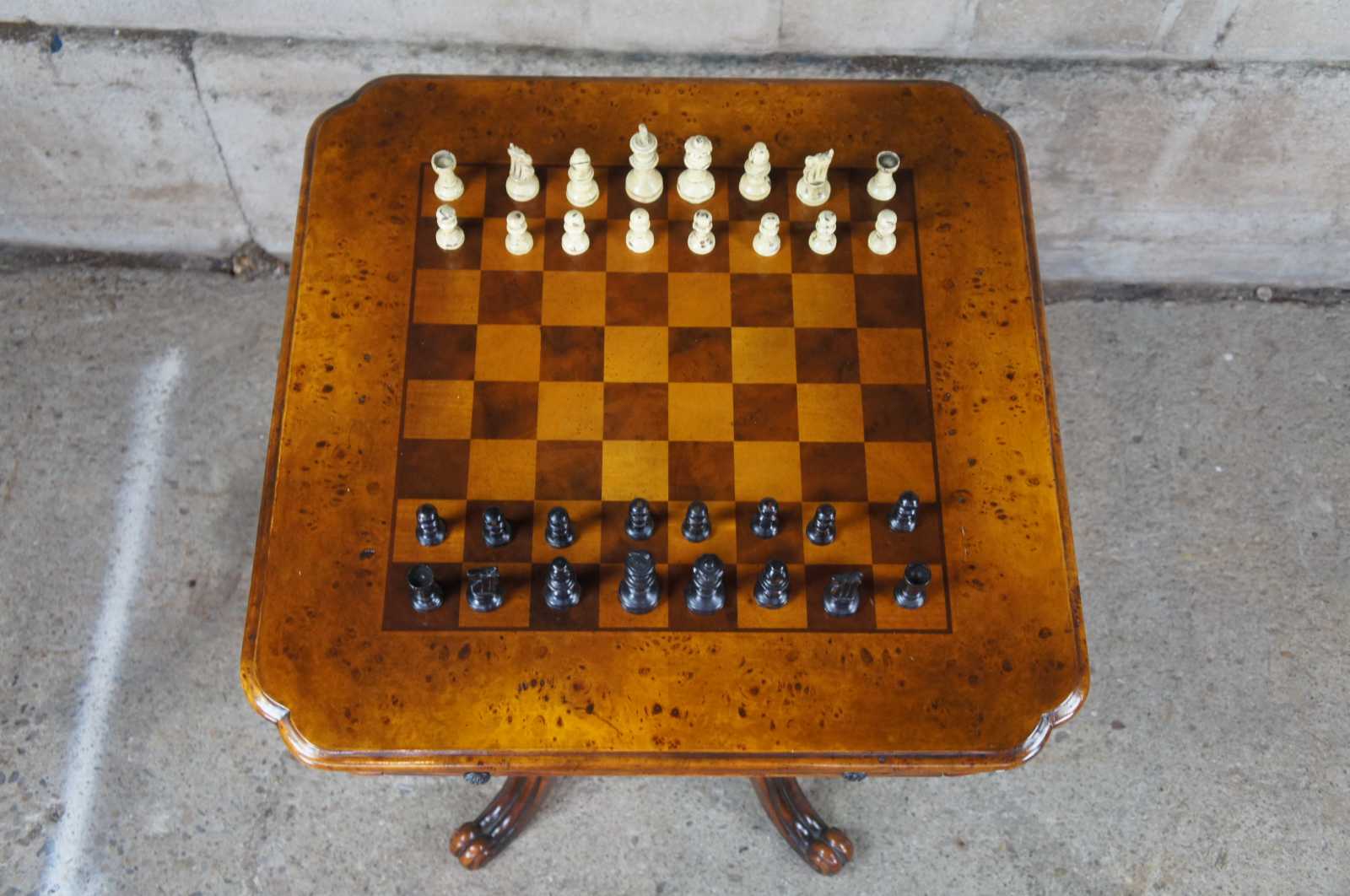 Vintage Theodore Alexander chess, checkers or game table. Made of olive burl featuring a barley twisted central pedestal and two drawers for piece storage.